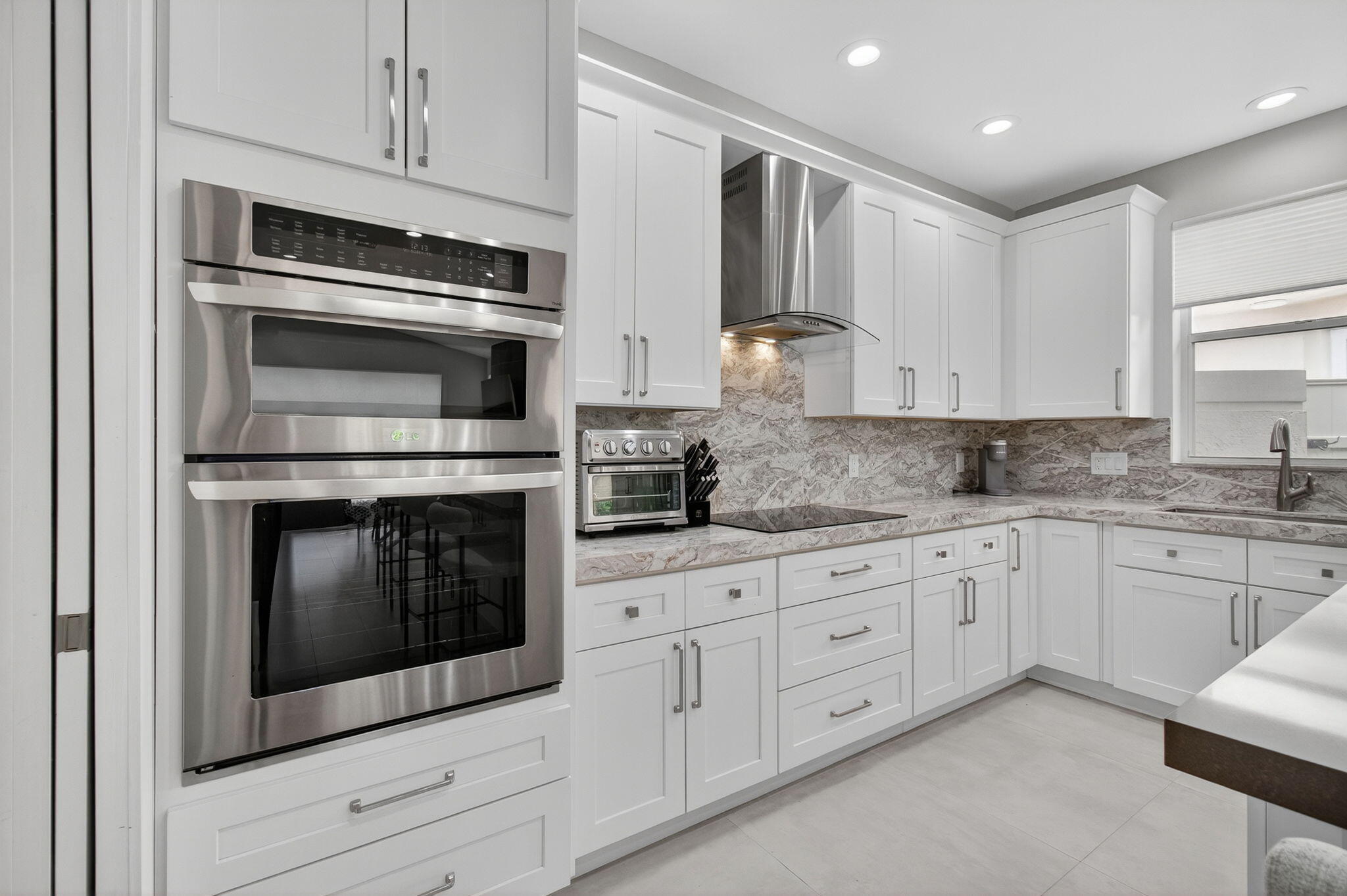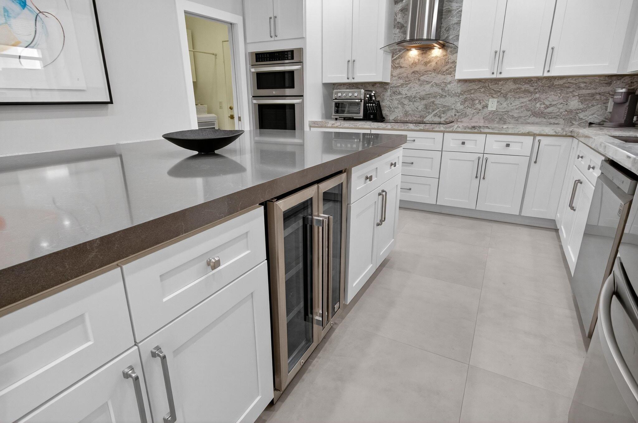 Discover this beautifully renovated single-story 3-bedroom, 3-bath home in the highly sought-after village of Laurel Pointe in Broken Sound Country Club. Designed with modern elegance, this residence features smooth walls, porcelain tile floors, and vaulted ceilings throughout. The open-concept kitchen and living room create a welcoming space for everyday living and entertaining. The kitchen showcases white cabinetry, a spacious center island with abundant storage, and a built-in beverage cooler. Retreat to the primary suite, complete with vaulted ceilings, a large walk-in closet, and a luxurious en suite bath featuring a large skylight, free-standing soaking tub, and frameless glass shower. Two additional bedrooms and baths offer comfort and privacy for family or guests. Step