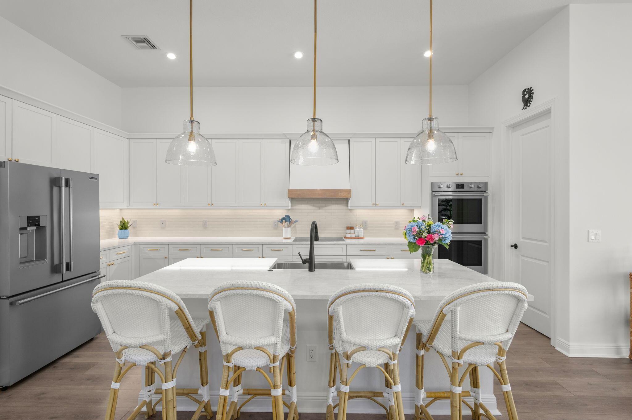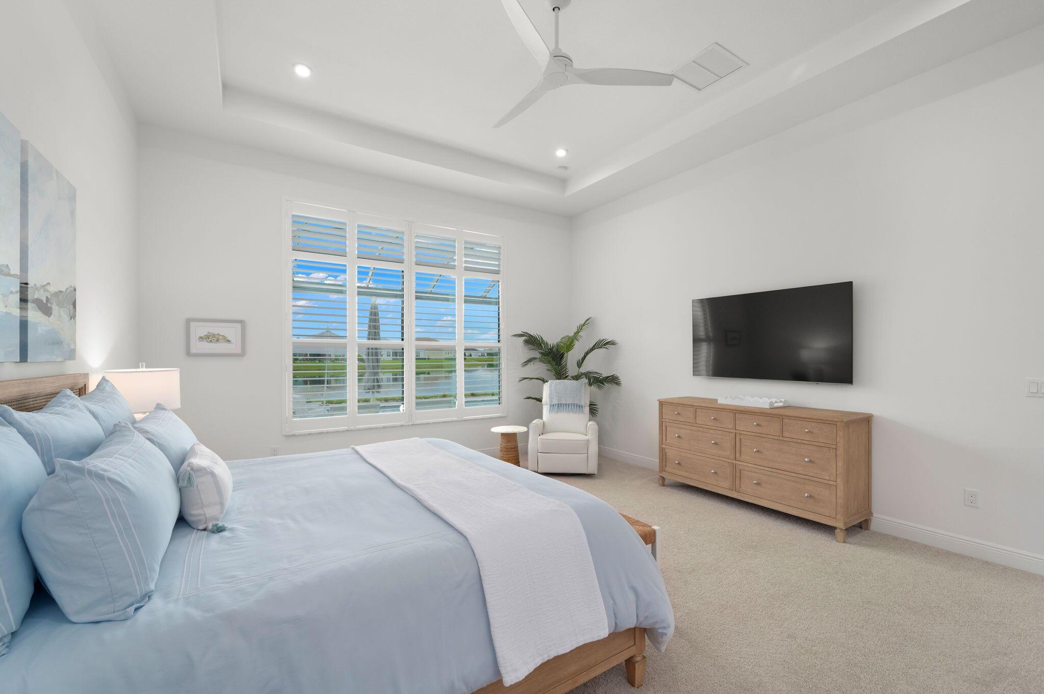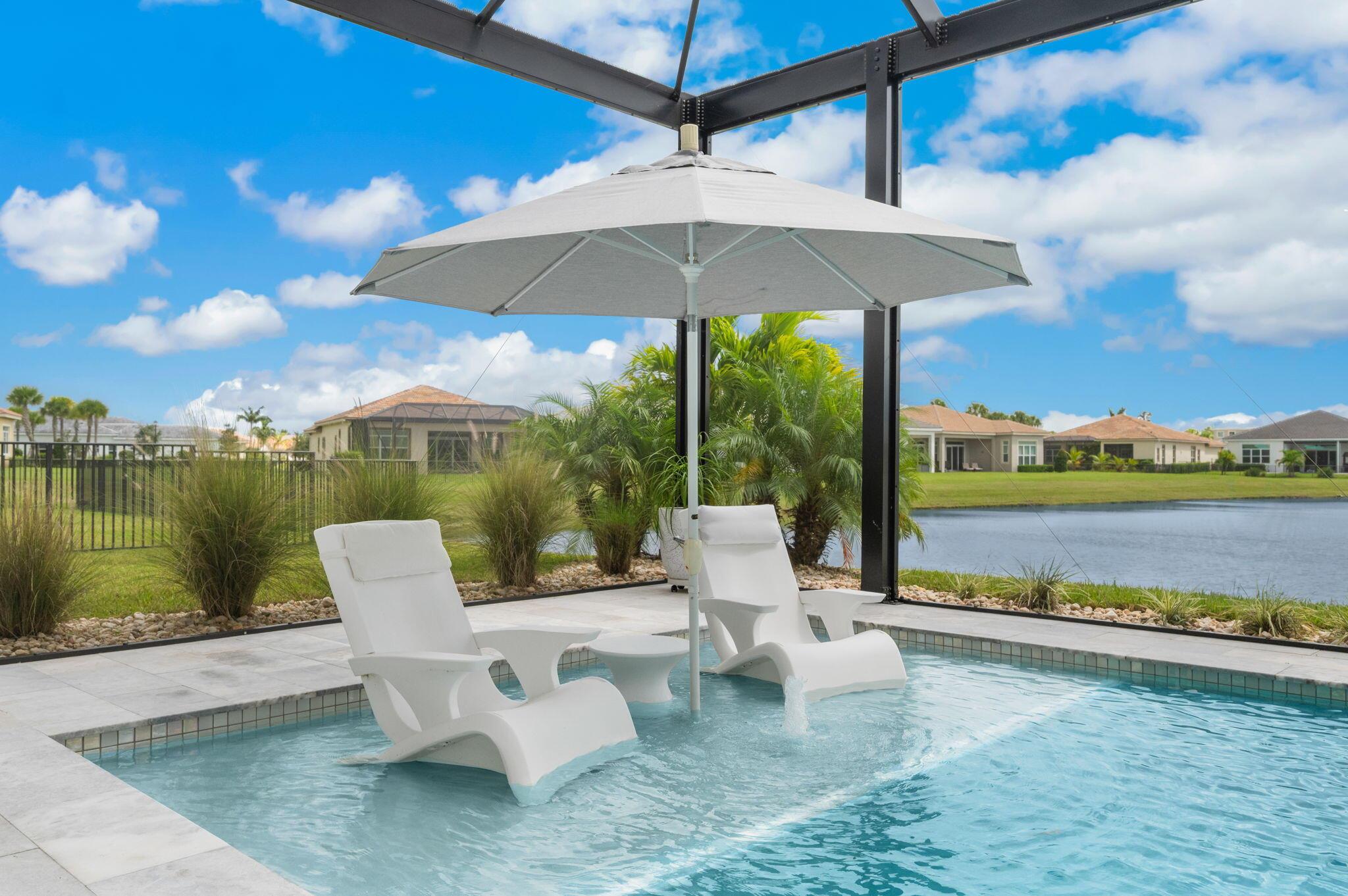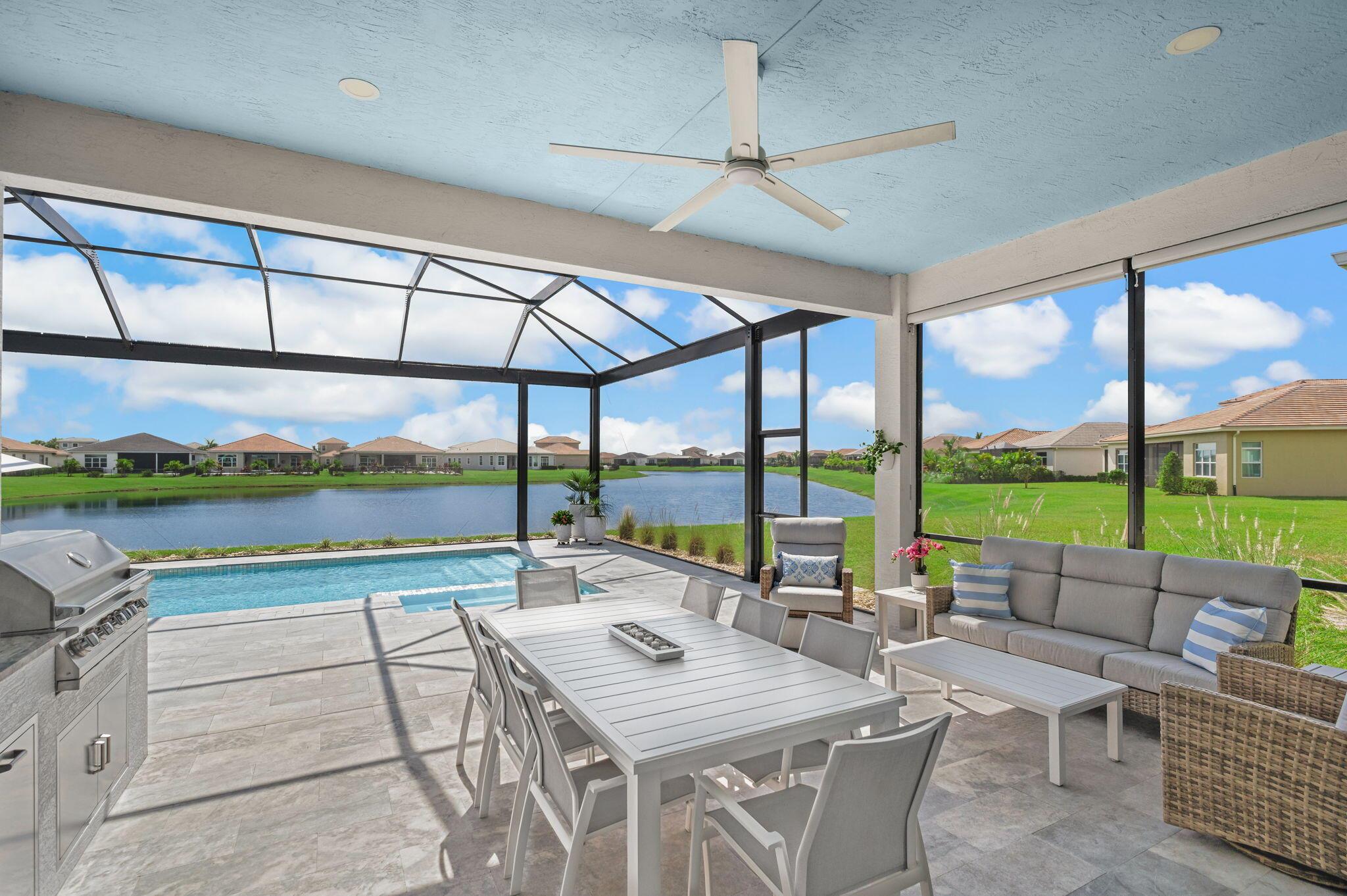 Stunning upgraded Madison model with sweeping lake views in PGA Verano. This meticulously maintained 3 bedroom, 3 bath pool home is designed for entertaining and everyday enjoyment. The chefs kitchen impresses with quartz countertops, oversized island, custom wood hood, double oven, abundant cabinetry, and a walk-in pantry with dual-zone wine fridge. The light-filled living area features high ceilings and wood flooring, seamlessly connecting the dining and family areas, anchored by a fireplace wall and 12-foot sliding doors that open to the outdoor retreat. Step onto the expansive marble pool deck and take in the serene, panoramic long-range lake view. The covered lanai boasts a 42'' BBQ grill, built-in fridge and leathered granite countertop,