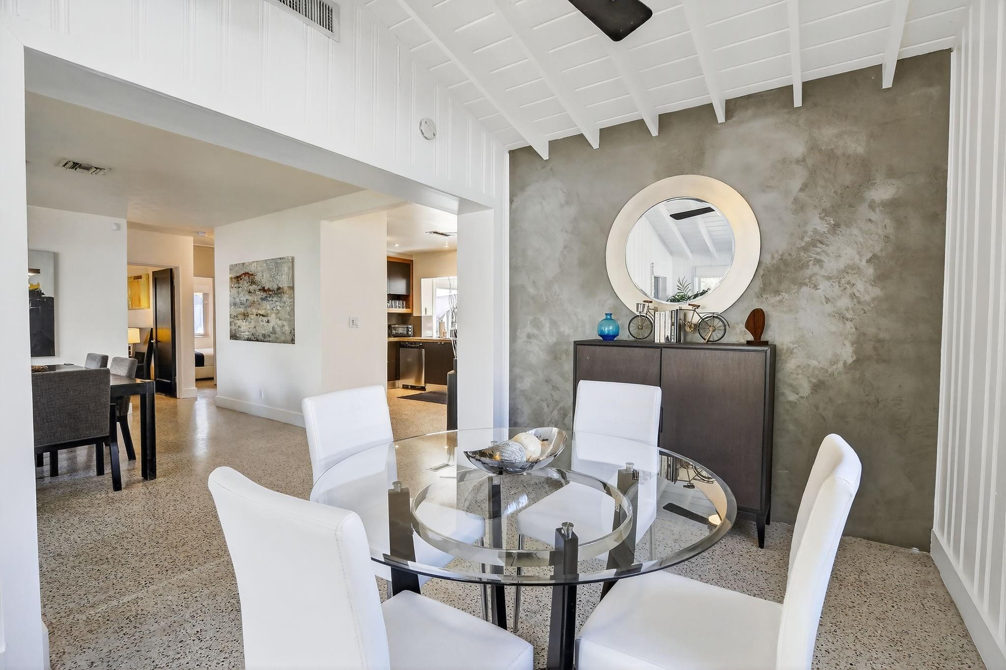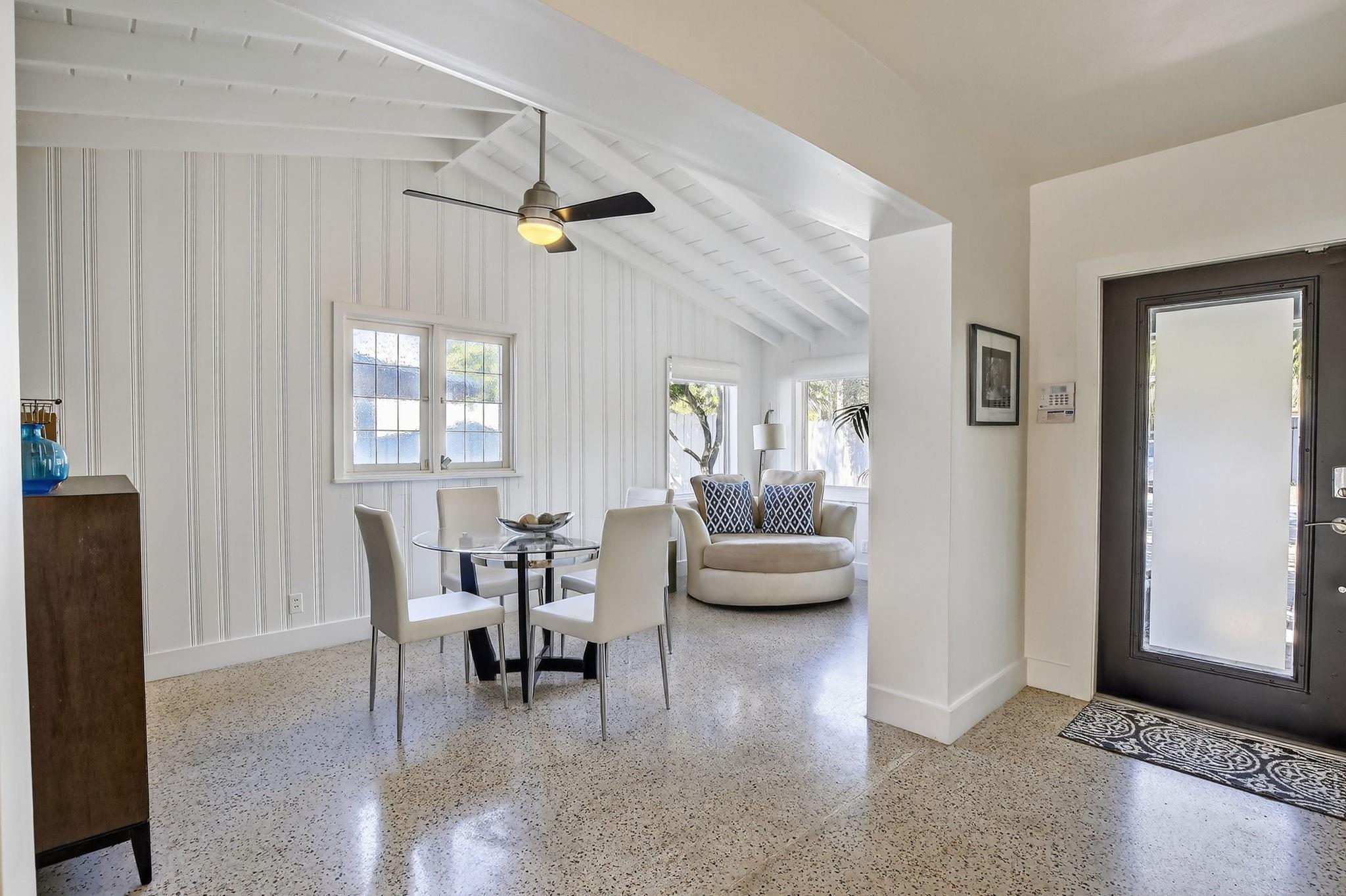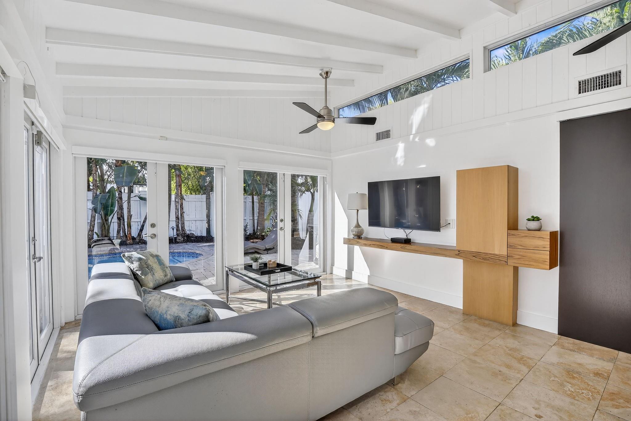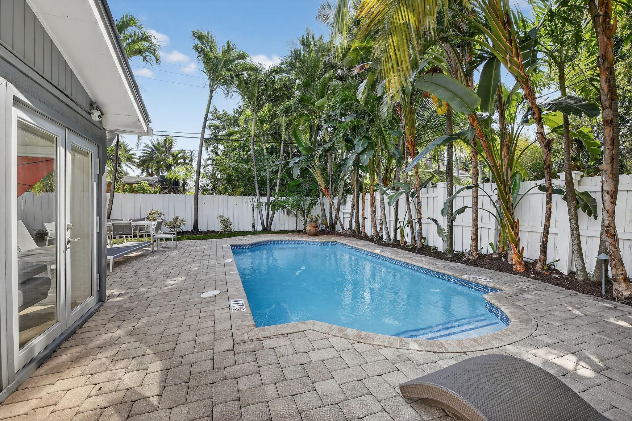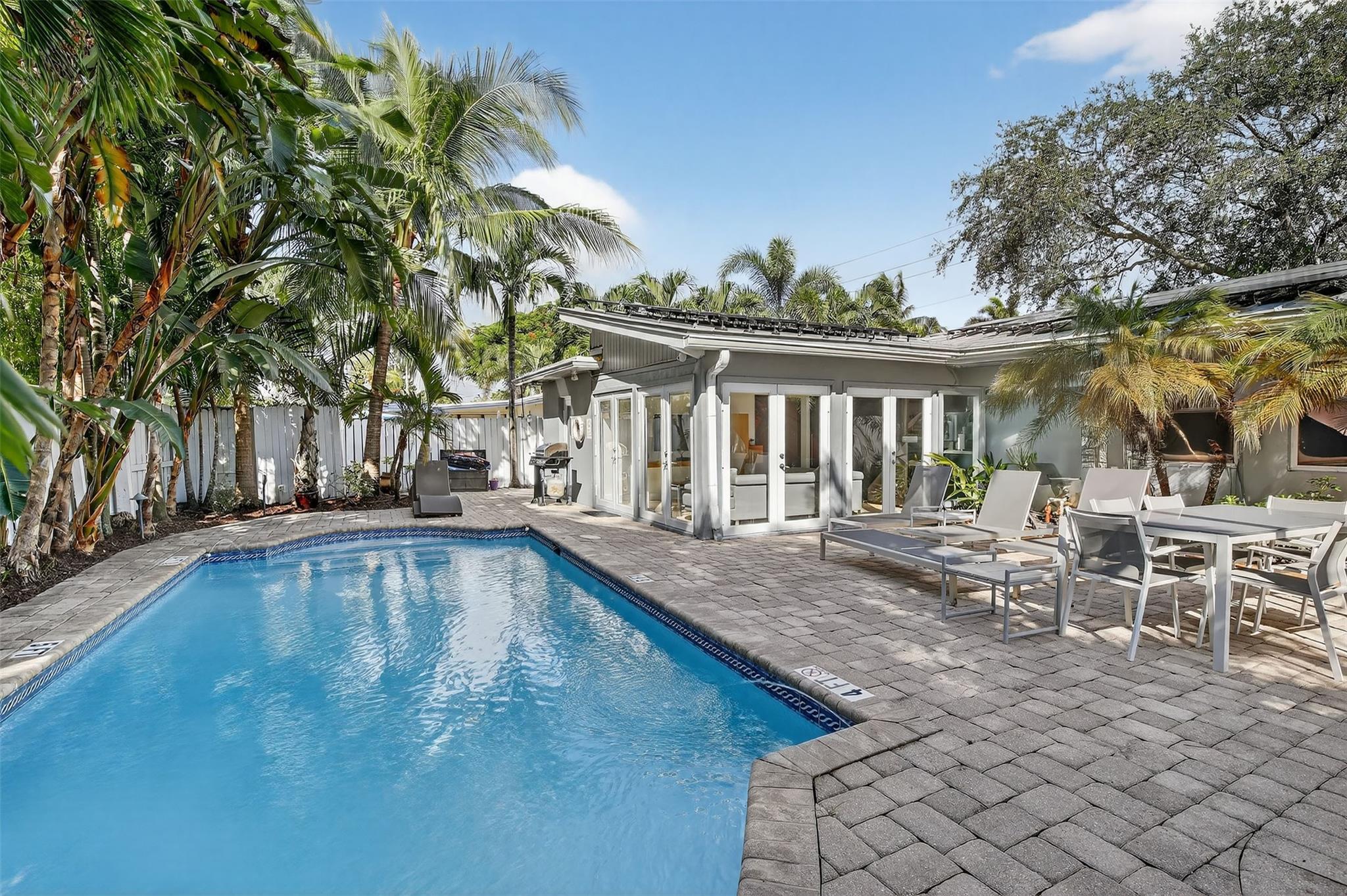 This stylish 3BR/2BA home blends comfort, charm, and modern convenience. Recent upgrades include a metal roof (2022), fully paid-off solar panels (2022), updated electrical (2022), and a resurfaced pool (2022). Bright open layout with vaulted ceilings and French doors creates seamless indoor-outdoor flow to a lush backyard oasis. Features impact windows & doors, two A/C units (one 2022), gas cooking, new attic insulation (2025), and hard-wired detectors. Offered turn-key, furniture negotiable!