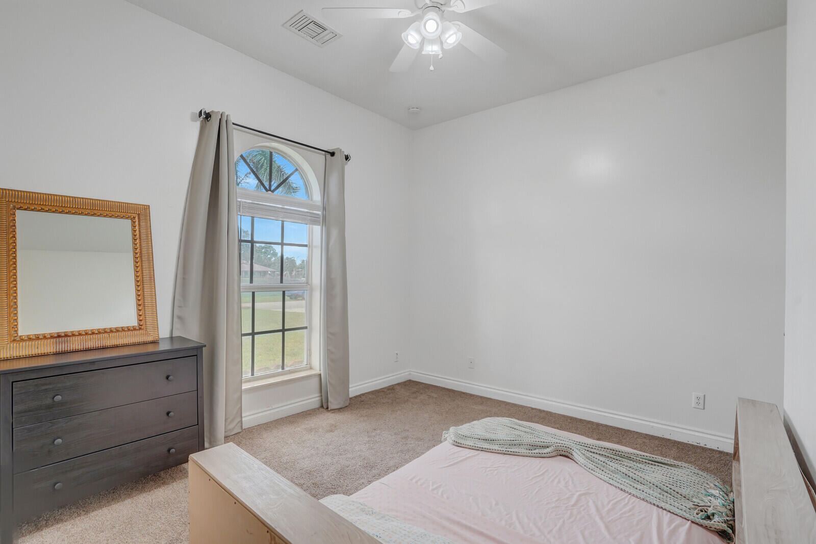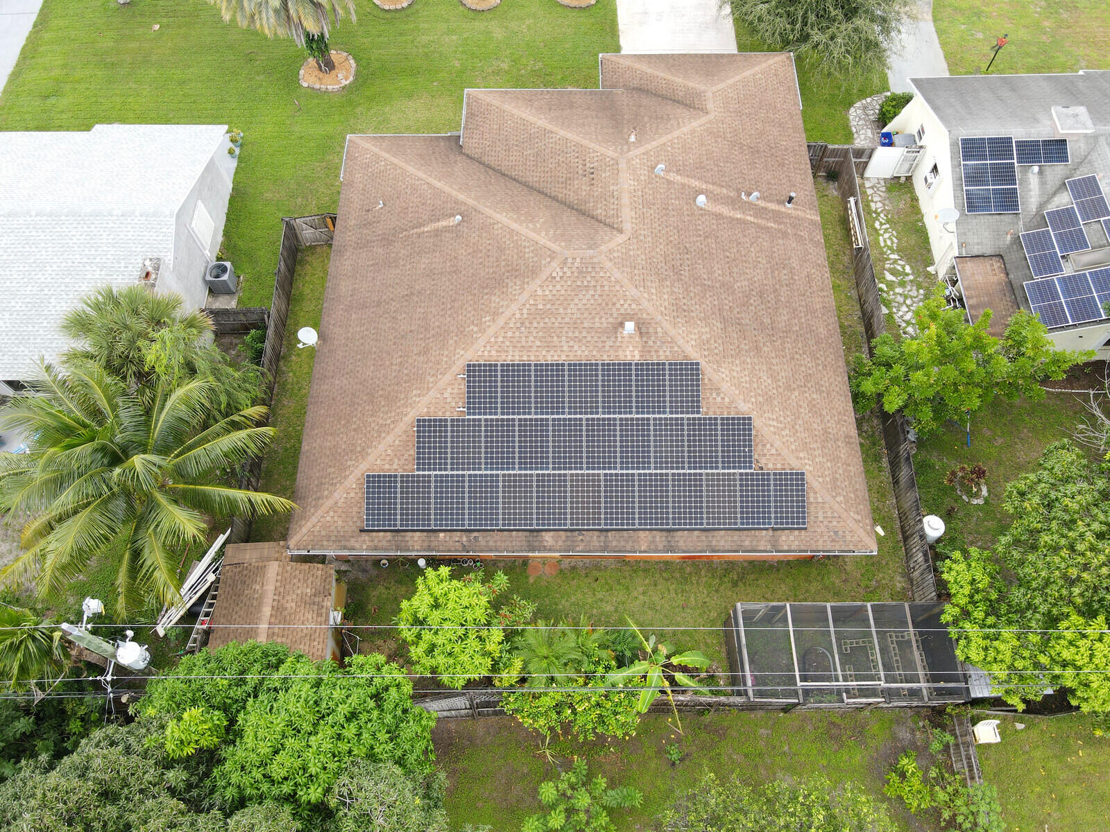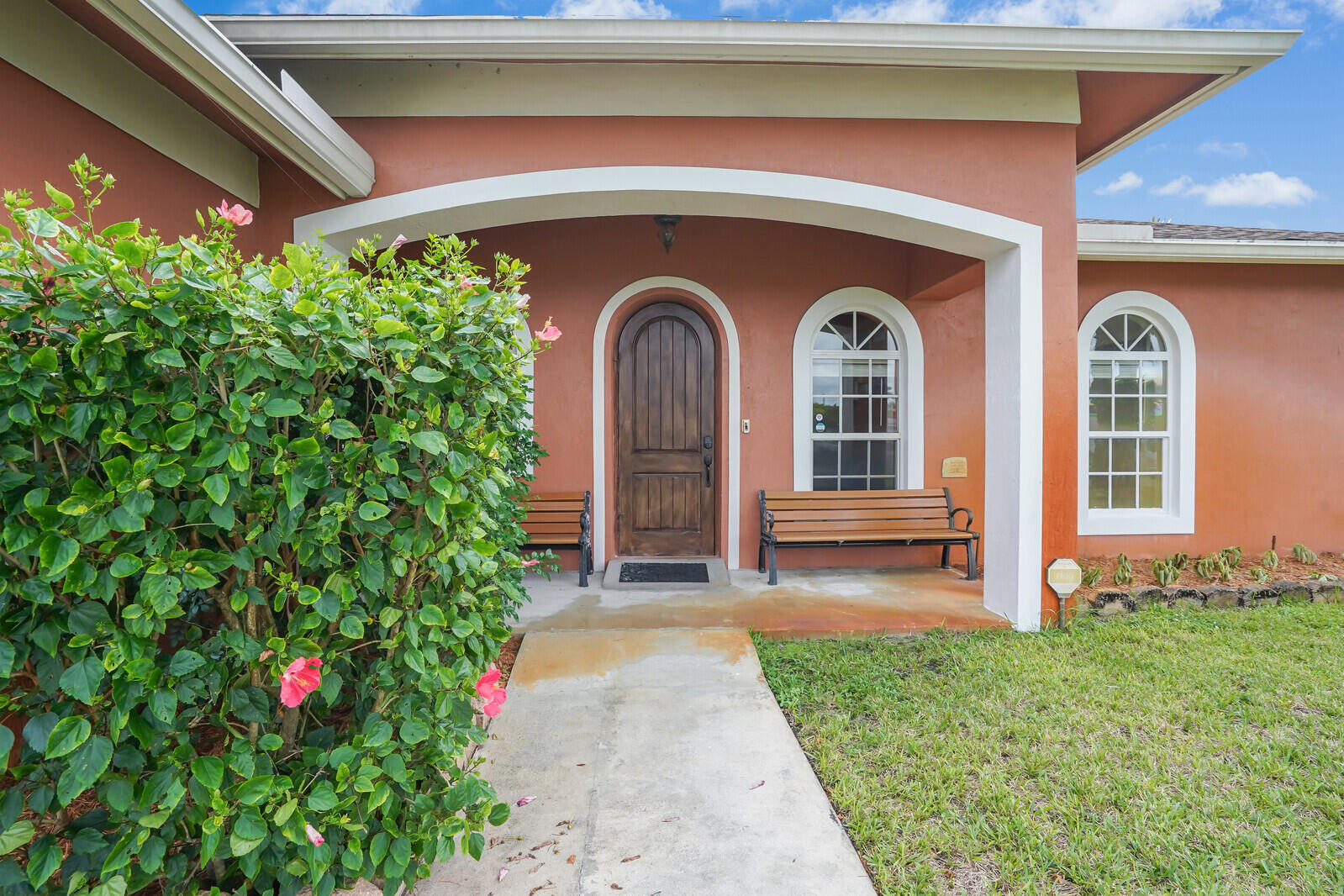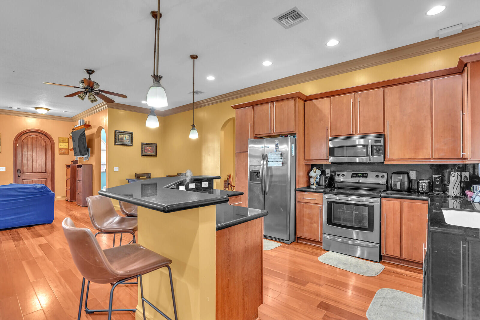 This charming 3-bedroom, 2.5-bath single-family home with a dedicated office space was built in 2007 and offers over 2,200 square feet of comfortable living. It features a desirable split floorplan, eco-friendly solar panels, impact windows, and no HOA restrictions. Inside, the home showcases 10-foot ceilings, granite countertops, stainless steel appliances, elegant crown molding, and tile flooring throughout. The spacious primary suite (22x20 ft) includes two walk-in closets and a luxurious en-suite bathroom with dual sinks, a separate tub, and a separate shower. An additional half bath and a dedicated office add convenience and flexibility for working from home or hosting guests. Outside, you'll find a large yard with fruit trees, a screened-in back porch perfect for relaxing,