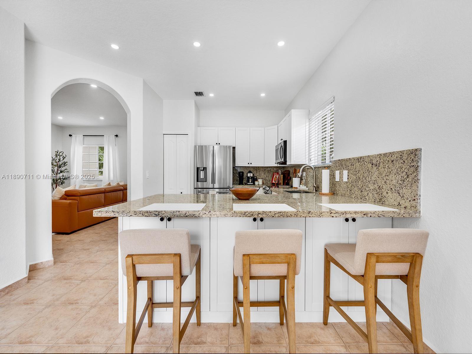 Beautiful single-family home in immaculate condition, located in the highly desirable Town of Miami Lakes. This property features 3 bedrooms and 2 bathrooms, including a spacious master suite with a custom walk-in closet. The renovated kitchen boasts a built-in pantry, new stainless-steel appliances, and granite countertops with an ample seating area — perfect for entertaining. Enjoy a spacious backyard with a countertop/bar ideal for gatherings. The home offers tile flooring, built-in closets throughout. The garage includes washer and dryer hookups and offers enough space for storage or a potential at-home gym. The large circular driveway provides plenty of parking, and no HOA fees. Excellent location near Royal Oaks Park, minutes from major highways, shopping, and restaurant.