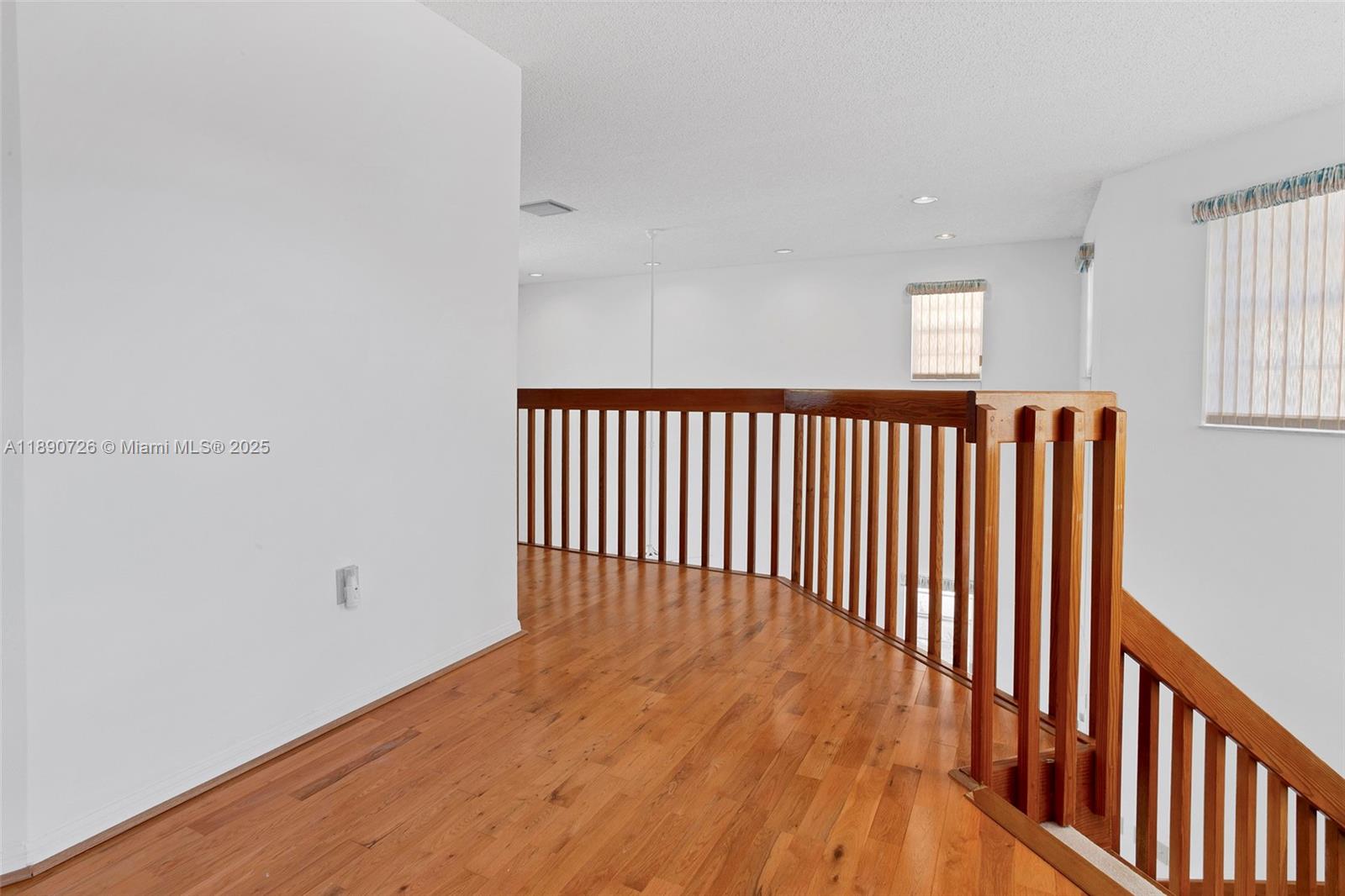 Step through the front door into a soaring, voluminous ceiling and grand arched window that invites natural light to pour in, creating an instant sense of spaciousness. French doors and sliders open to a private pool and patio - ideal for entertaining. Storage abounds: 2 walk-in closets in two bedrooms and 1 wall-to-wall closet in the third. The primary suite has a private balcony. Additional features include a laundry room with a sink, a 2-car garage, a Roman tub, wood floors in the upstairs & living room, and hurricane shutters for all windows & doors, including the garage. All on a quiet street with friendly neighbors in a family-friendly community. Great schools, restaurants & shopping nearby.