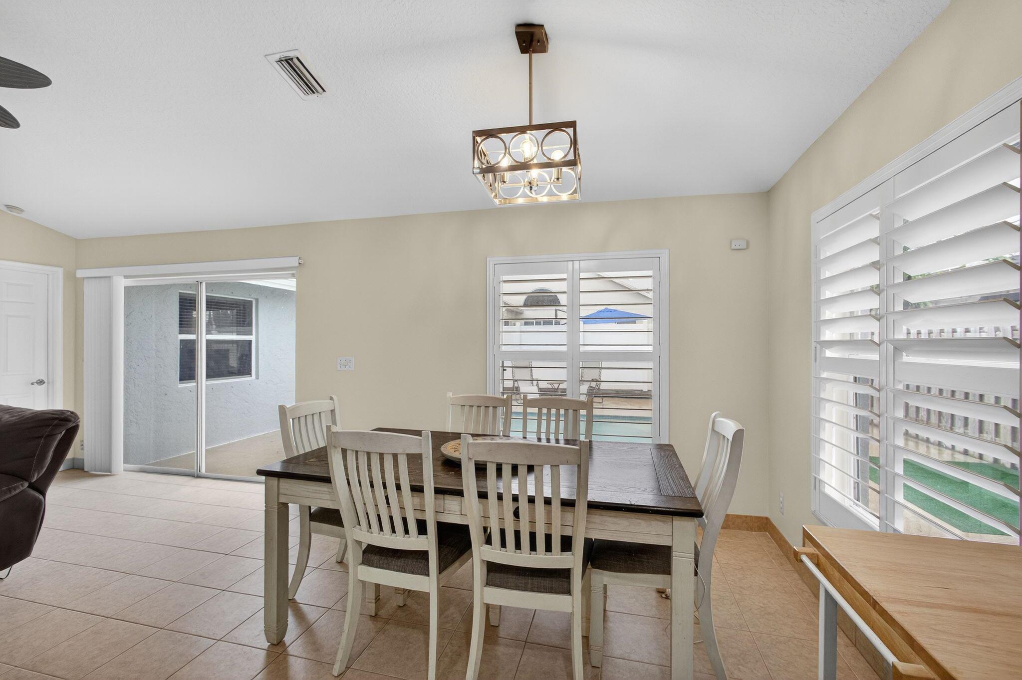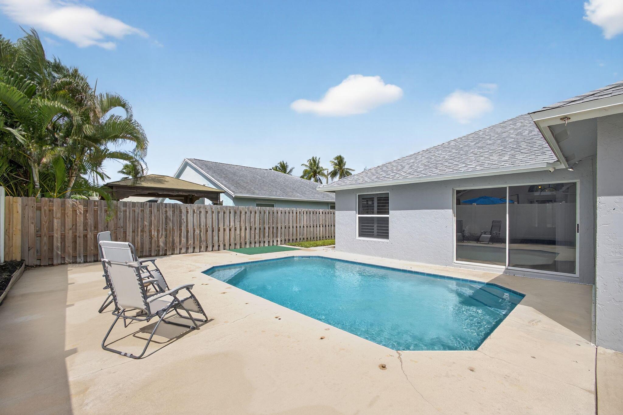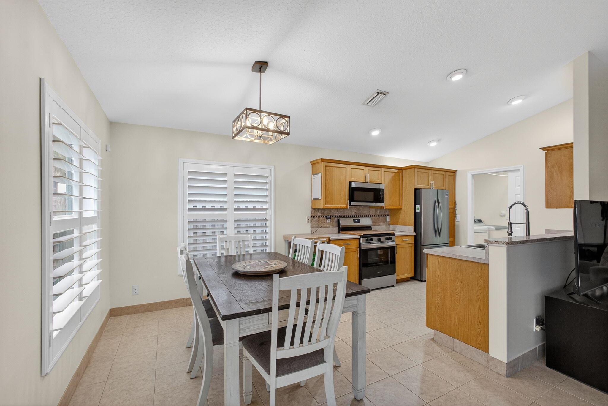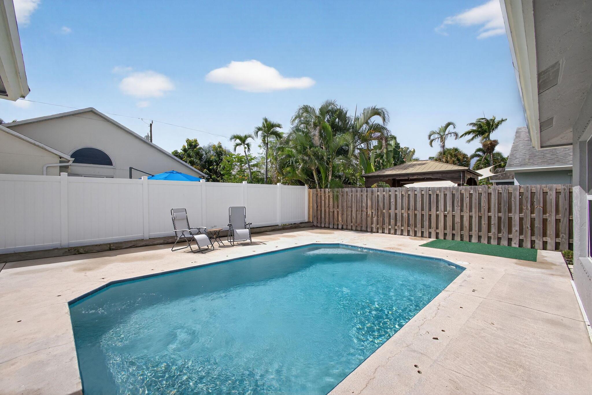 Welcome to this beautifully maintained pool home in the heart of Jupiter's sought-after North Palm Beach Heights!This 3-bedroom, 2-bath single-story home blends comfort, convenience, and classic Florida living. Step through the covered entry and into a bright, open floor plan where natural light flows across tile flooring throughout. The spacious living and dining areas feature vaulted ceilings and plantation shutters, creating an inviting atmosphere ideal for relaxing or entertaining.The kitchen sits at the center of it all -- equipped with stainless steel appliances, plenty of cabinet storage, and a long breakfast bar overlooking the living area, perfect for gathering with friends and family. The primary suite offers a quiet retreat