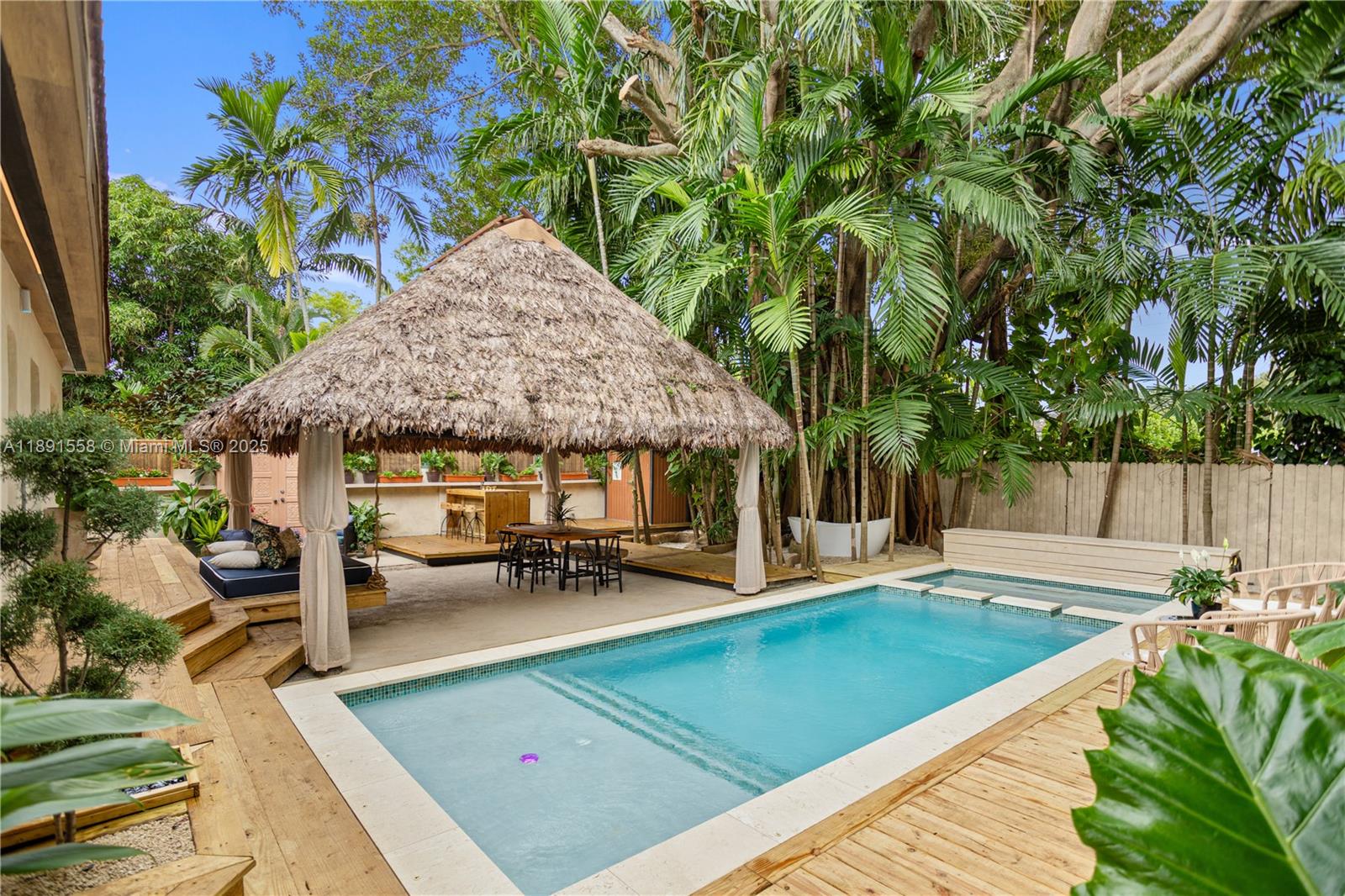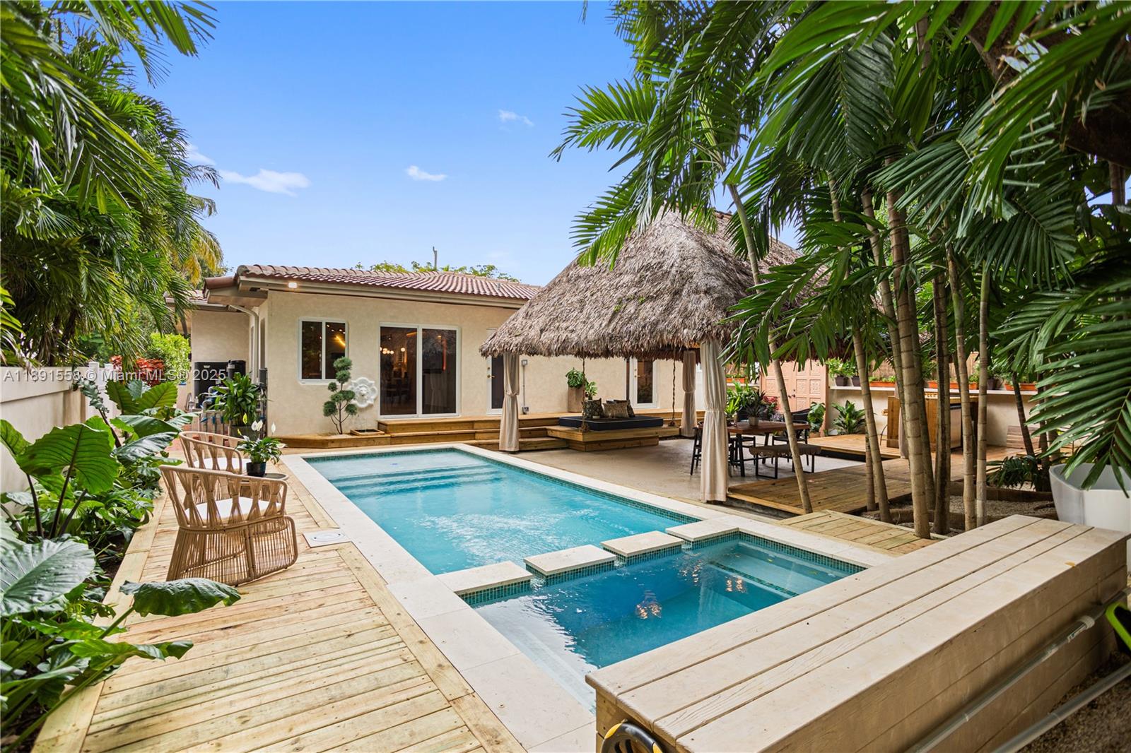 Escape the fast pace of Miami in this Bali-inspired tropical retreat located in Shorecrest, just minutes from Miami Shores and North Bayshore Park. Featuring a new pool with deck, in-ground jacuzzi, outdoor cold plunge & soaking tub under the palms, Tiki lounge area, and zoning for short-term rentals. This fully renovated 3-bed, 3-bath home features one suite with a private entrance and bathroom, plus a spacious den that can easily be converted into another bedroom. The property has all-new plumbing, electrical, ceilings, and walls, as well as impact doors and windows — all with closed permits. Enjoy low Miami-Dade taxes, serene outdoor spaces, and the perfect blend of design, comfort, and investment potential. Furniture and decoration shown in photos available separately.