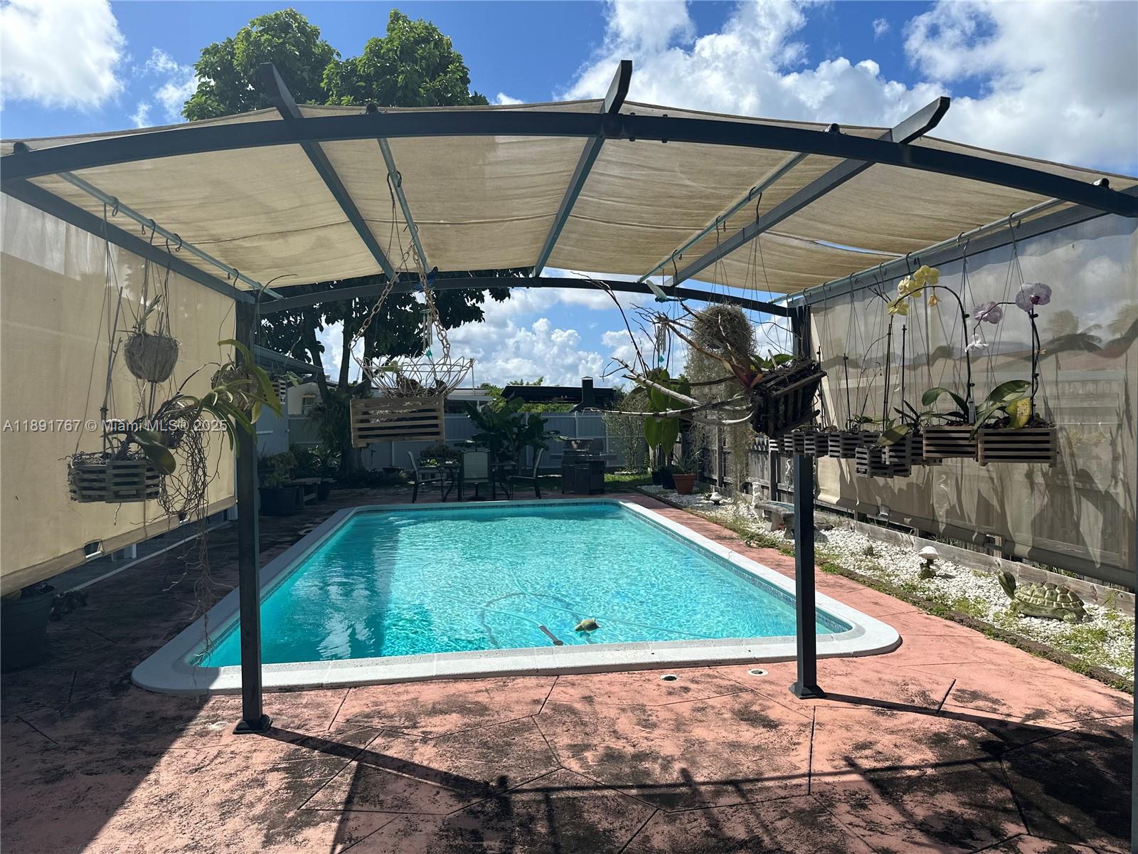 EXCELLENT Opportunity - PRICED TO SELL FAST. NO HOA. This home comes Equipped with Home Theatre system completely wired for speakers and Monitor, CCTV 16 cameras plus monitor with 3 months of rewritable storage. Large Olympic size pool home with 3 bedrooms 2 baths Family room and large Living room on a huge lot 75X100. The spacious fully fenced includes Gazebo and outdoor furniture. New roof Shingle, plus new attic insulation for comfort and efficient utility. Accordion shutters on main Entrance and large Patio opening. All openings have hurricane rated wood panels. Includes an explosion proof Diebold Co. Safe.