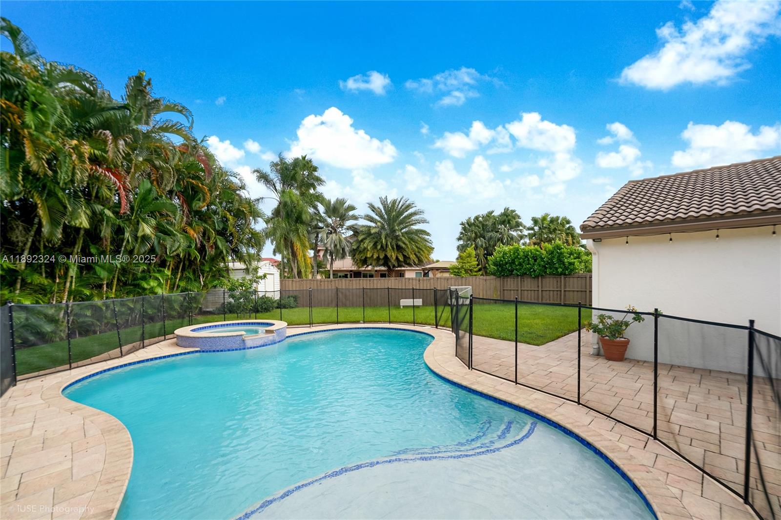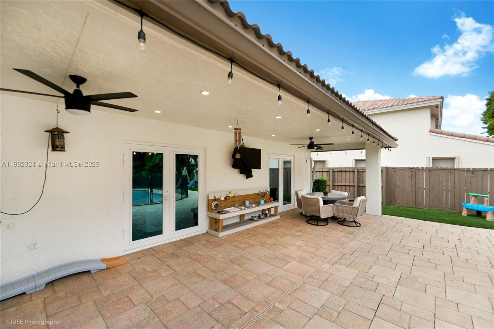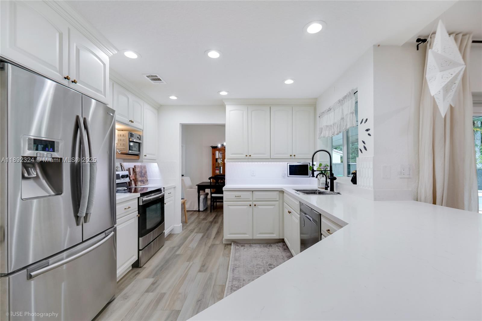 This exceptional home offers style, comfort, and efficiency throughout. Features include tile flooring, quartz countertops in kitchen and bathrooms, and recently refinished kitchen cabinets. The master bathroom has been beautifully renovated, and the reverse osmosis water filtration system adds everyday convenience. Enjoy hurricane impact windows, electric shutters in the 2nd and 3rd bedrooms, foam roof insulation, and Ring security system with cameras and doorbell. Energy-efficient upgrades include a 2024 AC and 2024 water heater. Smart home highlights include a Lutron integrated system for app-controlled lights and fans and a Rain Bird sprinkler system. Outdoor living features a saltwater pool with heater, partial artificial turf, and freshly painted exterior (2024) and interior (2022).