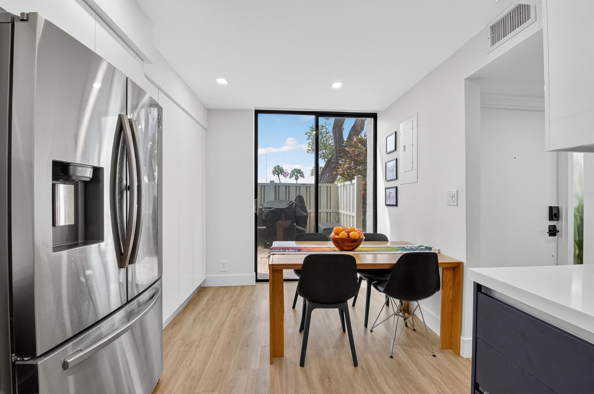 Bridgewood 3 bedroom, 2.5 bath town house. Corner lot with lushly landscaped exterior patio area with partial lake view. Expanded interior area with porch glassed in and opened to the living area. Renovated interior with engineered wood floors throughout. Updated kitchen with granite counters, stainless appliances and kitchen drawers with lights. Oversized washer & dryer. LED Lights in all the rooms. All the bathrooms have been updated with new vanities, toilets and flooring. Tankless water heater. Water filter. No popcorn. Fitted Closets. Private barbecue and sitting area off the kitchen which could be a golf cart area. Comes with a covered parking space. A/C replaced in 2021. New Electrical panel. Club req'd at $150,000. + dues & $10,000 Capital Cont. to the B.W. Master Assoc.
