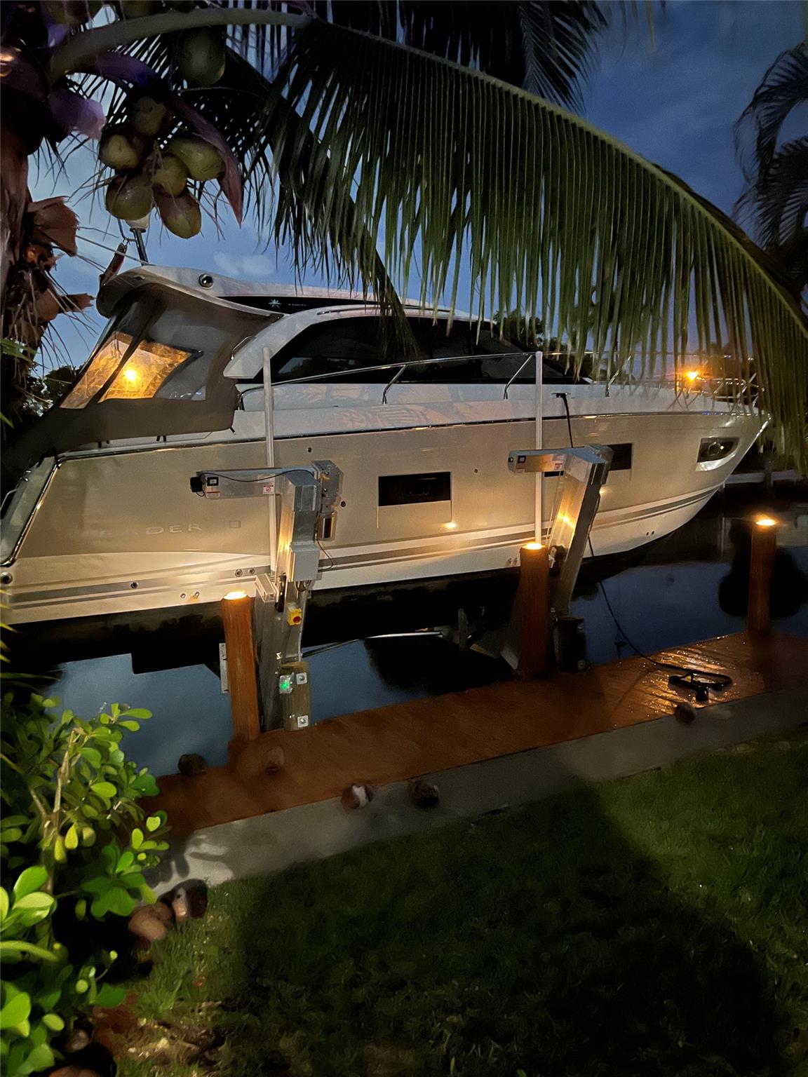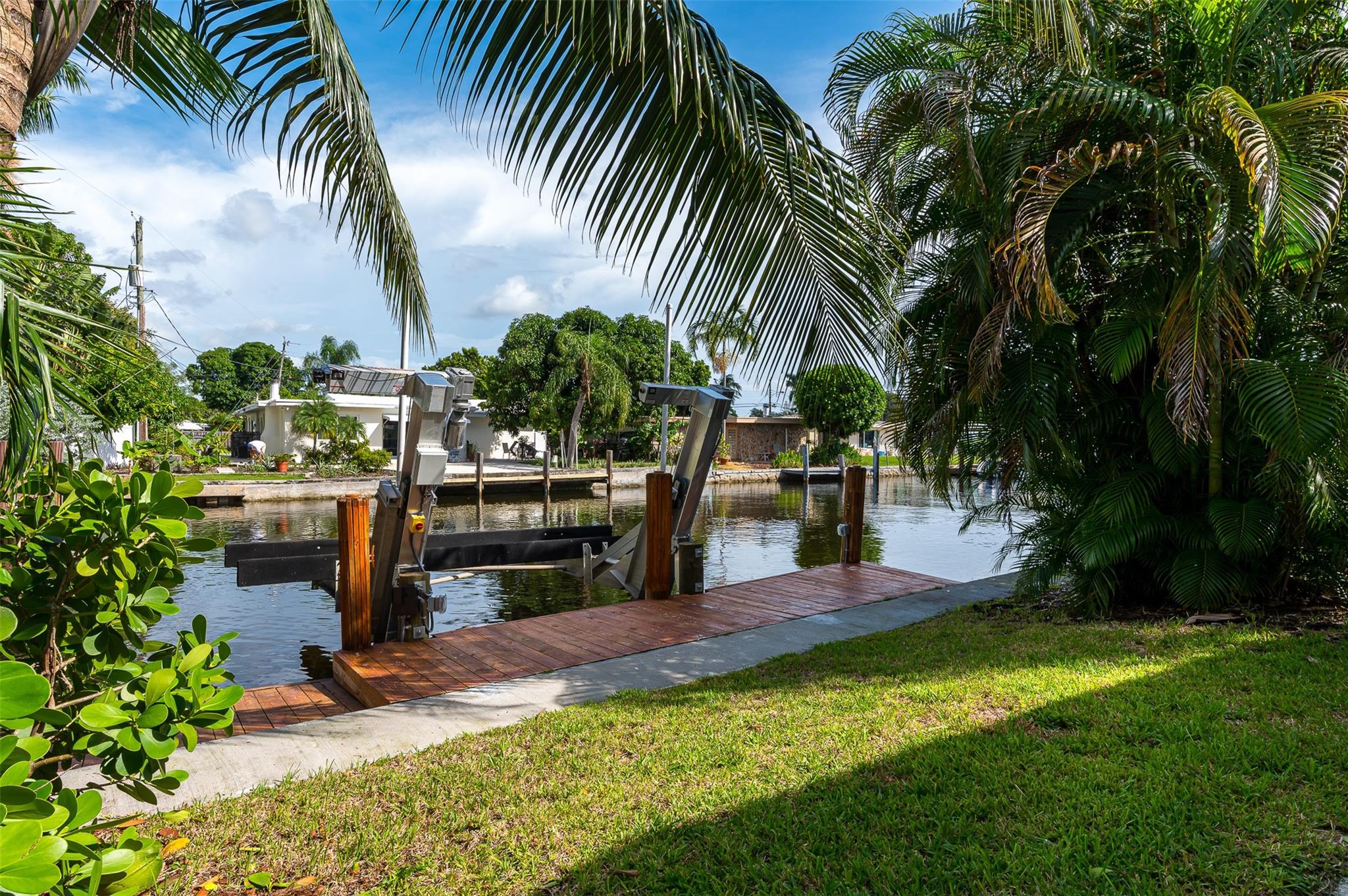 Fully renovated in 2021, this home has been updated for both comfort and style, giving 2,127 sqft of bright, open living space. A new roof, HVAC, and pool mechanicals installed in 2021 as well as hurricane impact glass sliders that flood interior with light and offer seamless access to your completely private outdoor retreat. Offers a 60ft dock and a 24,000lb boat lift, installed in 2023, for the ultimate boating experience with no fixed bridges offering direct ocean access. The new in-ground pool is surrounded by a newly installed marble patio and fenced yard designed with privacy and entertaining in mind. It features a 3/2 split-bed layout w/elegant touches-walk-in closet w/ custom cabinetry, custom kitchen cabinets and appliances, 2car garage, and laundry room with updated appliances.