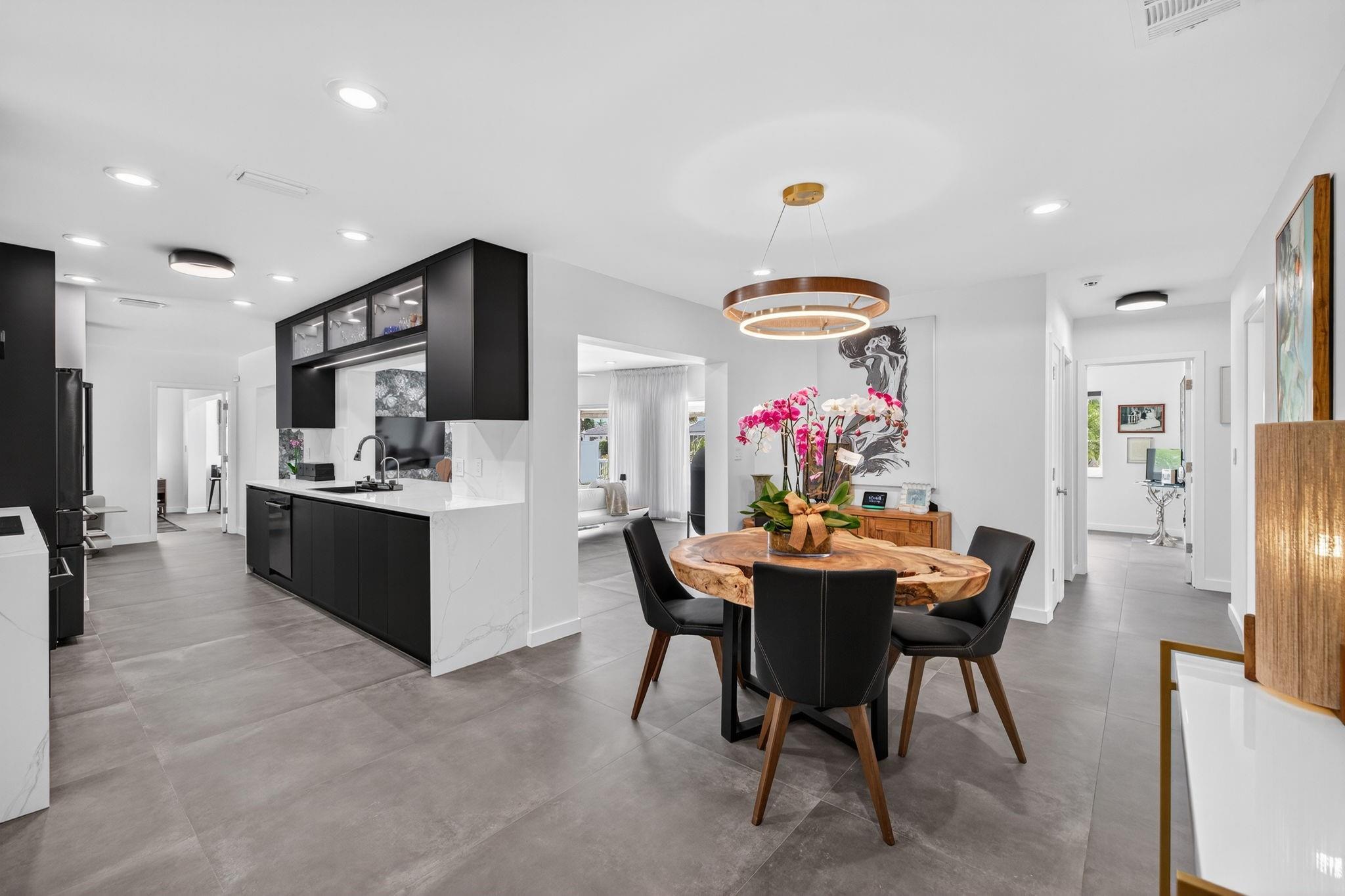 Nestled in Lake Estates, this fully renovated waterfront home has been meticulously crafted. From the striking chef’s kitchen with custom cabinetry, waterfall quartz counter, & top-tier ZLINE appliances, to the expansive open-living concept that seamlessly flows from one area to the next with an oversized slate grey porcelain tile. The primary bedroom features an en-suite bath, walk-in closet, & generous sitting area offering direct pool/water views through the impact sliding glass doors. 3 additional bedrooms & guest bath are positioned on the opposite wing of the home perfect for family/guests. The outdoor living experience is equally exceptional w/ brand-new pool, marble pool deck, concrete seawall & 75ft dock catering to the boating enthusiasts – offering ocean access w/1 fixed bridge.