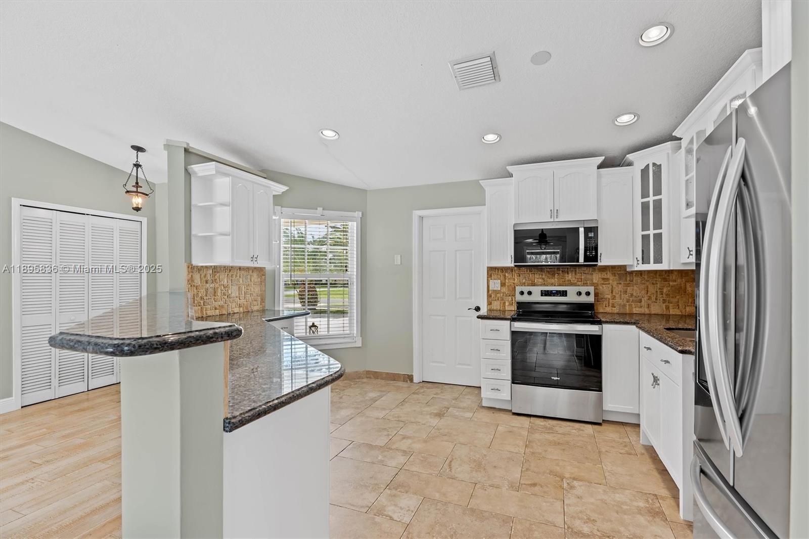 Welcome to your tropical retreat in the sought-after La Mancha community! This Key West–style residence combines modern comfort with laid-back Florida charm—no HOA and located near good schools. The bright, open layout features a remodeled kitchen with granite counters, custom cabinetry, pantry/laundry area, and all-new 2025 stainless-steel appliances. Major upgrades include a 2024 A/C unit with condenser pump, impact windows, metal roof (approx. 5-6 years old), whole-house water filtration system, and engineered tile flooring. Enjoy the ultimate backyard setup with a walk-in pool, brand-new 2024 heater and pump, and a tiki bar with wet bar, mini fridge, and TV hookup. Expanded driveway offers ample space for RV or boat parking. A move-in-ready gem designed for true Florida living!