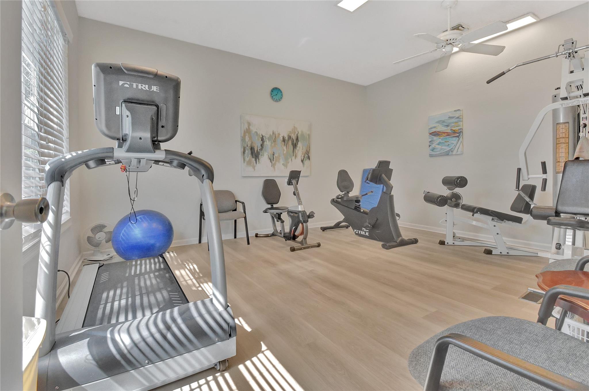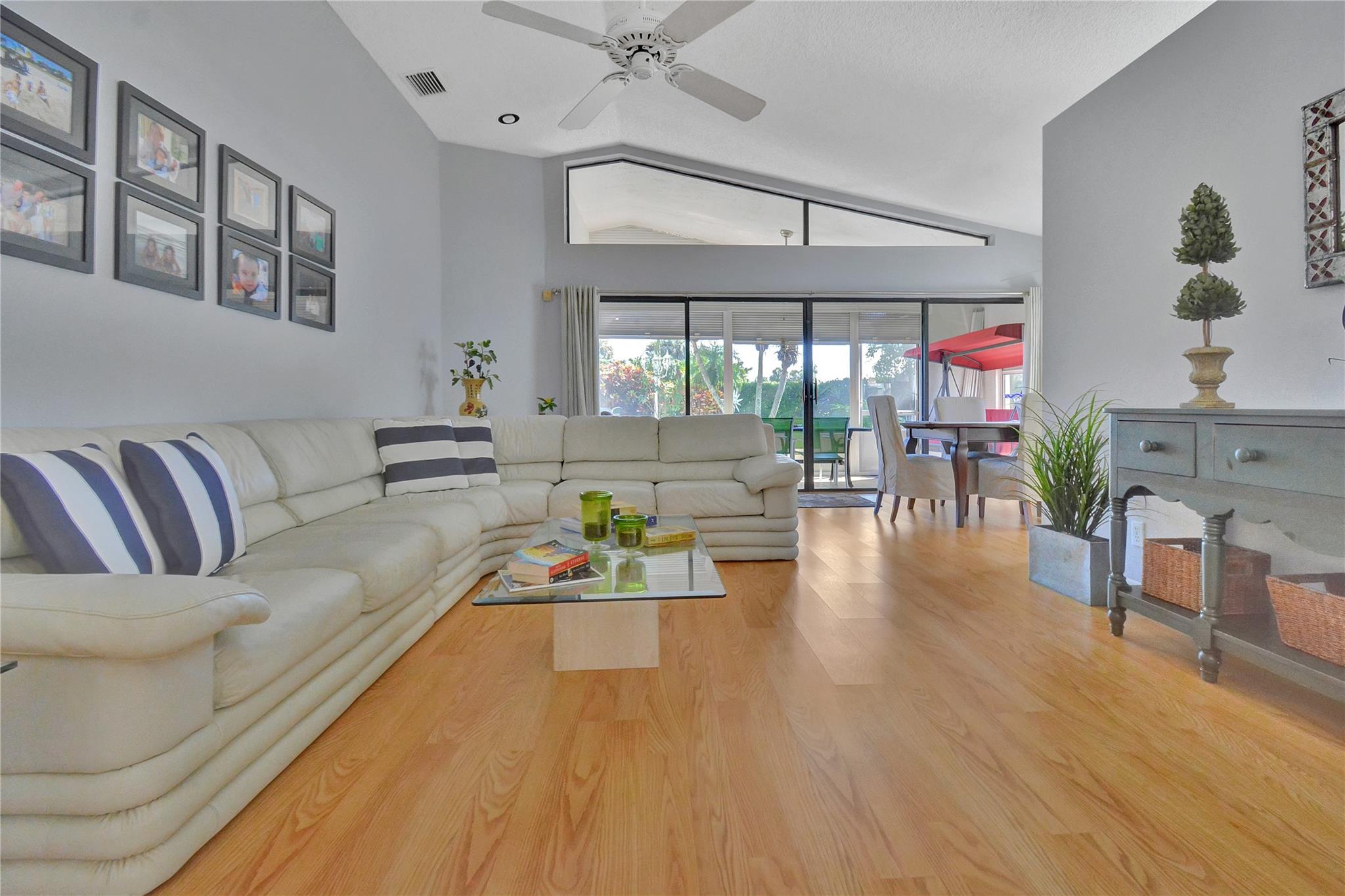 55+ Community - Discover this beautifully maintained 3-bedroom, 2-bath Lakeridge home, where comfort meets connection. Vaulted ceilings and a skylight fill the open layout with natural light, illuminating warm laminate floors throughout. The kitchen shines with sleek black lacquer countertops, double stainless sink, Frigidaire appliances, and abundant cabinetry. The spacious primary suite offers private patio access, dual vanities, and a generous walk-in closet. Relax on the screened, covered patio overlooking lush garden views. Additional features include a 1-car garage, 2022 A/C, 2018 roof, and low $295 HOA covering cable, lawn, and exterior care. Minutes to beaches, shopping, and dining — a serene retreat with timeless Florida charm.
