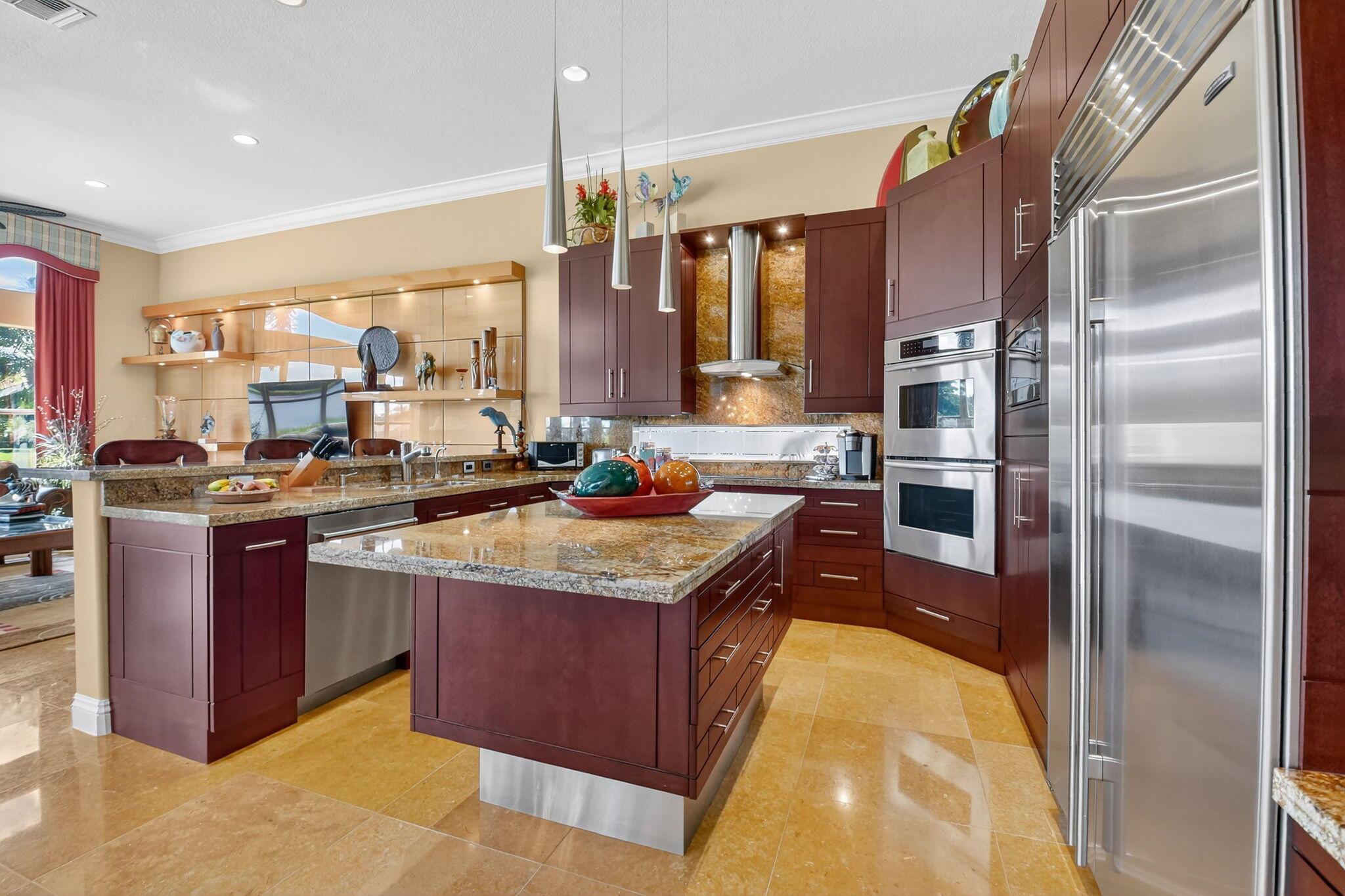 Stunning & Oversized Lakefront 4BR/4BA/3Garage home. Sprawling 3,206 sq.ft ranch triple split home has impressive upgrades including rich 24'' marble floors in main living areas, wood cabinets & stone counters throughout & solid core doors. One-of-a-kind Columbian Mahogany Kitchen with 54'' cabinets, soft-close drawers, Thermador double oven, Sub Zero frig, Dacor Stove. Primary oversized bedrm has built-out walk-in closets, Elegant light fixtures throughout.-French doors lead to oversized patio on the lake. Excellent for Entertaining. Magnificent Wall Unit in Family Rm. Walk to Multi-Million Clubhouse.Maintenance includes: Internet, lawn, exterior paint, SHO/HBO & alarm. 1X cap fee $5,090.00. 4th bedrm used as den. Buyer/Buyers agent to verify all information. Measurements are estimated.