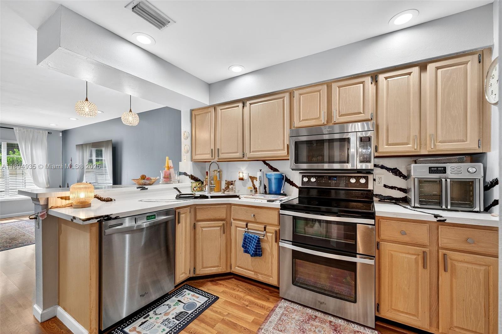 It's like having your own 2 story home w/1600 sq ft living area and 2 car garage w/no neighbors behind. Spacious floor plan w/3 bedrooms, 2.5 bathrooms PLUS a versatile loft area that many have converted to a 4th bedroom. New Impact windows & Doors, New Quartz kitchen counters w/updated stainless steel appliances, beautiful solid wood cabinets, Open Kitchen to Family Room. Southern view w/ lots of natural light. 1st floor also has living & dining rooms, perfect for entertaining! Step outside to the screened outdoor large pavered living area. Stress free living with your exterior taken care of by the HOA.