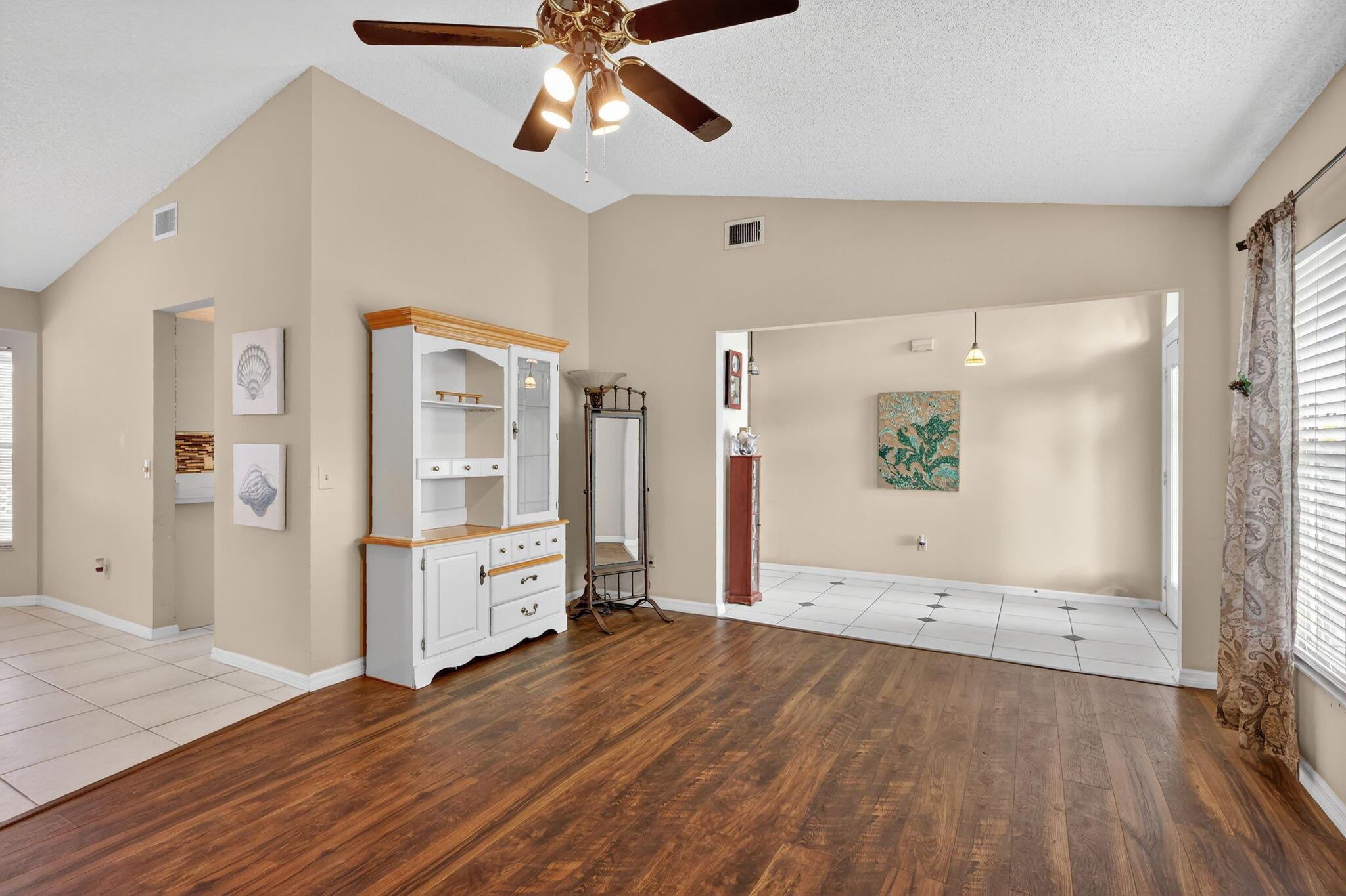 Spacious and inviting 3-bedroom, 2-bath pool home featuring a durable metal roof and an open floor plan with high ceilings and abundant natural light. The kitchen overlooks the dining and living areas, perfect for gatherings and everyday living. Step outside to a screened-in chlorine pool and covered patio, ideal for relaxing or entertaining. The large open yard includes a storage shed for convenience. Newer A/C and water heater add peace of mind. Located near Gatlin Blvd, Rosser, and I-95 with no HOA--this Port St. Lucie home combines comfort, quality, and space to grow.