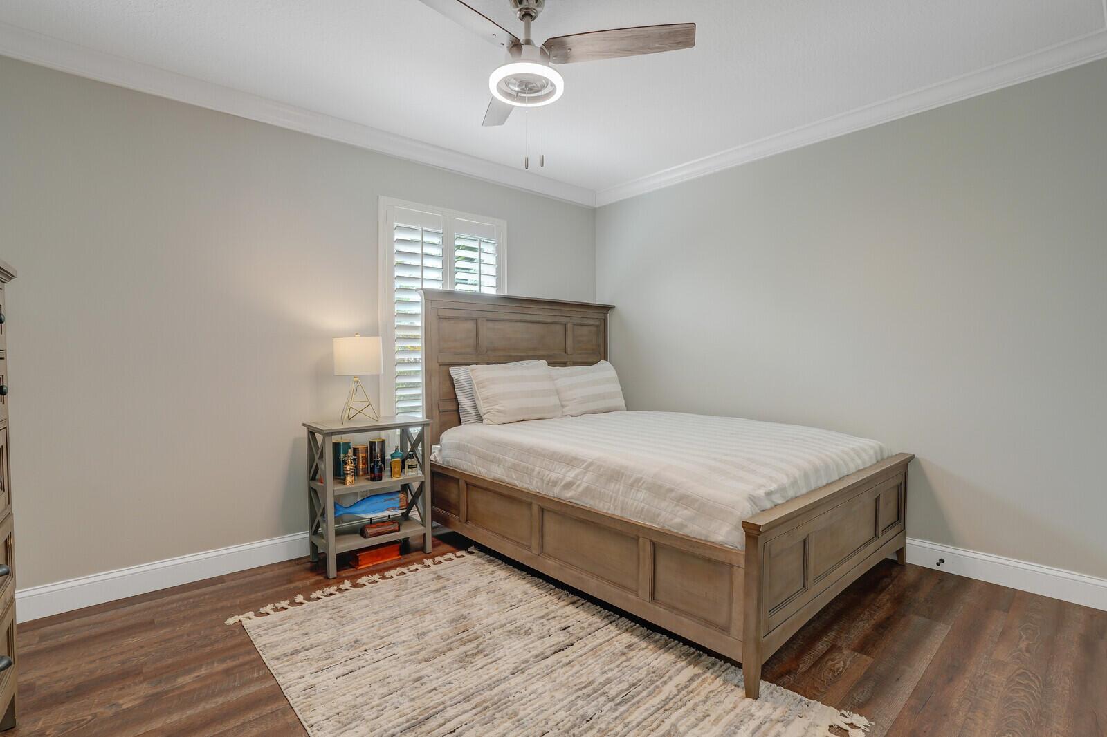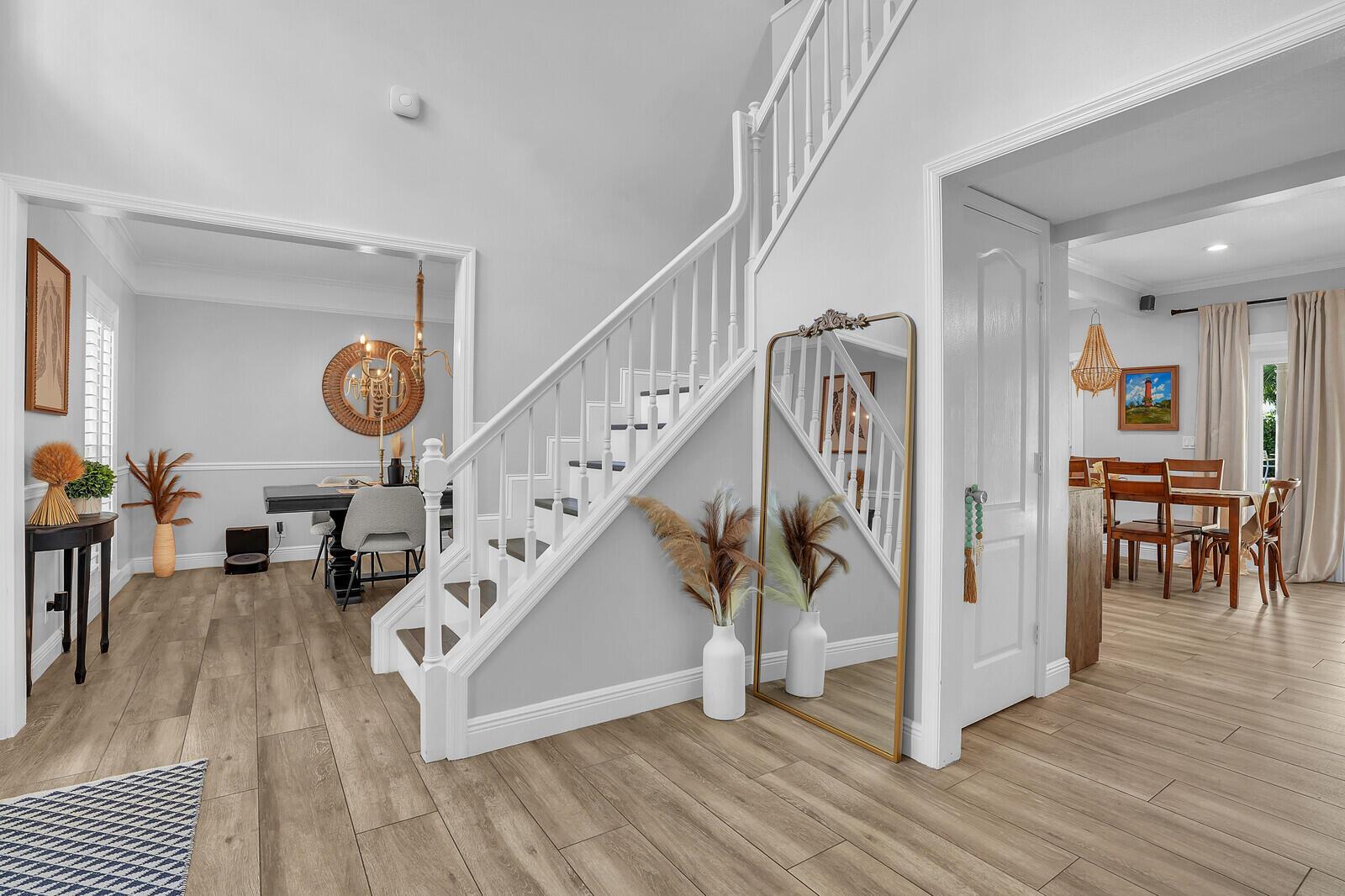 One of Palm Beach Gardens' best-kept secrets, The Hunt Club is a beautiful gated community tucked in the heart of town. This stunning home sits on a premium ⅓-acre lot, one of the most desirable in the neighborhood, surrounded by lush landscaping and total privacy. Enjoy your own tropical oasis with a resort-style pool featuring a waterfall accent, professional lighting, and a covered lanai--perfect for relaxing or entertaining.Inside, imported wood-look tile floors, impact glass, double crown molding, plantation shutters, high ceilings, and custom built-ins. The gourmet kitchen offers a gas stove, oversized granite island, custom wood cabinetry with crown molding, and a built-in wine rack that flows effortlessly into the open living and dining areas.