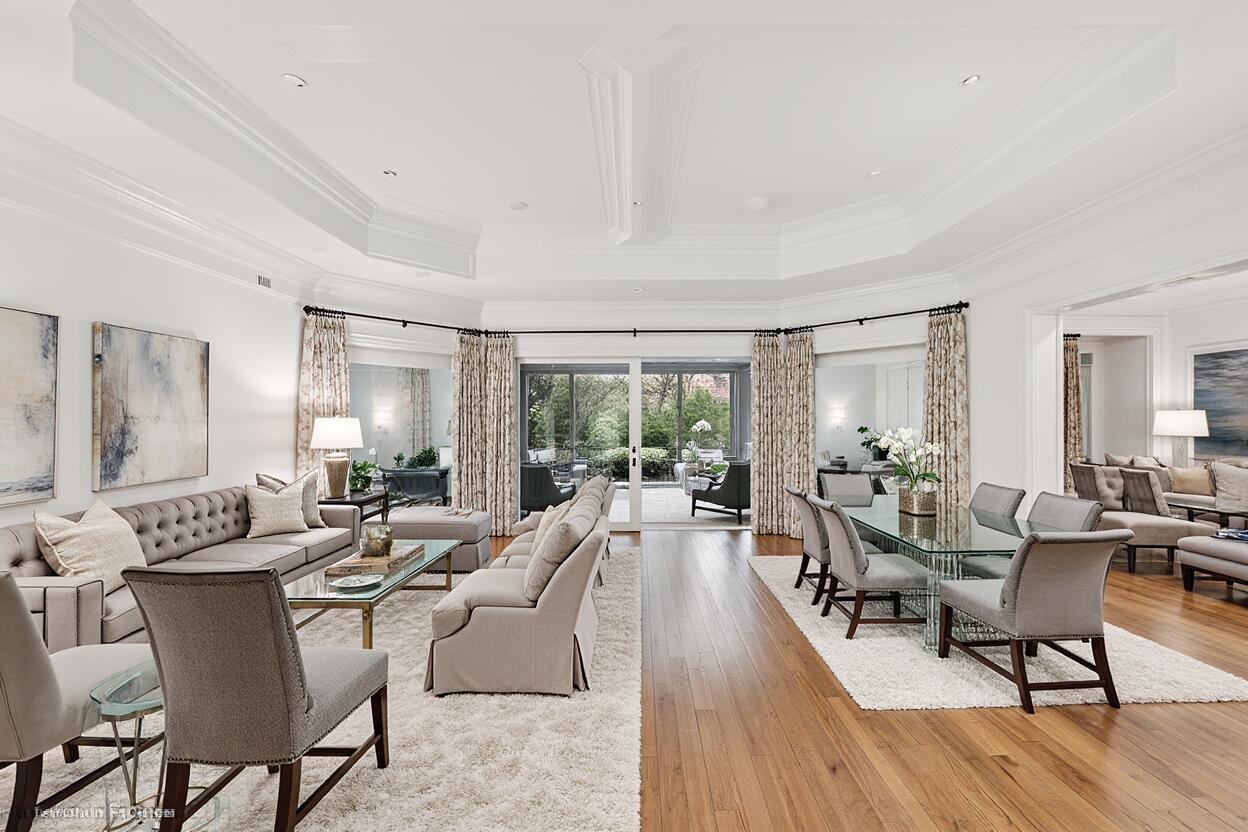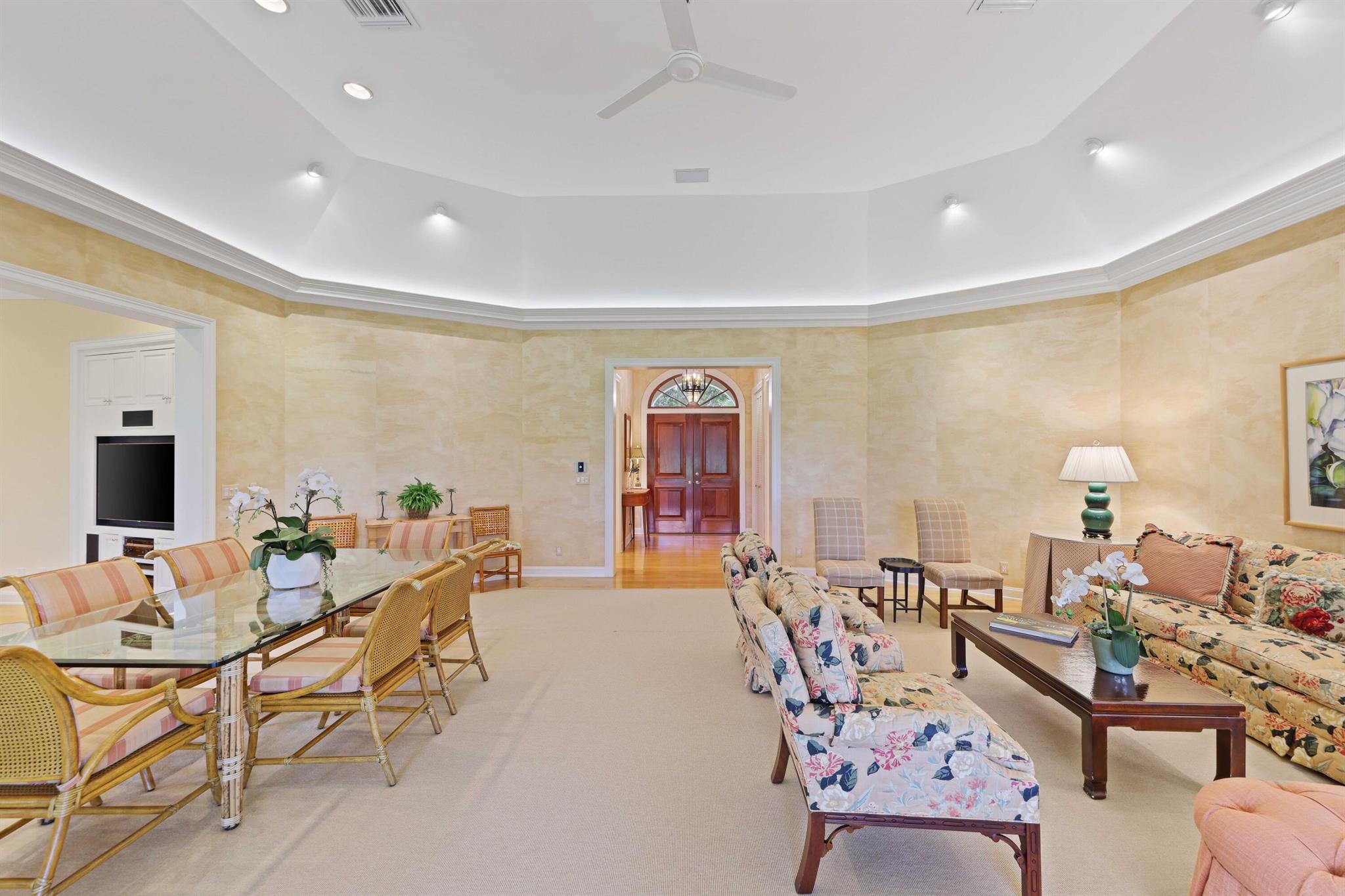 Elegantly situated in the prestigious Village of Golf, 5 Country Road East A is a gracious single-family residence offering timeless style and serene golf course views. Built in 1996 and thoughtfully maintained, the home encompasses 4,131 total square feet with 3,198 square feet under air on a beautifully landscaped 0.82-acre lot. The classic, traditional design welcomes you with a formal entry leading into a grand living room featuring soaring ceilings and walls of glass that frame the tranquil fairway setting. Ideal for entertaining, the living space flows seamlessly to an enclosed lanai, perfect for year-round enjoyment. Inside, rich hardwood floors, custom built-ins, and a warm family room off the kitchen create an inviting atmosphere. The chef's kitchen is appointed with a large