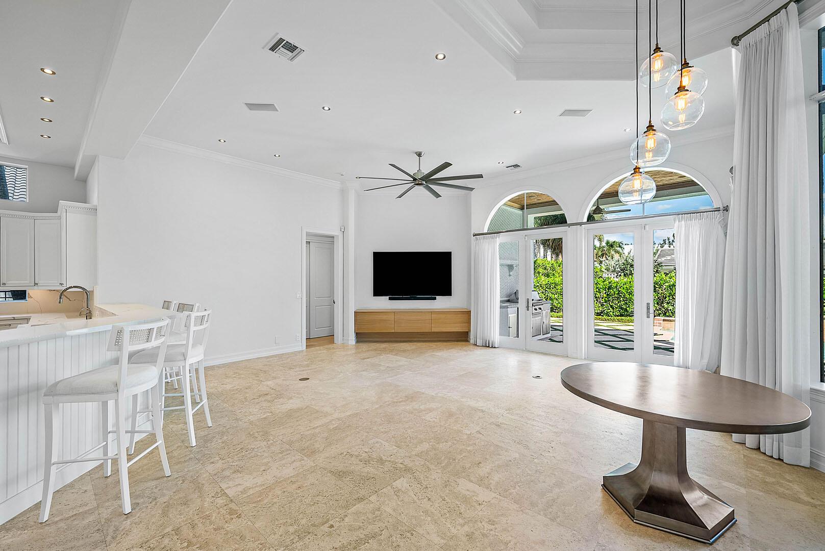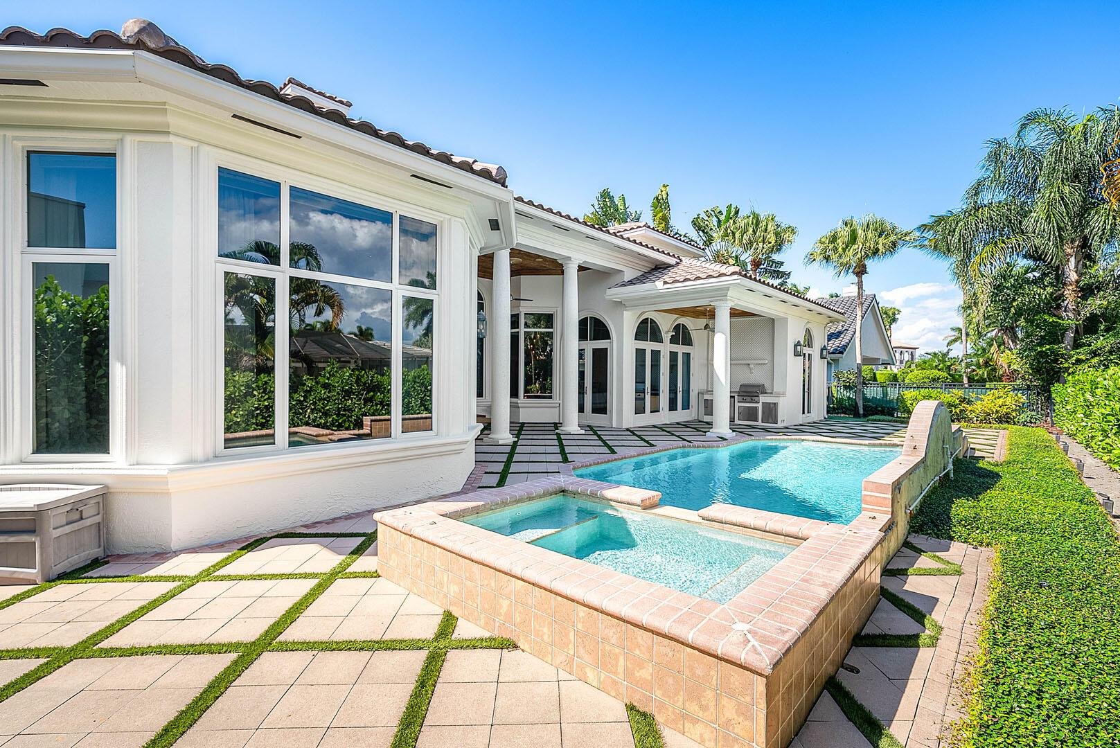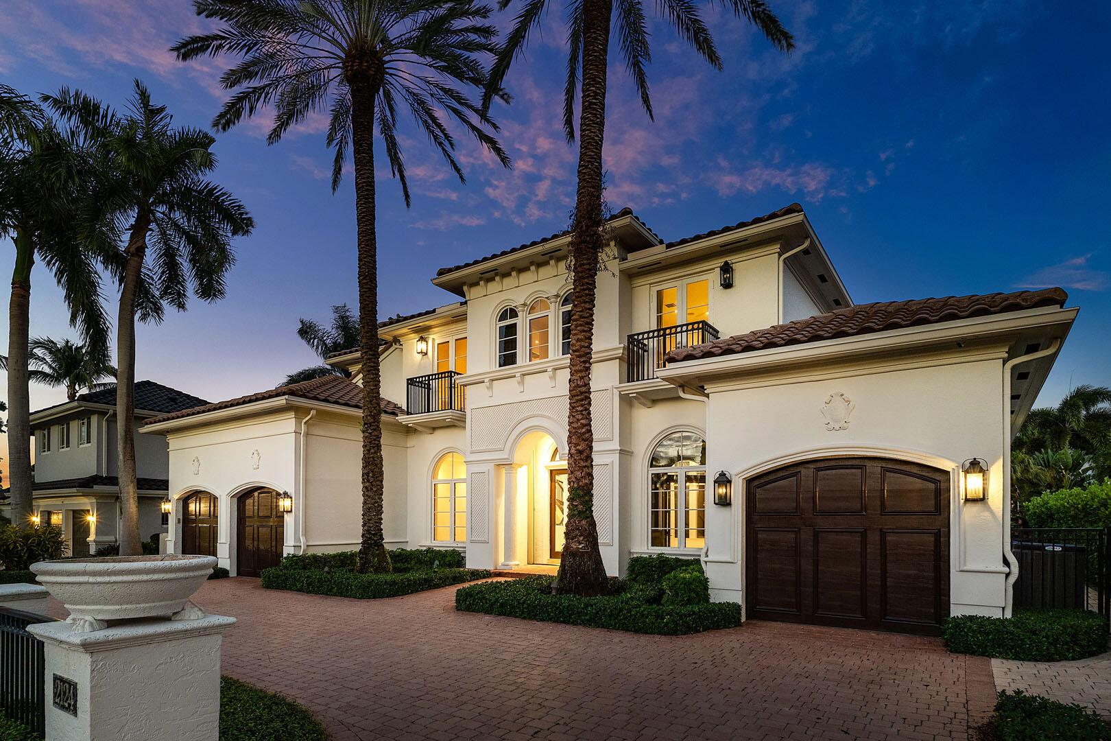 Welcome to 2124 West Maya Palm Drive, a beautifully renovated transitional estate in Boca Raton's Royal Palm Yacht & Country Club. Designed with elegance and comfort, this home offers a light-filled layout and refined finishes. The formal living room features a marble fireplace and serene backyard views. The first-floor primary suite is a luxurious retreat with new hardwood floors, dual custom closets, a spa-like bath with marble vanities, separate water closets, a soaking tub, and motorized shades. The main level also has a private office with built-ins, an elegant powder room, and a guest suite with new flooring and an updated bath. The gourmet kitchen has been reimagined with ample storage, sleek countertops, and dual dishwashers, opening a spacious family room perfect for