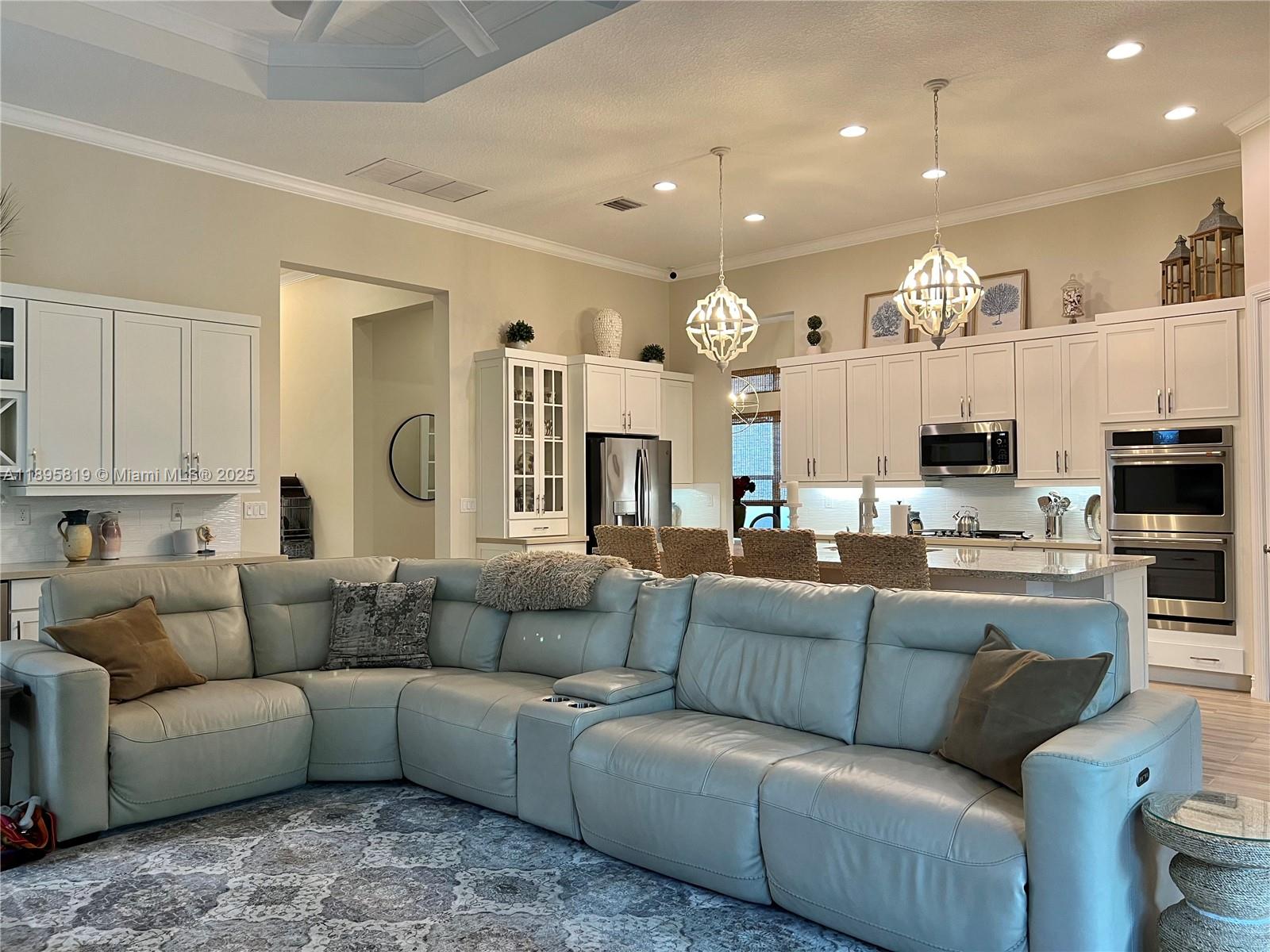 Shows like a model!!! This Beautiful Everett model is highly upgraded with 2,560 sq. ft. with 2 bedrooms plus Office/Den (add closet to be easily converted to 3 bedroom) and 2.5 bathrooms. This Home has it all...Walk into this gorgeous wood tiled home and foyer with tray ceilings finished in shiplap. Fabulous Gourmet Kitchen with quartz countertops, 5 gas burner stove, double ovens, huge island and indoor/outdoor speakers. Built in bar wall unit with wine cooler and numerous cabinet space. Brand New 2025 A/C unit. Permitted Generator and whole home has Culligan water softener. New outdoor kitchen with fridge and screened in patio. Also home exterior recently painted.