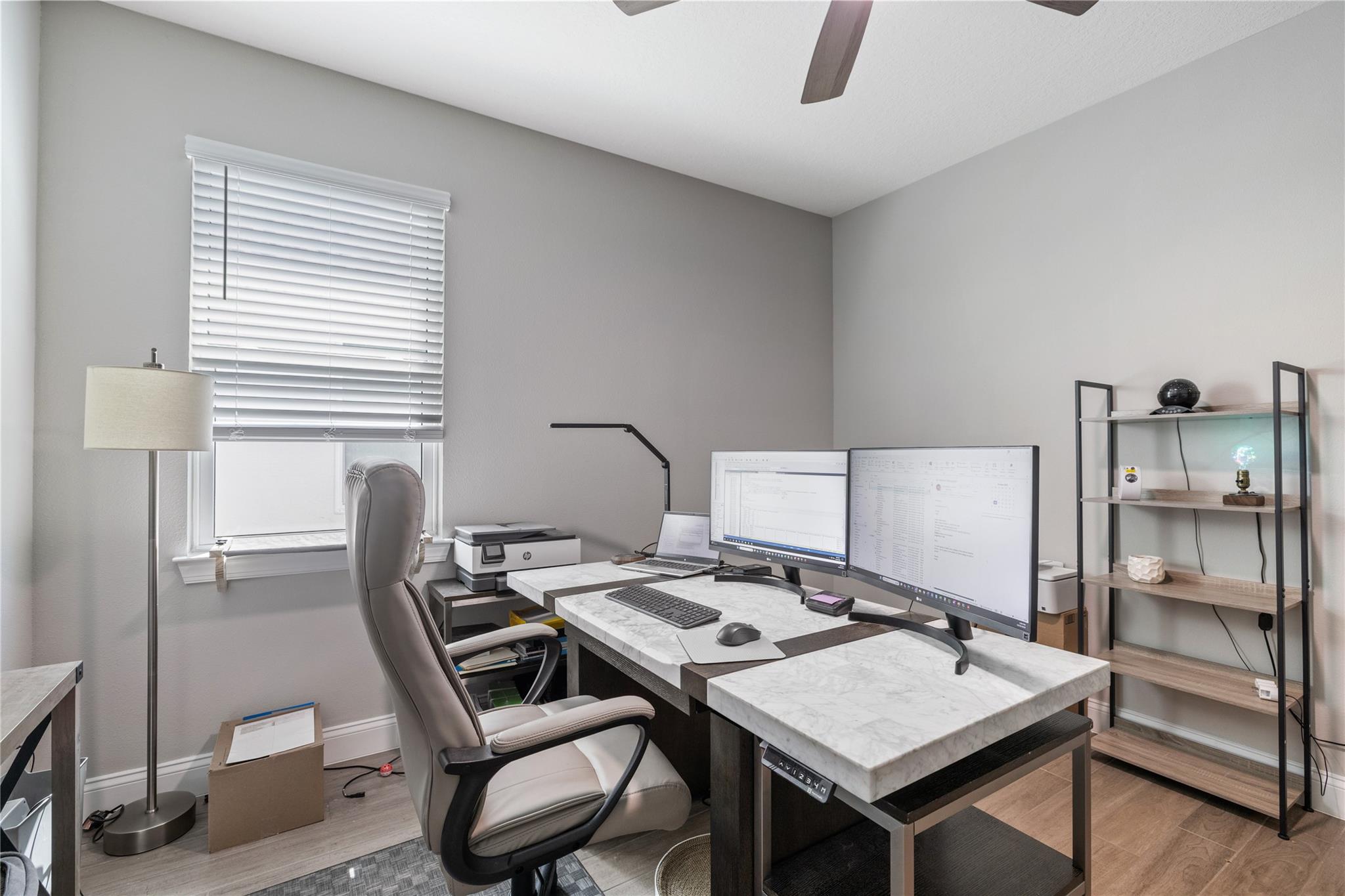 Barely lived in 2025 Coral floor plan in Brystol at Wylder! This 4-bedroom, 2.5-bath waterfront home with a 3-car garage offers an ideal split floorplan. Enjoy quartz countertops, soft-close cabinets, and a designer kitchen with a professional appliance package and stylish backsplash. Primary suite features a massive super-shower and walk-in closet, while the guest wing adds privacy with a sliding barn door. Relax on the screened lanai overlooking the lake through a wide picture window screen. Full home water softener. All windows are impact-resistant. Added upgrades include a full fence, gutters, blinds, fans, an accent wall, and upgraded lighting throughout (you don't get that buying new)! All builder warranties convey. Better than new and priced below the original purchase—move-in ready