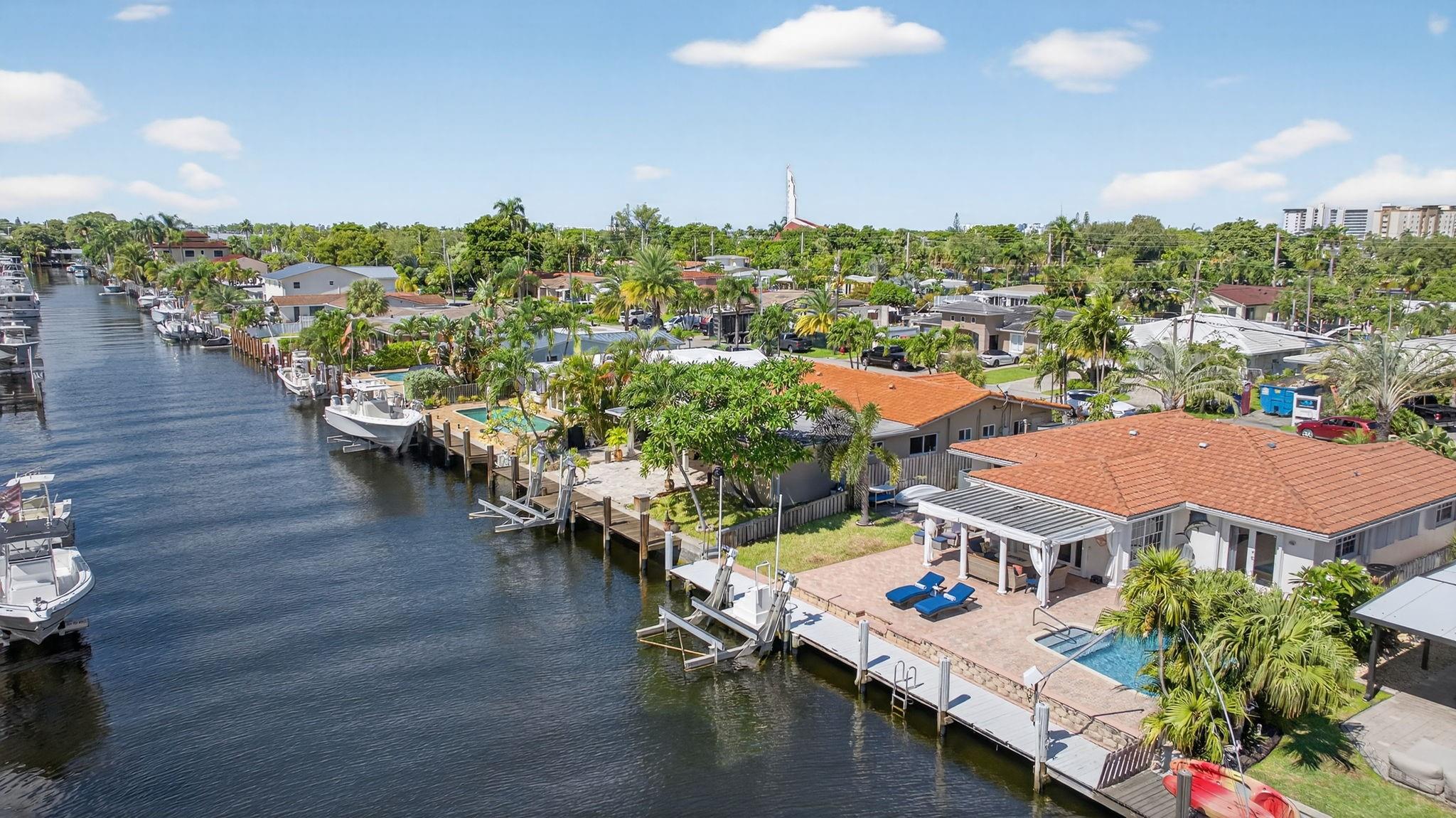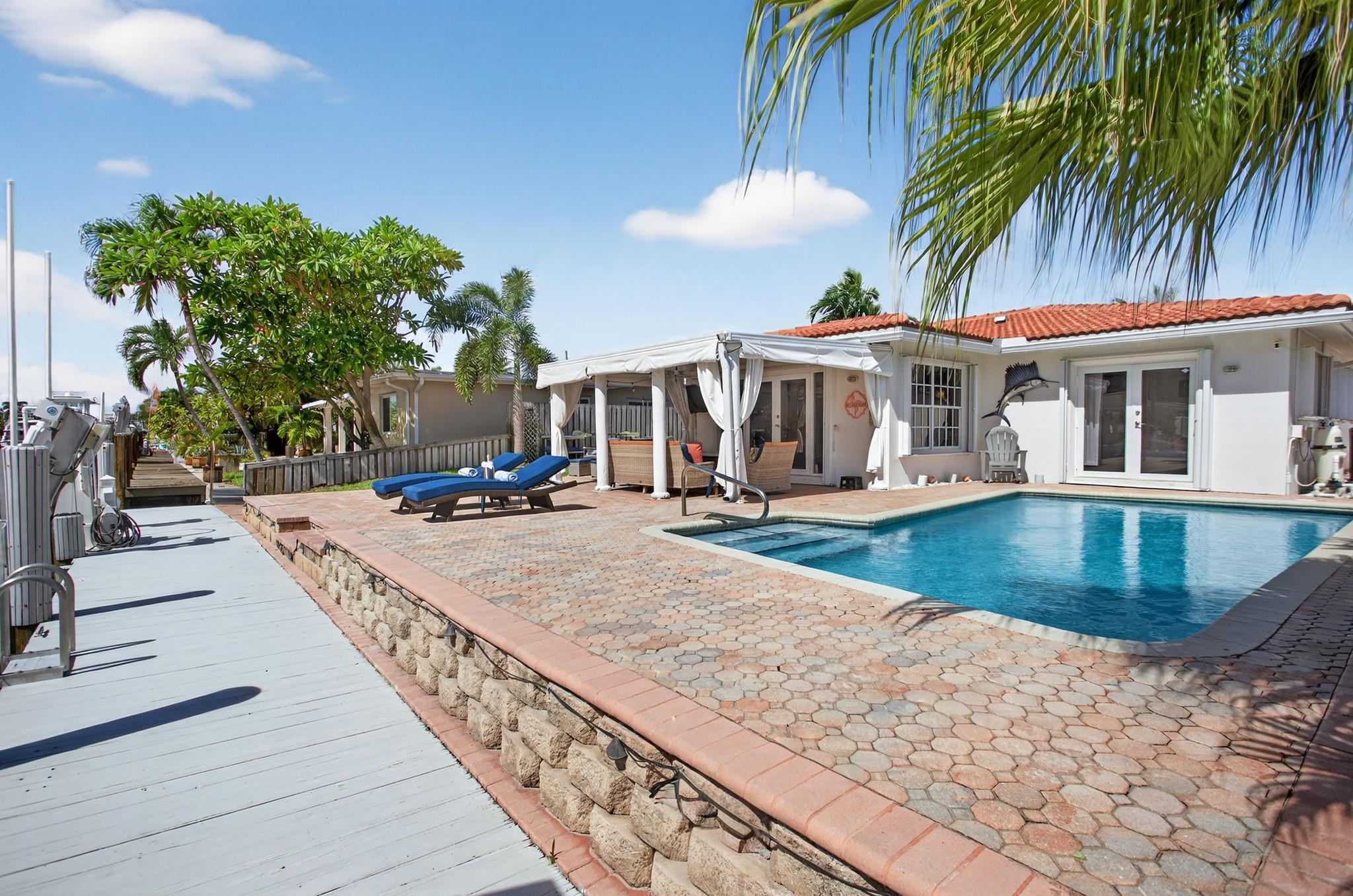 Current lowest Ocean Access waterfront Pool home in South Pompano area! 60 ft of waterfront. 14,000 pound boat lift, large dock. South facing pool area. 2 bedroom and 2 baths. French doors lead to the large Cabana area. Inviting circular paver driveway. Marble flooring. Updated kitchen. Entertainers dream. Bring your boat, kayaks, jet ski's, and enjoy the South Florida waterfront living! 1 block to Ft Lauderdale. Visit nearby Pompano Beach, one of the widest in Broward County. Control the sprinkler system, house lighting, and a/c from your smart phone or tablet. One of the largest entertaining pool and patios in the area. Travel down the street and see the amazing homes being built. Roof 2022, A/c 2021, seawall inspected/sealed 2024, pool resurfaced 2021.