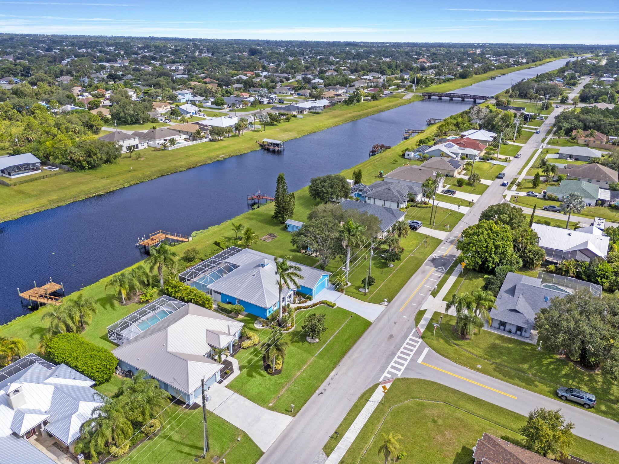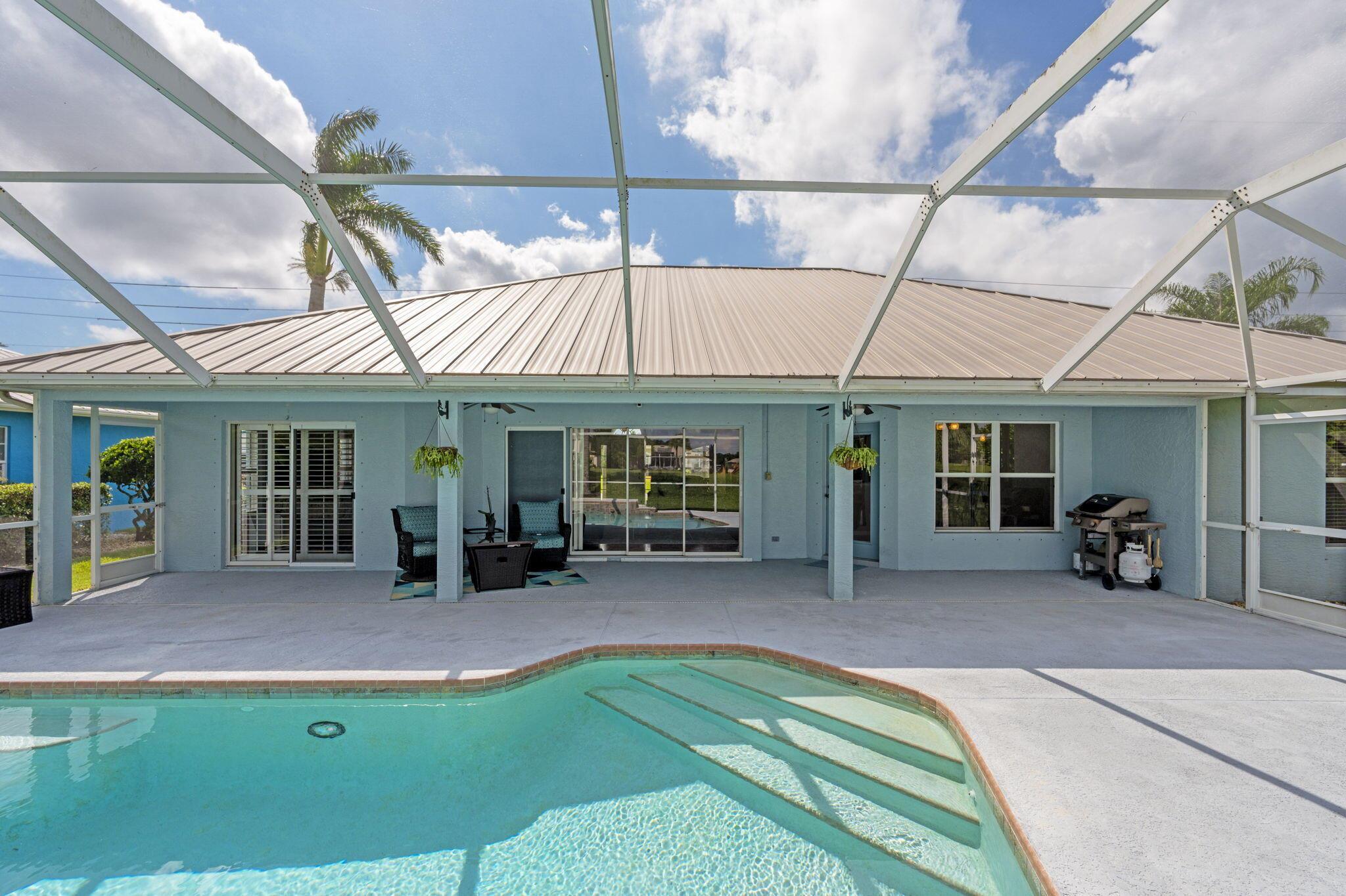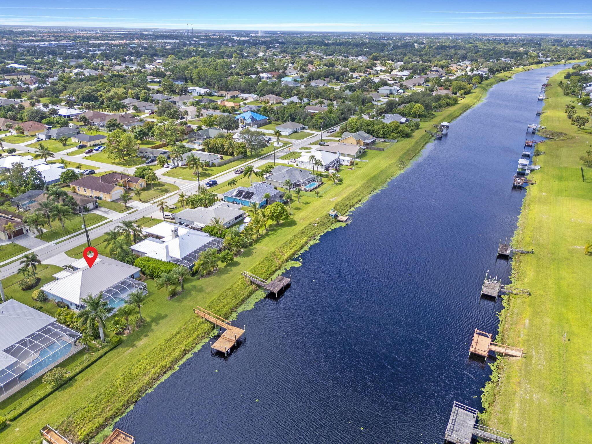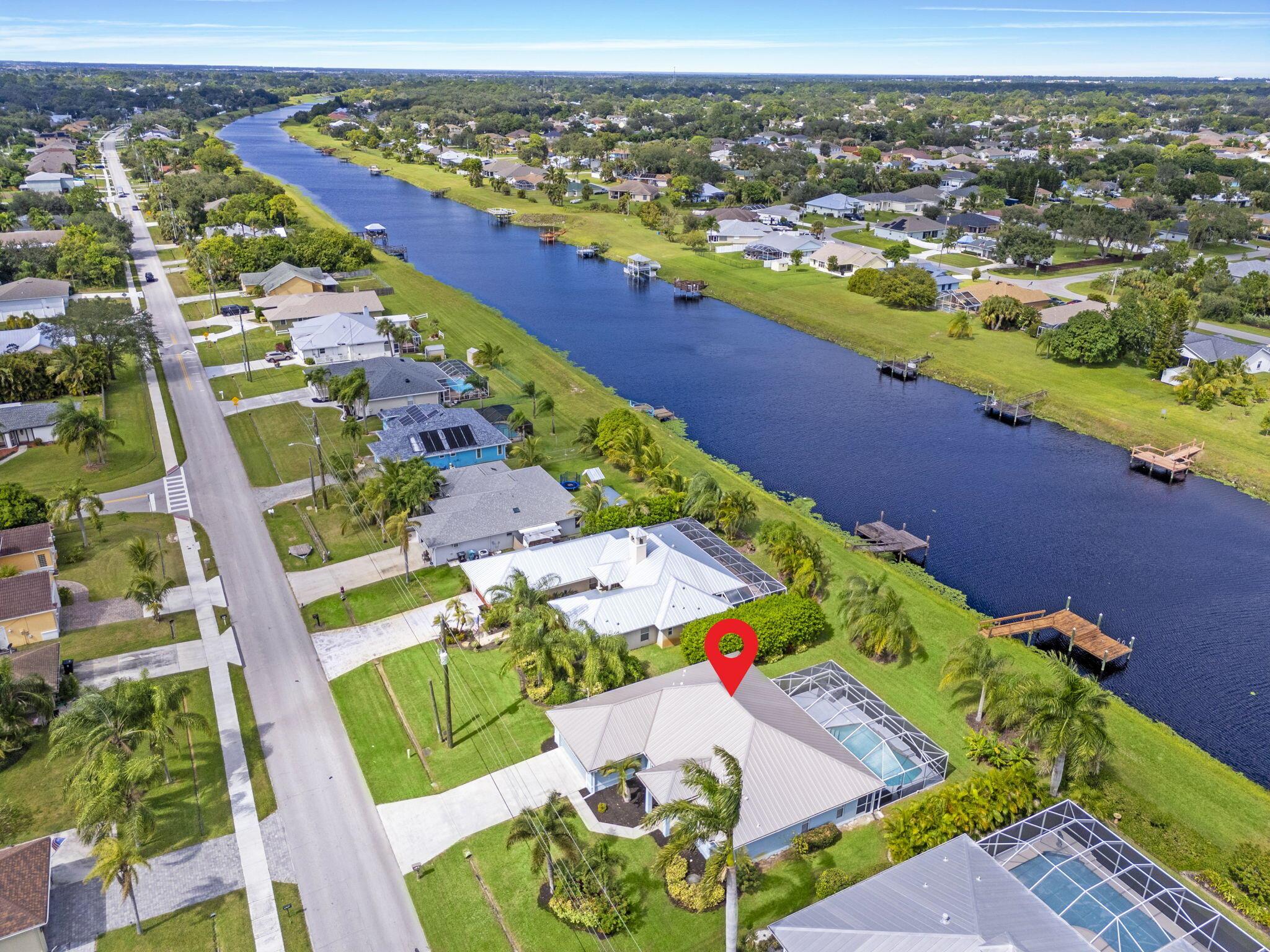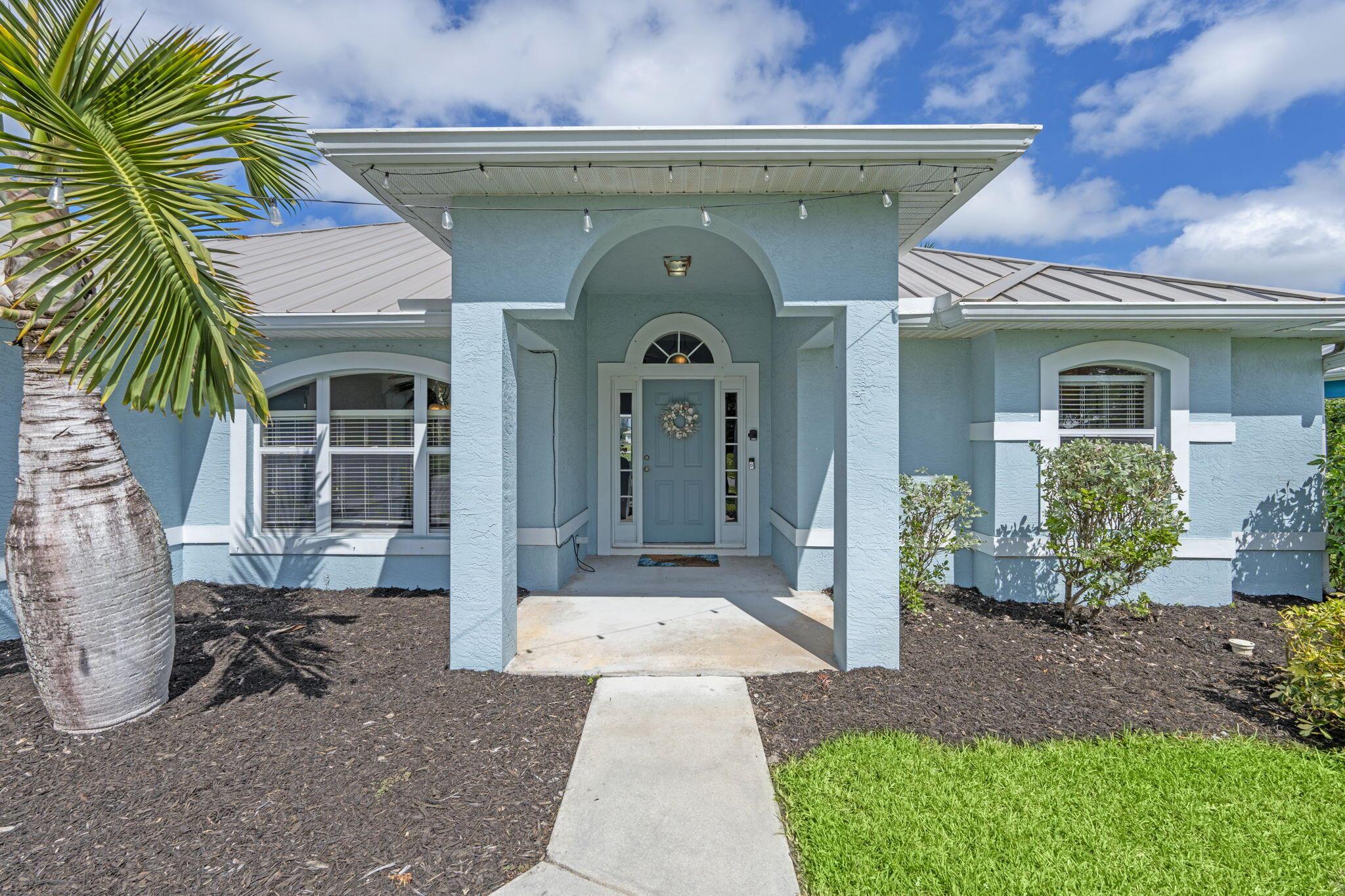 Welcome to your dream waterfront home! This beautiful 3-bedroom, 2-bath residence blends comfort, style, and true Florida living. Enjoy peace of mind with a metal roof, new AC, new water heater, and updated shut-off valves. Inside, the open floor plan, plantation shutters, and freshly painted cabinets and vanities create a bright, modern feel. Step outside to your screened-in heated pool and spacious patio with Pocket Sliding glass doors perfect for relaxing or entertaining. The private 12'x24' dock With 12' Walkway on the C-24 canal for boating enthusiasts. 10 Minutes away from C-24 Canal Park, which offers river and ocean access. With no HOA, a generator power inlet, and a newer washer and dryer, this home has everything you need for easy, worry-free living.