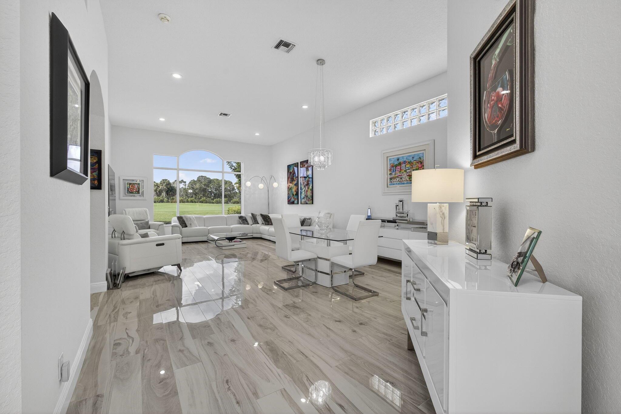 Rarely available courtyard model in Laurel Estates. This stunning home features a private courtyard w/ a large patio & pool surrounded by lush landscaping, plus an oversized 1BD/1BA guest suite with direct courtyard access, ideal for in-laws or guests. The beautifully updated kitchen offers white quartz countertops, white cabinets with pull-outs, and new appliances. Elegant gray & white French porcelain tile flows throughout. The primary suite features new impact French doors that open to the back patio with beautiful lake and golf course views. The great room and dining areas share the same scenic view. A full security system with cameras and remote access adds peace of mind, while the pool area includes a custom safety gate and tasteful blue accent decor for a tranquil outdoor retreat.