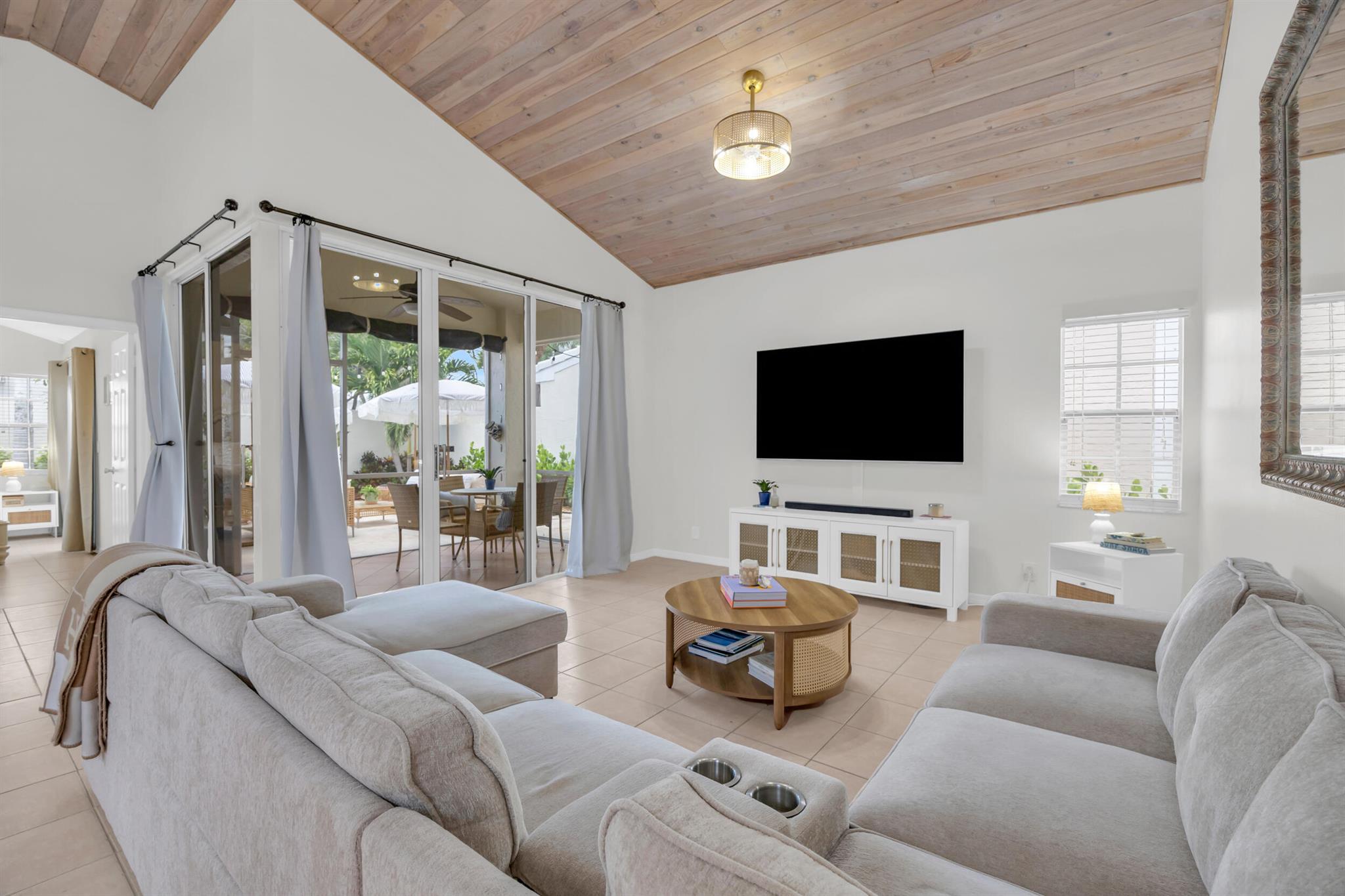 Beautifully updated 3 bedroom, 2 bath home located in the highly desirable Barclay Club at PGA National in Palm Beach Gardens. This single-story residence features a brand-new kitchen with beautiful white cabinets, quartz countertops, a stylish new backsplash, stainless steel appliances and a spacious breakfast bar perfect for casual dining or entertaining. The open-concept living and kitchen area is enhanced by vaulted ceilings finished in rich knotty pine wood, adding warmth, texture and coastal charm to the home's bright, airy feel. The primary suite includes generous closet space and an updated bath, while two guest bedrooms share a refreshed second bath.