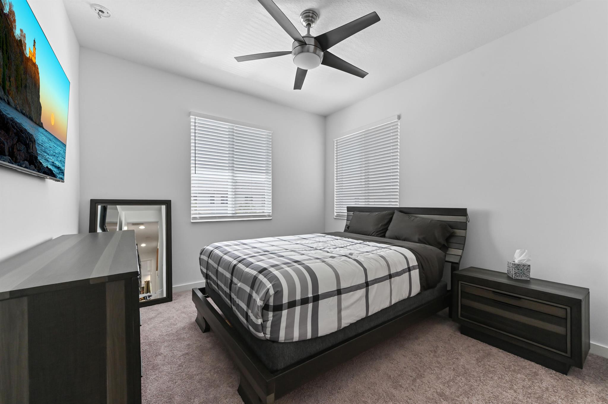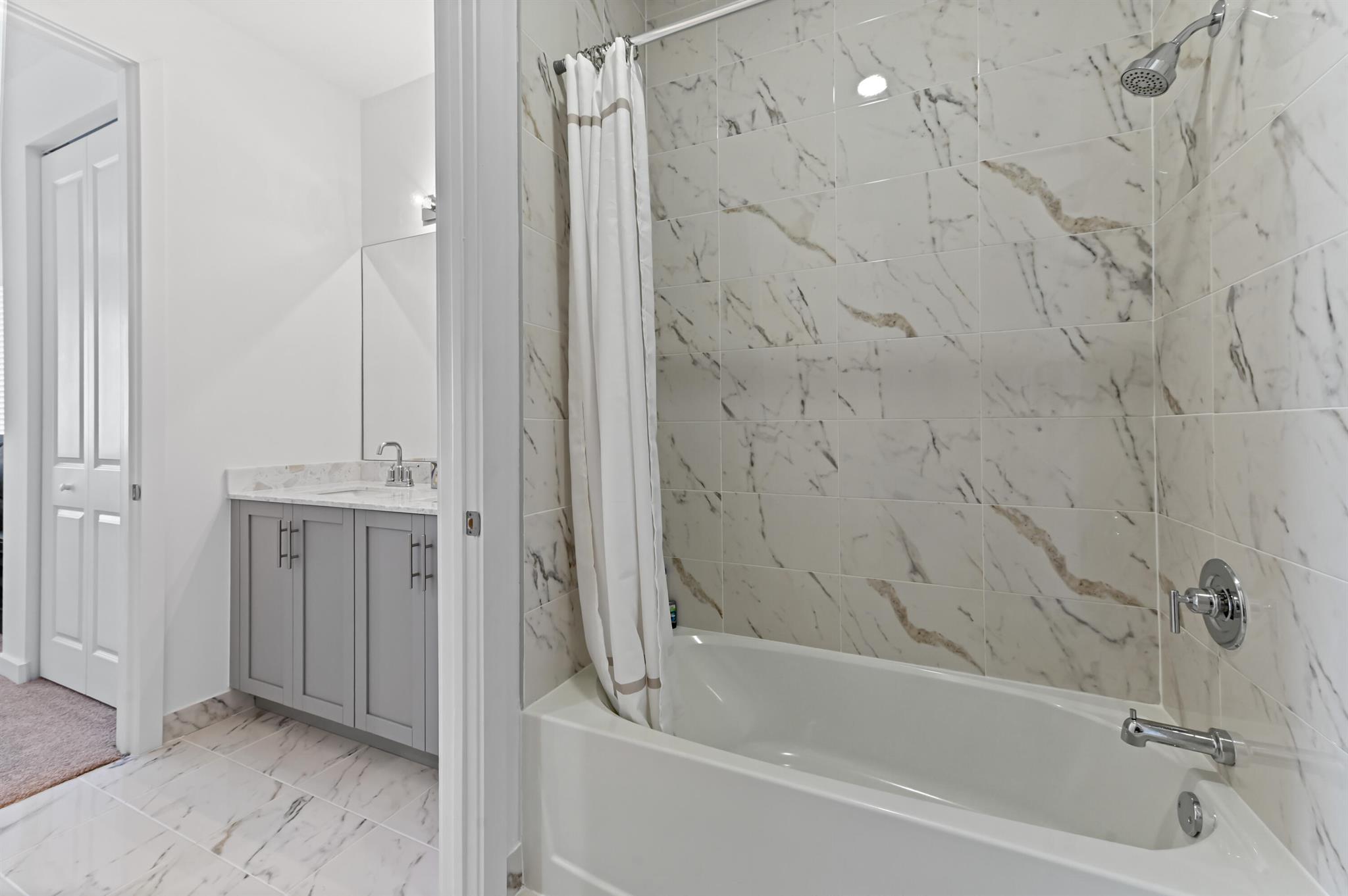 Welcome to this spectacular, modern two-story townhome, where contemporary style and a high-end finishes define the living experience in a beautifully maintained property and community. The entire residence is finished with elegant flooring and a pristine white and gray color palette. The master suite is a luxurious sanctuary, featuring a private balcony and a relaxing master bath that is like a spa. This bath boasts a stunning extended dual-sink vanity topped with white marble-look quartz, providing exceptional storage and counter space. The shower is a masterpiece, offering a separate soaking tub and a large glass-enclosed walk-in shower fully finished with high-end, continuous marble-look tile and a river rock floor.