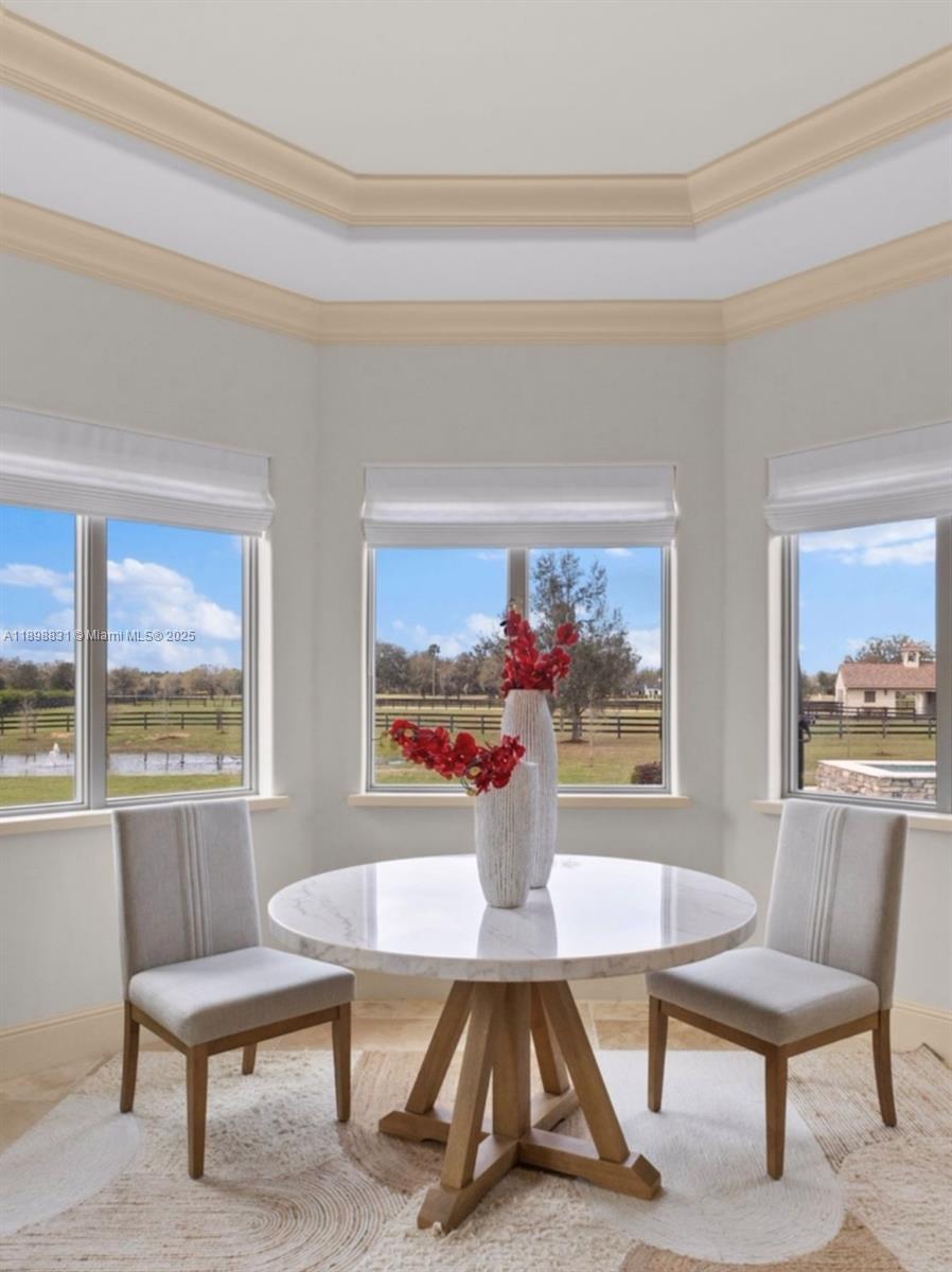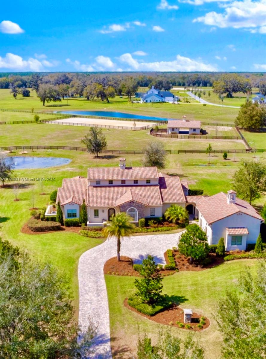 Luxury Tuscan estate in the gated equestrian community of Bel Lago, just minutes from the World Equestrian Center. This 4BR/4BA + media room home boasts over 3,800 sq ft under air with cathedral ceilings, travertine finishes, plaster walls, custom kitchen, formal dining, and a gas fireplace. Enjoy sunset views over the pool and pastures. The spacious primary suite, ample closets, tray ceilings, and elegant details throughout offer both beauty and comfort. A breezeway leads to a 2-car garage with AC and an upstairs room. Outdoors, a 41x14 heated pool/spa (2020), 3-stall concrete block barn (2022) with tack room, bath, 2 paddocks, and 200x100 arena make this ideal for equestrian living. Direct access to trails and set on over 5 acres with professional landscaping and cryo board fencing.