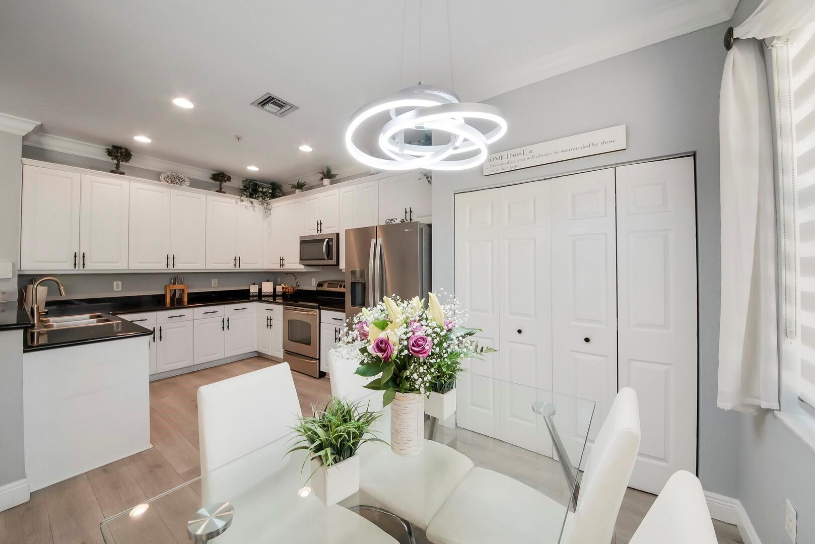Welcome to this beautifully maintained 4-bedroom, 3.5-bath townhome nestled in the sought-after Greystone neighborhood. This home offers a perfect blend of style, comfort, and functionality, featuring neutral flooring and elegant crown molding throughout the main living areas. Enjoy formal gatherings in the spacious dining room or relax in the inviting living room with sliding glass doors that lead to a covered and open patio--ideal for indoor-outdoor living. The kitchen is a chef's dream, boasting granite countertops, sleek stainless-steel appliances, crisp white cabinetry, under-cabinet lighting, snack bar and a cozy breakfast nook with its own slider to the patio.