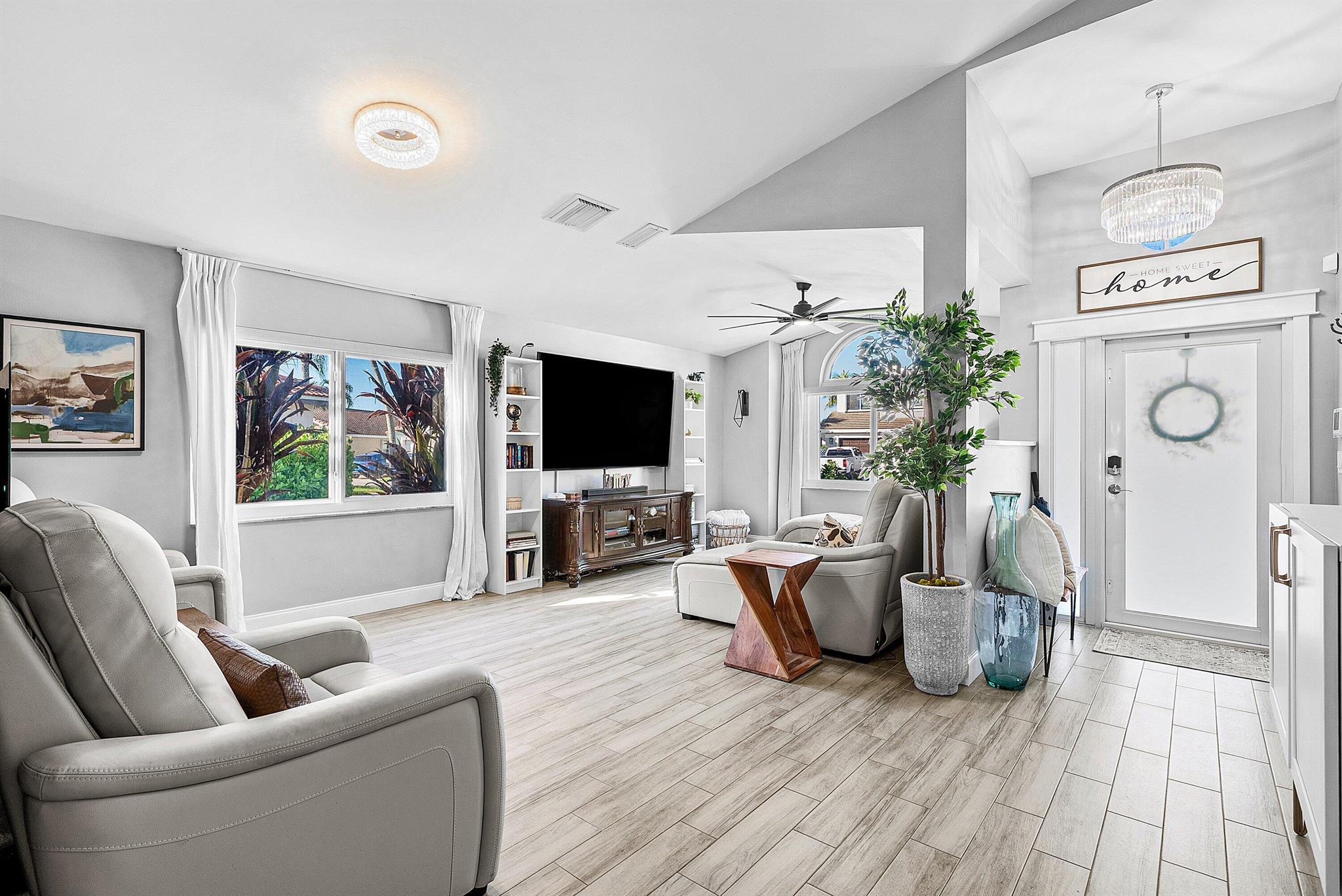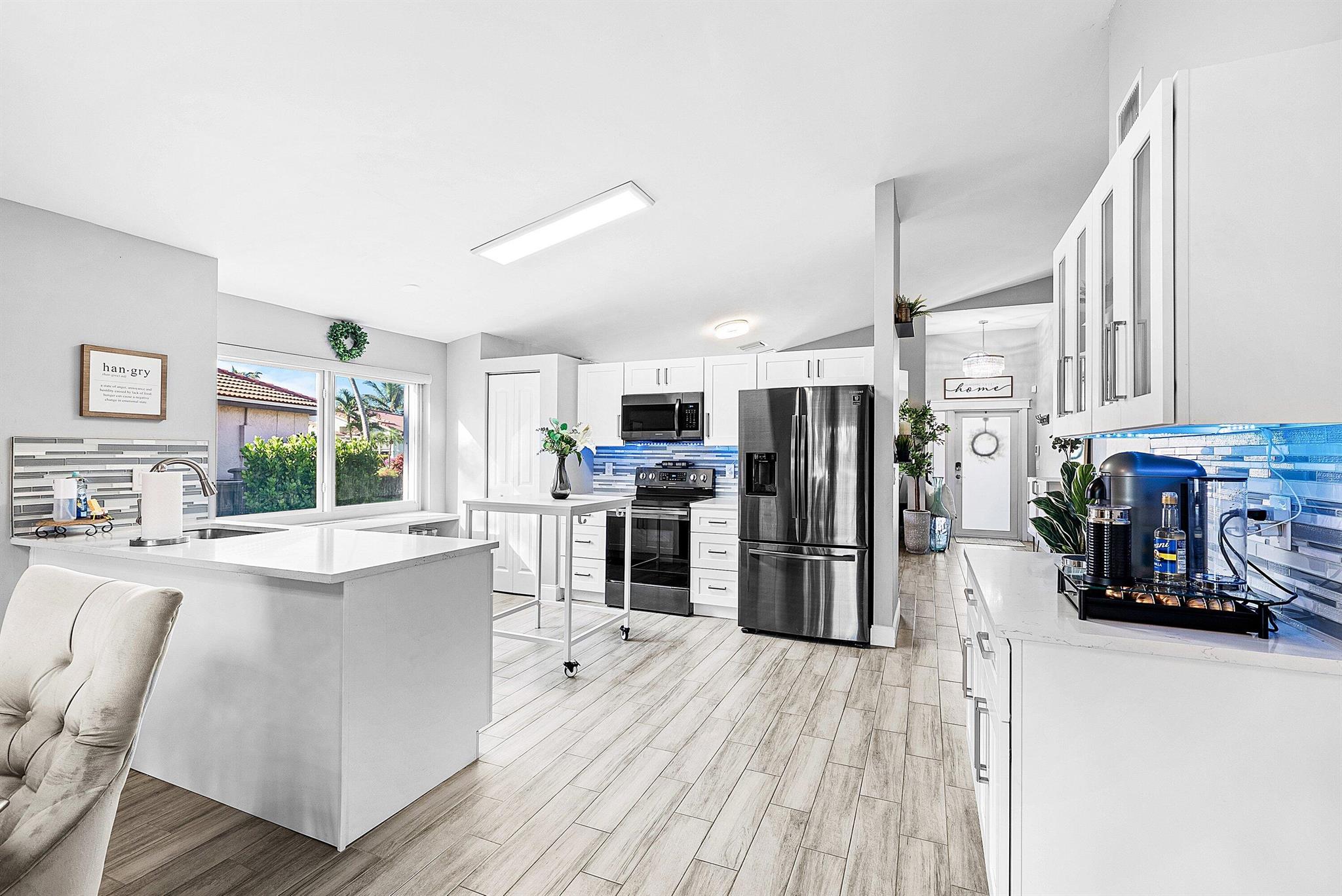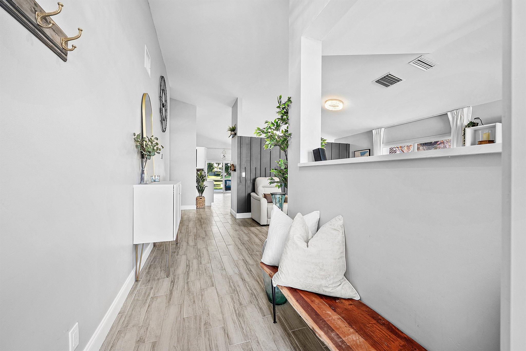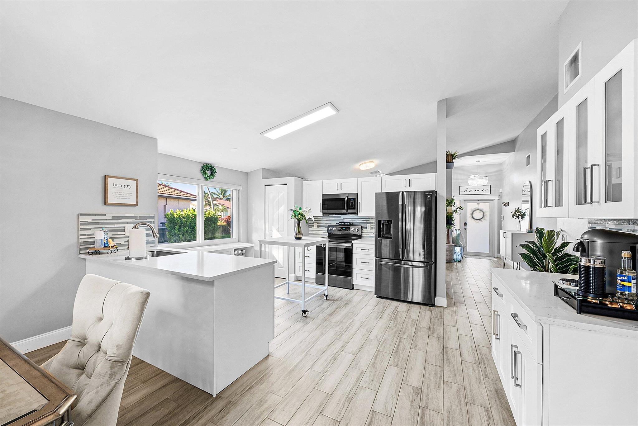 Welcome home to this beautifully renovated 3-bedroom, 2-bathroom lakefront residence with a 2-car garage, perfectly situated in the sought-after community of The Colors. This home combines comfort and style in an ideal location, zoned for top-rated schools including Crystal Lakes Elementary, Christa McAuliffe Middle, and Park Vista Community High. The moment you enter through the impact privacy glass front door, you'll immediately notice the refined touches and thoughtful updates throughout. Highlights include vertically laid wood look tile flooring, 10 foot vaulted ceilings, and updated trim, lighting, and fixtures that create a warm and contemporary feel. Significant updates include a full remodel of the floors, kitchen, and bathrooms (2021), impact windows and doors,