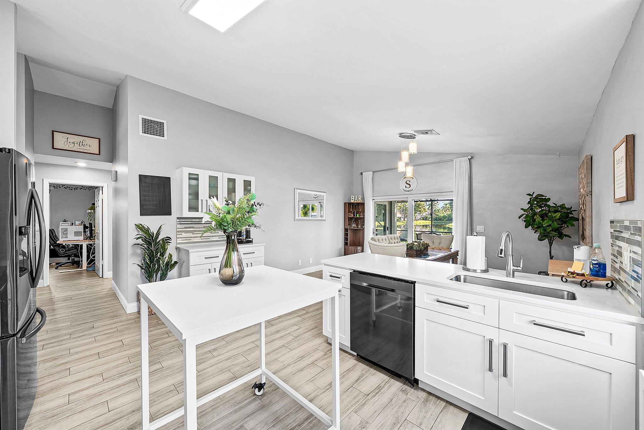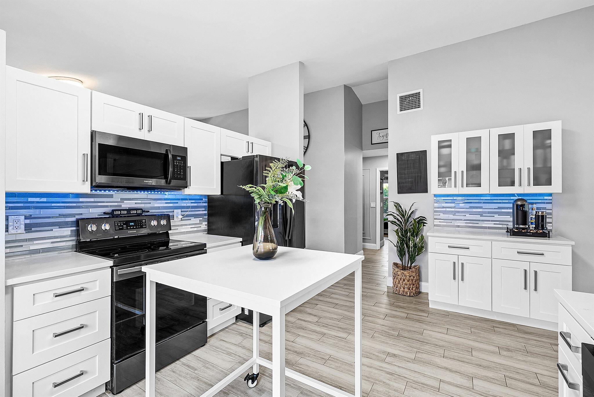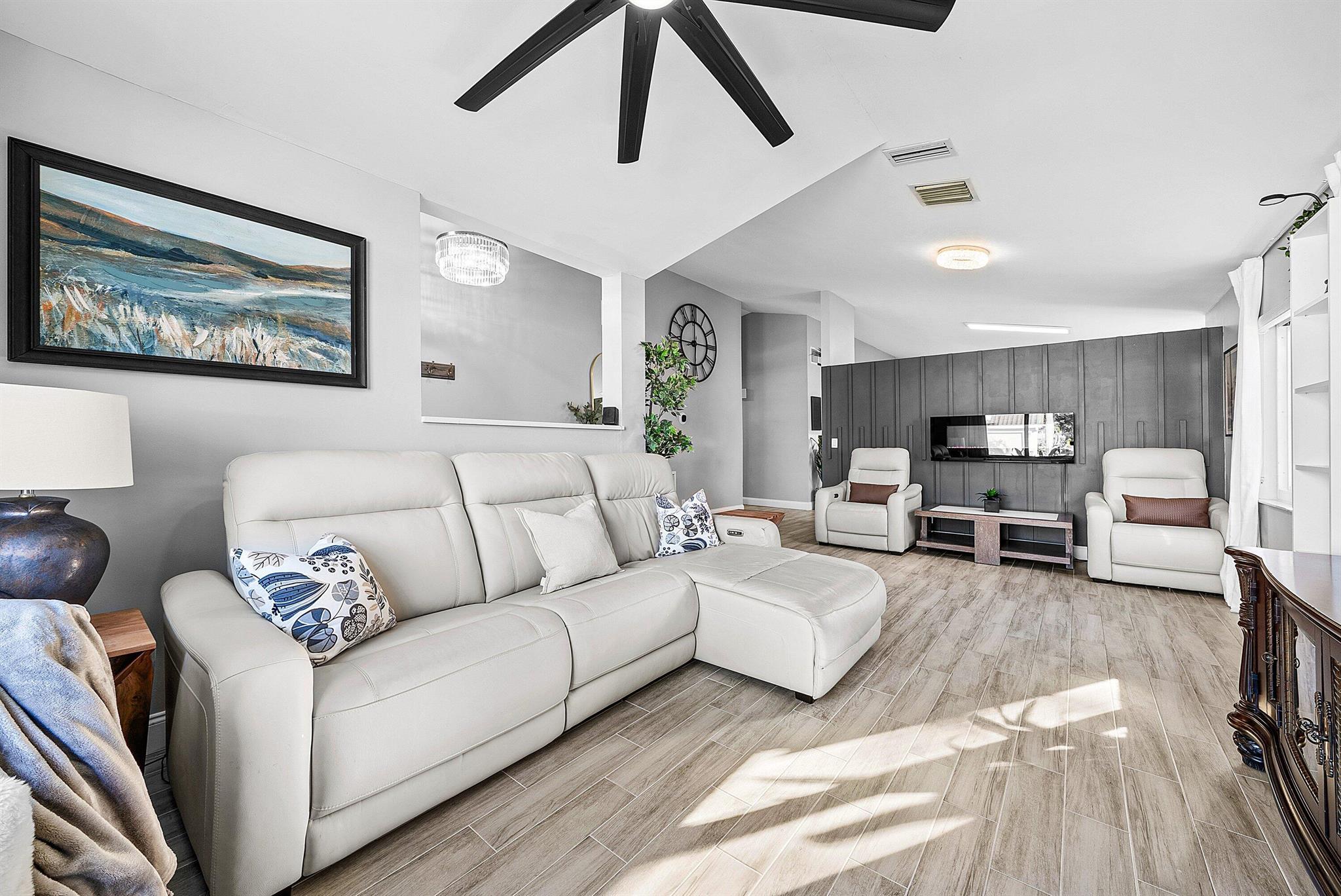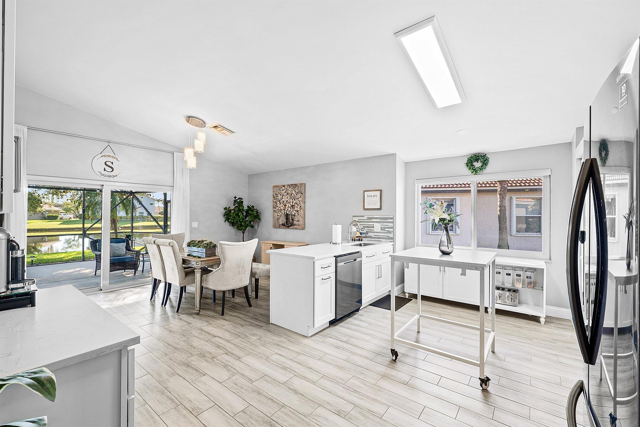 Welcome home to this beautifully renovated 3-bedroom, 2-bathroom lakefront residence with a 2-car garage, perfectly situated in the sought-after community of The Colors. This home combines comfort and style in an ideal location, zoned for top-rated schools including Crystal Lakes Elementary, Christa McAuliffe Middle, and Park Vista Community High. The moment you enter through the impact privacy glass front door, you'll immediately notice the refined touches and thoughtful updates throughout. Highlights include vertically laid wood look tile flooring, 10 foot vaulted ceilings, and updated trim, lighting, and fixtures that create a warm and contemporary feel. Significant updates include a full remodel of the floors, kitchen, and bathrooms (2021), impact windows and doors,
