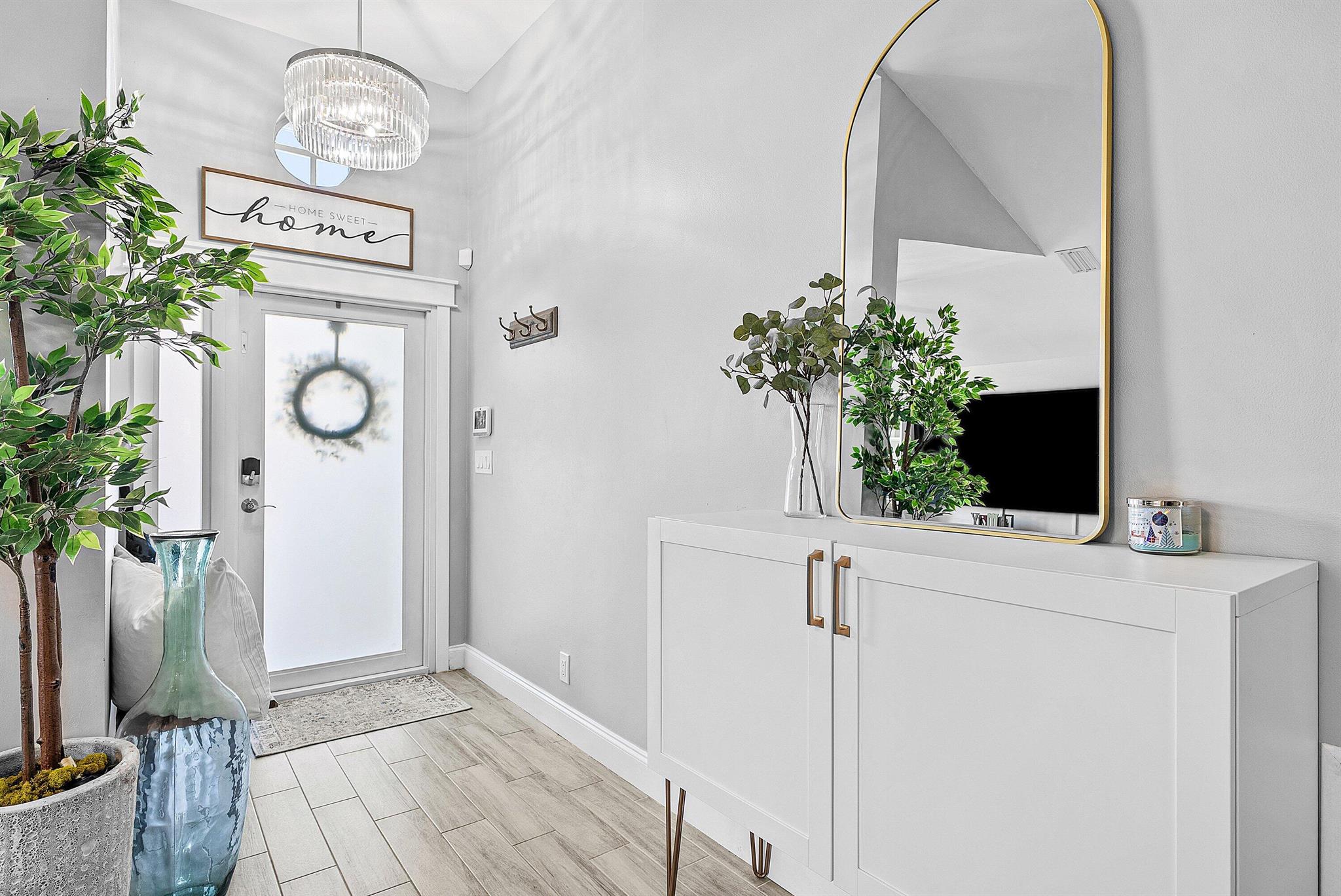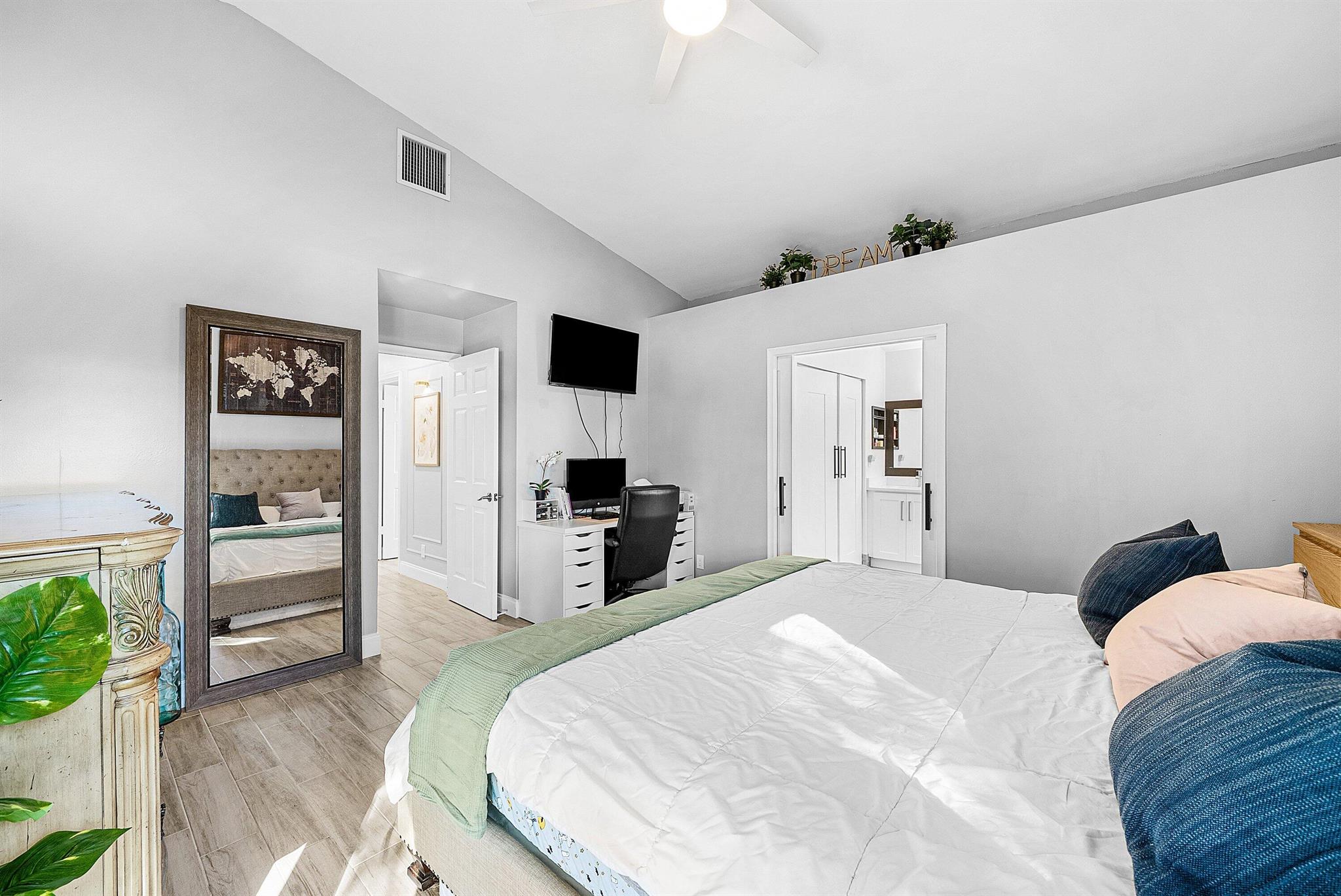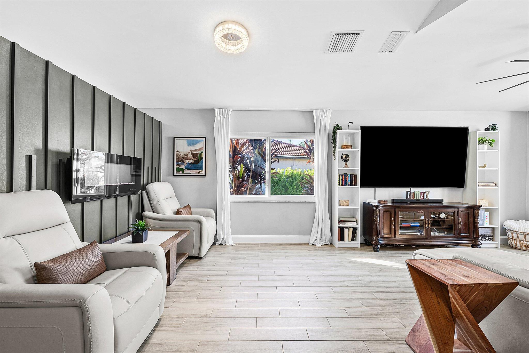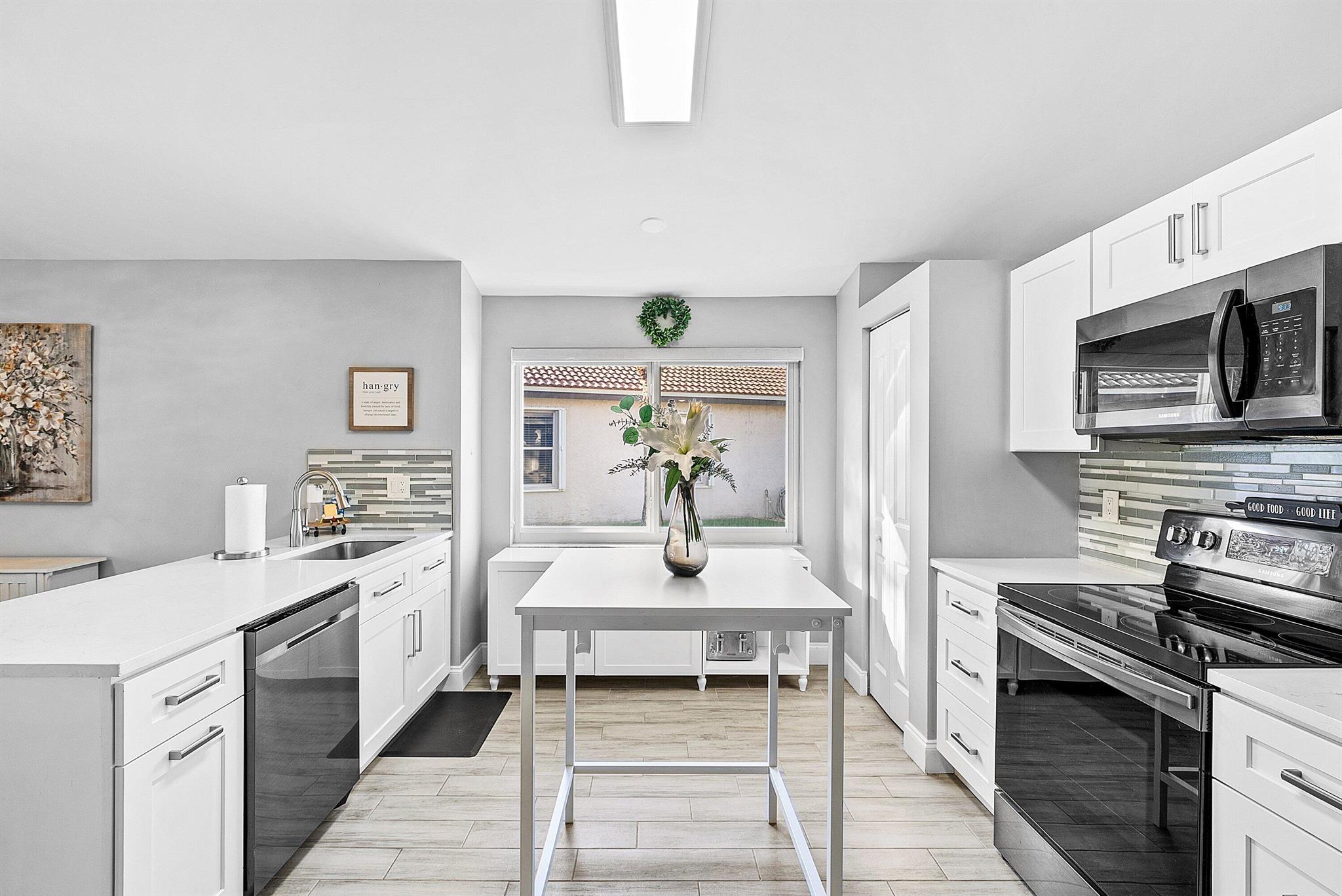 Welcome home to this beautifully renovated 3-bedroom, 2-bathroom lakefront residence with a 2-car garage, perfectly situated in the sought-after community of The Colors. This home combines comfort and style in an ideal location, zoned for top-rated schools including Crystal Lakes Elementary, Christa McAuliffe Middle, and Park Vista Community High. The moment you enter through the impact privacy glass front door, you'll immediately notice the refined touches and thoughtful updates throughout. Highlights include vertically laid wood look tile flooring, 10 foot vaulted ceilings, and updated trim, lighting, and fixtures that create a warm and contemporary feel. Significant updates include a full remodel of the floors, kitchen, and bathrooms (2021), impact windows and doors,