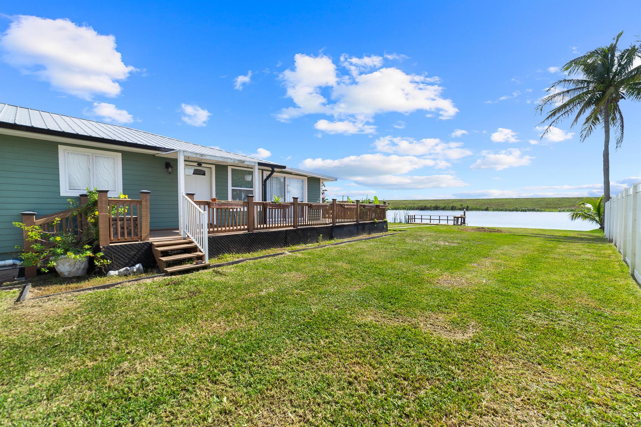 Experience 75' lakefront living at its finest with this beautiful 3-bedroom, 2-bath home on Lake Okeechobee. Located on the north side of the levee, the property offers direct access to the lake via a private community canal. Enjoy breathtaking sunsets from the south-facing deck or your own private dock, creating the perfect backdrop for relaxation and outdoor living. The attached carport accommodates two vehicles, with an additional parking pad ideal for an RV or boat. Known for some of the best bass fishing in Florida, Lake Okeechobee offers an unbeatable lifestyle for outdoor enthusiasts. Inside, the home features rustic wood-look laminate flooring throughout the main living areas and an open floor plan that enhances its spacious, inviting feel.