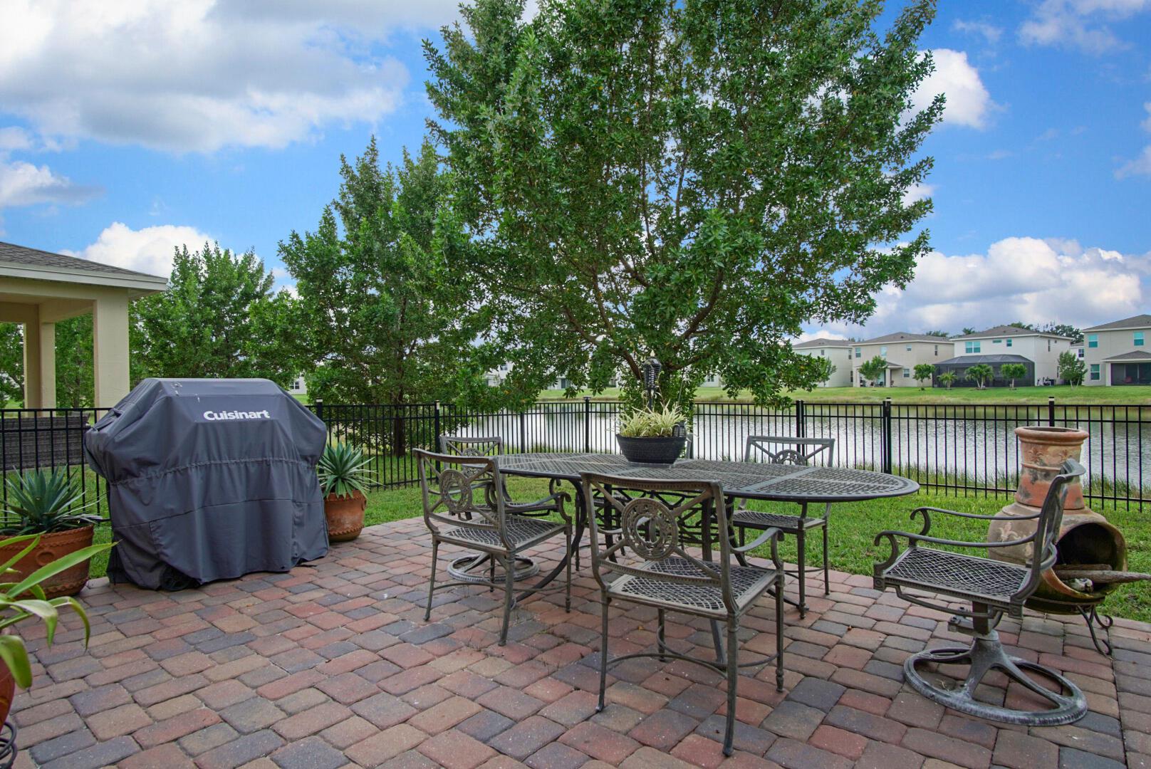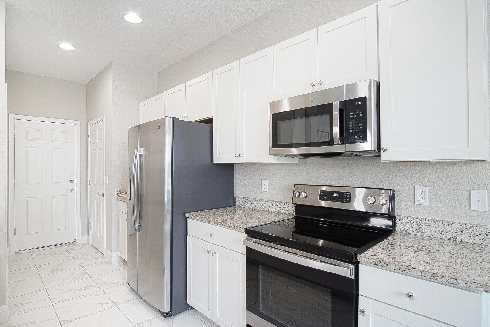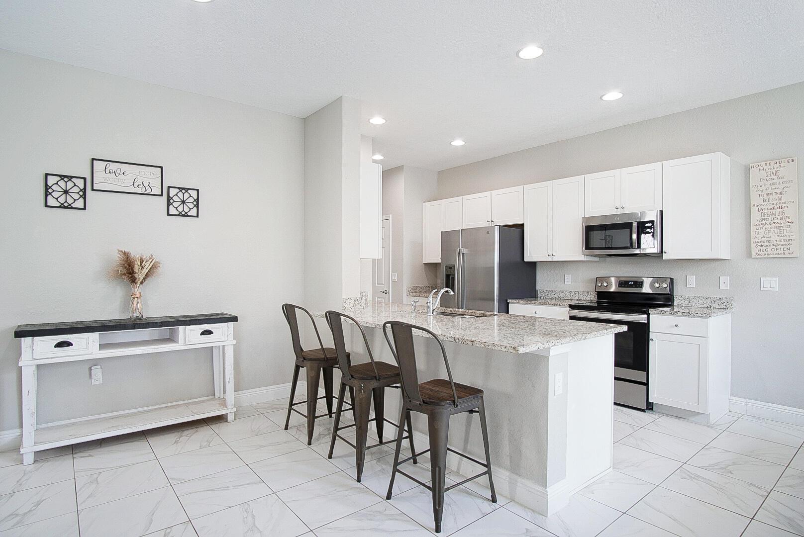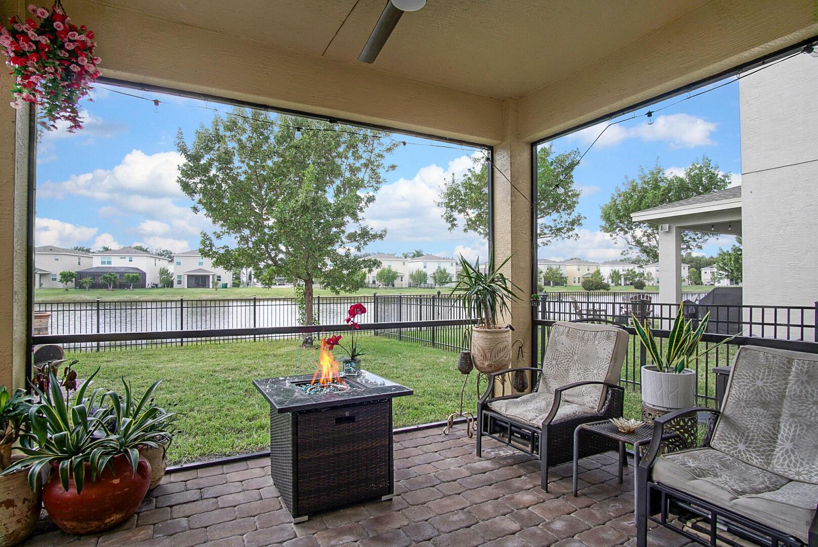 With well over 2000 square feet, this spacious lakefront home is a stunner. Built in 2021, you'll love the wall-to-wall white tile flooring on the main level, granite countertops in the kitchen, and a matching stainless steel appliance package. The open layout allows loads of natural light in, and your backyard views include the lake, a screened patio with paver flooring, black metal fencing, and an oversized paver pad for your hot tub and grilling. The dining and family rooms offer endless space, and 10' ceilings make it feel even larger. Walk upstairs and you'll love the large second family room and 3 bedrooms. The views of the lake from the master bedroom are my favorite, but the massive walk in closet is a close second. The glass front shower is adorned in matching white tile, and