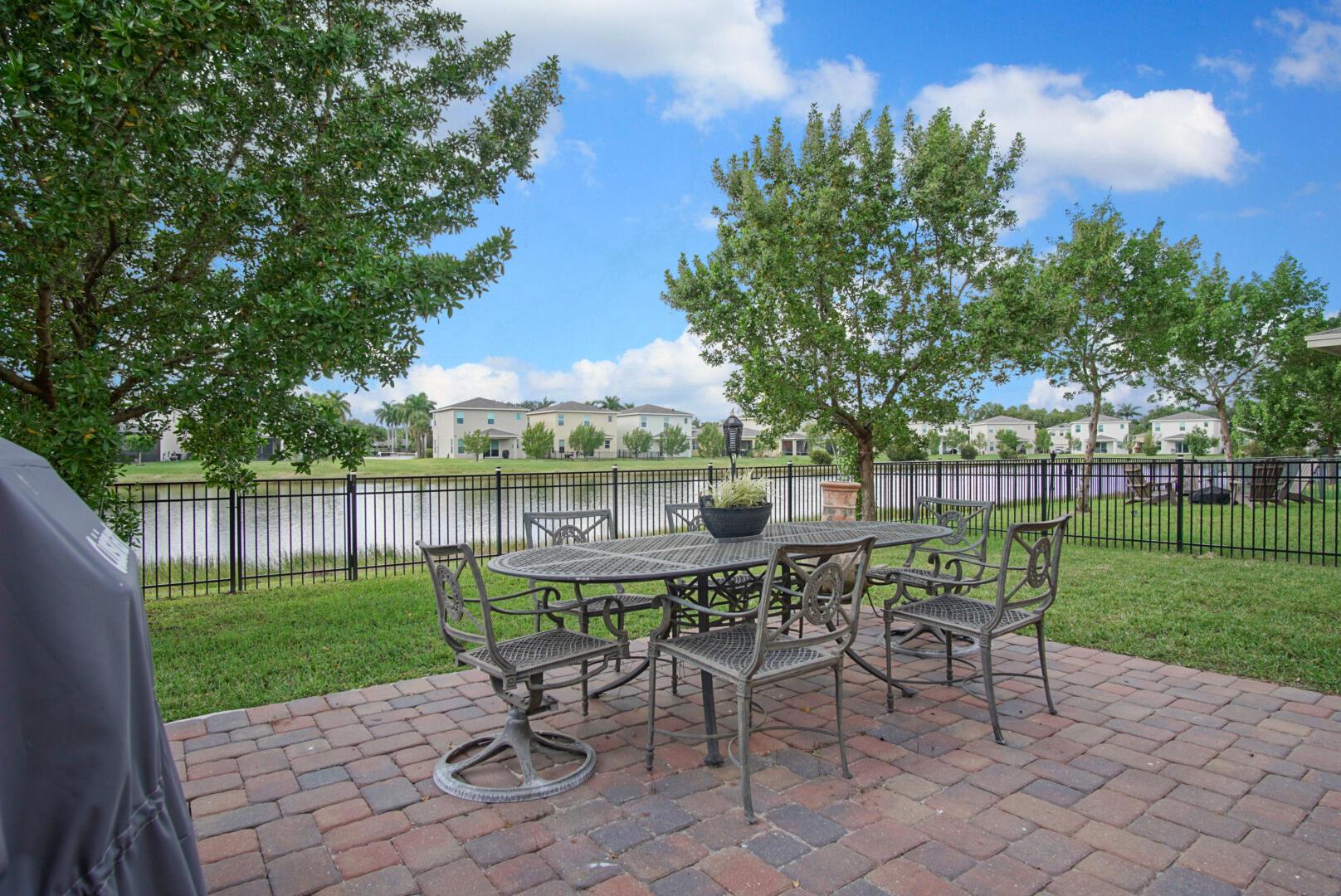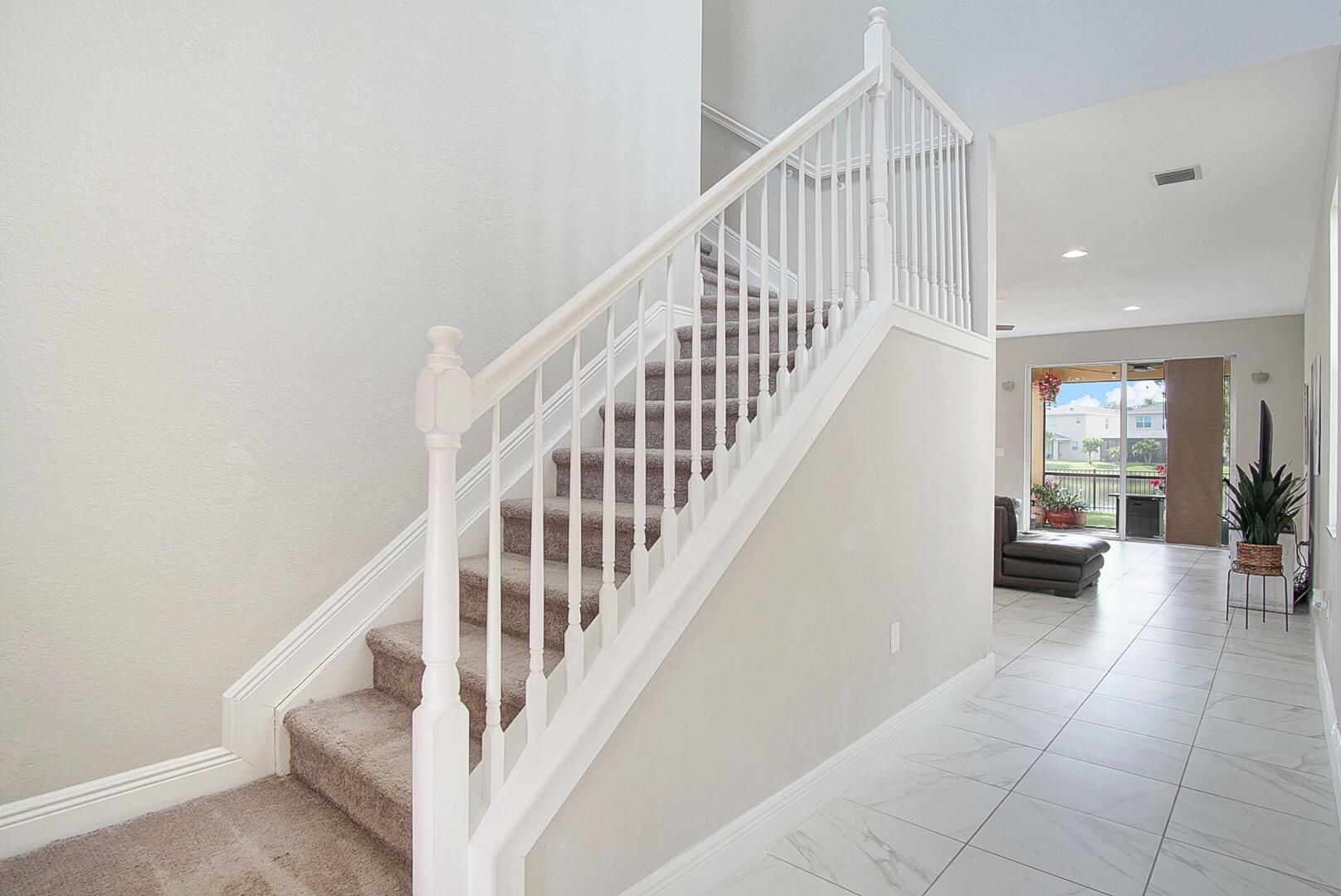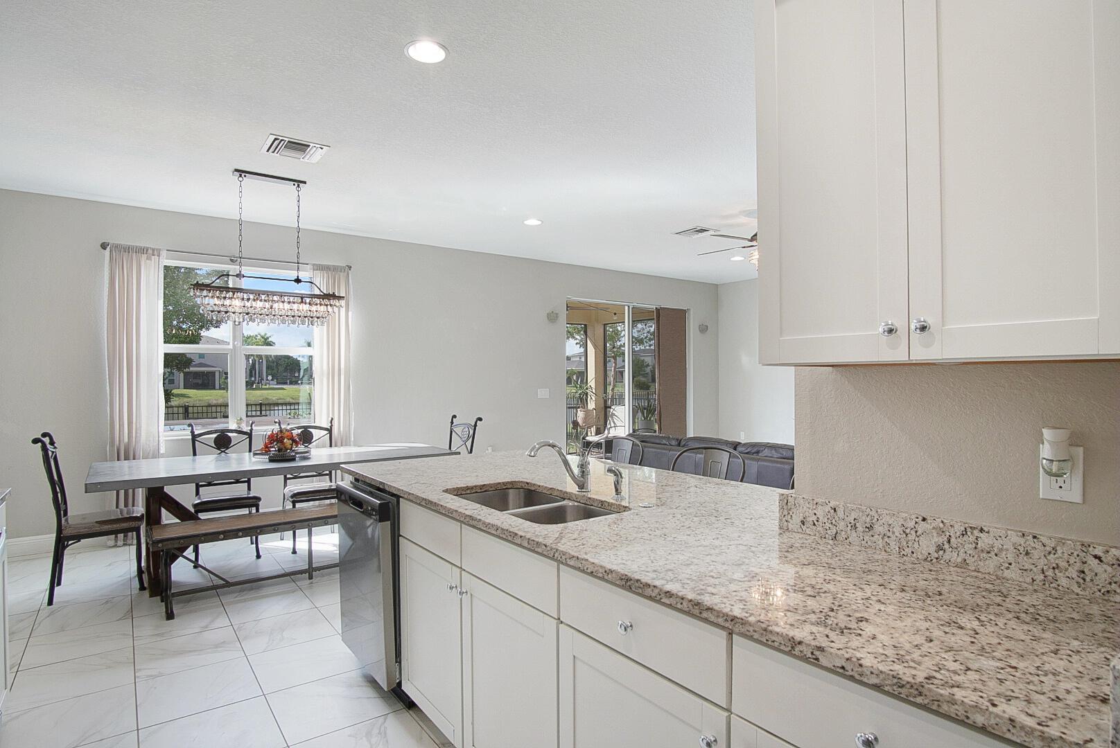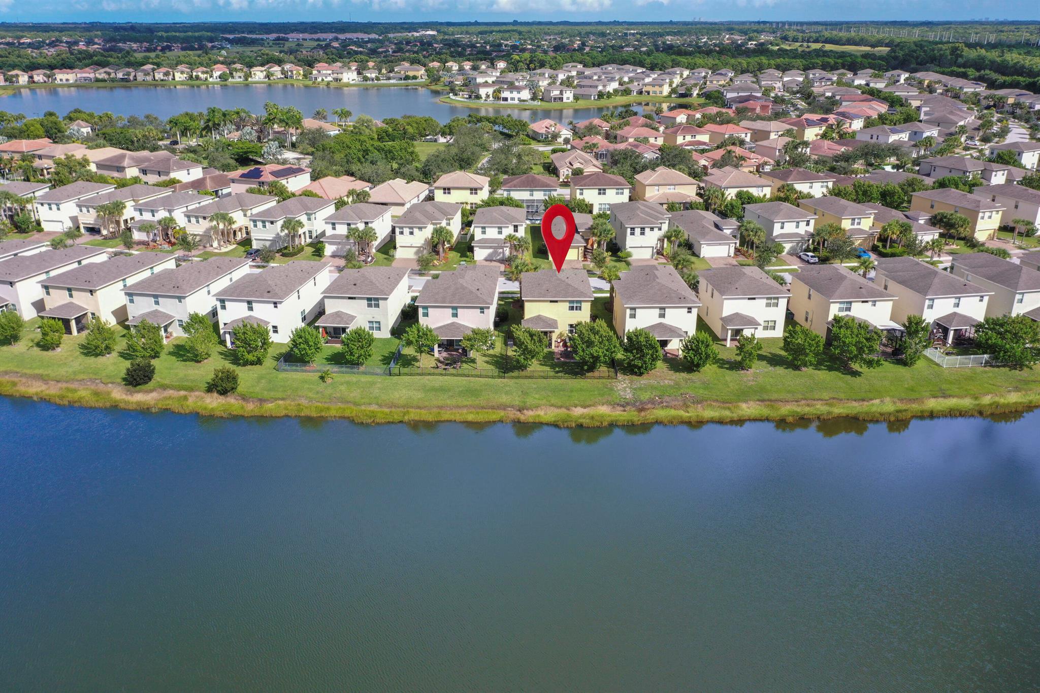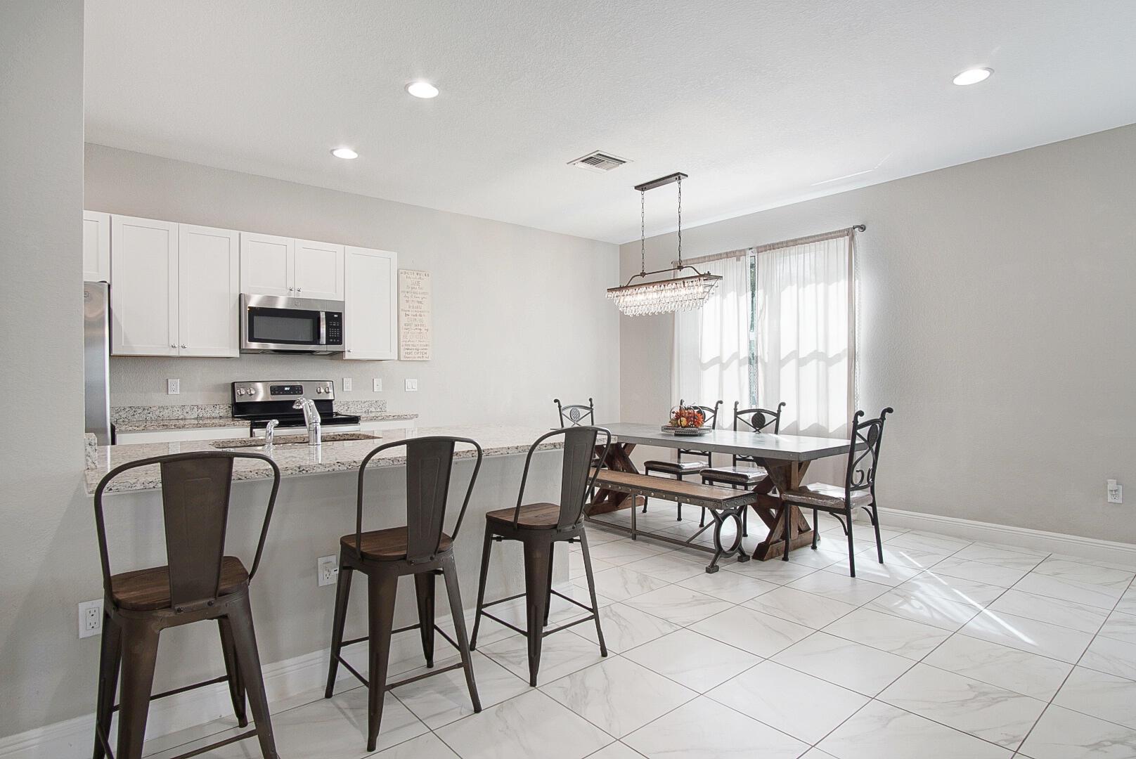 With well over 2000 square feet, this spacious lakefront home is a stunner. Built in 2021, you'll love the wall-to-wall white tile flooring on the main level, granite countertops in the kitchen, and a matching stainless steel appliance package. The open layout allows loads of natural light in, and your backyard views include the lake, a screened patio with paver flooring, black metal fencing, and an oversized paver pad for your hot tub and grilling. The dining and family rooms offer endless space, and 10' ceilings make it feel even larger. Walk upstairs and you'll love the large second family room and 3 bedrooms. The views of the lake from the master bedroom are my favorite, but the massive walk in closet is a close second. The glass front shower is adorned in matching white tile, and