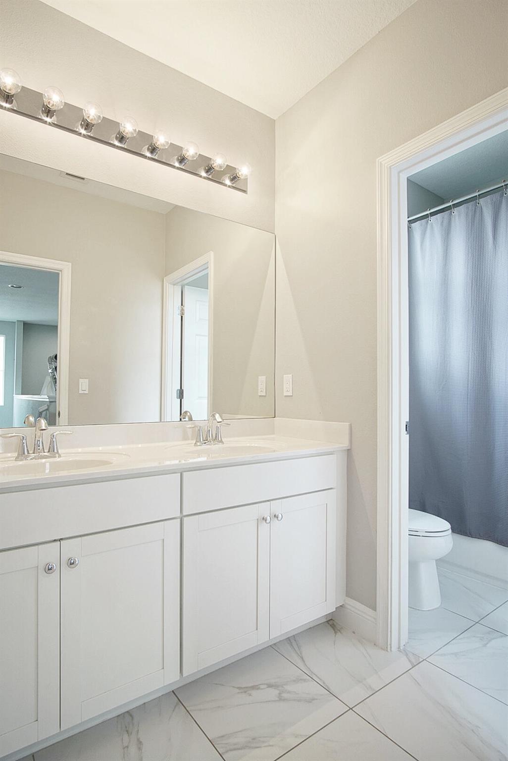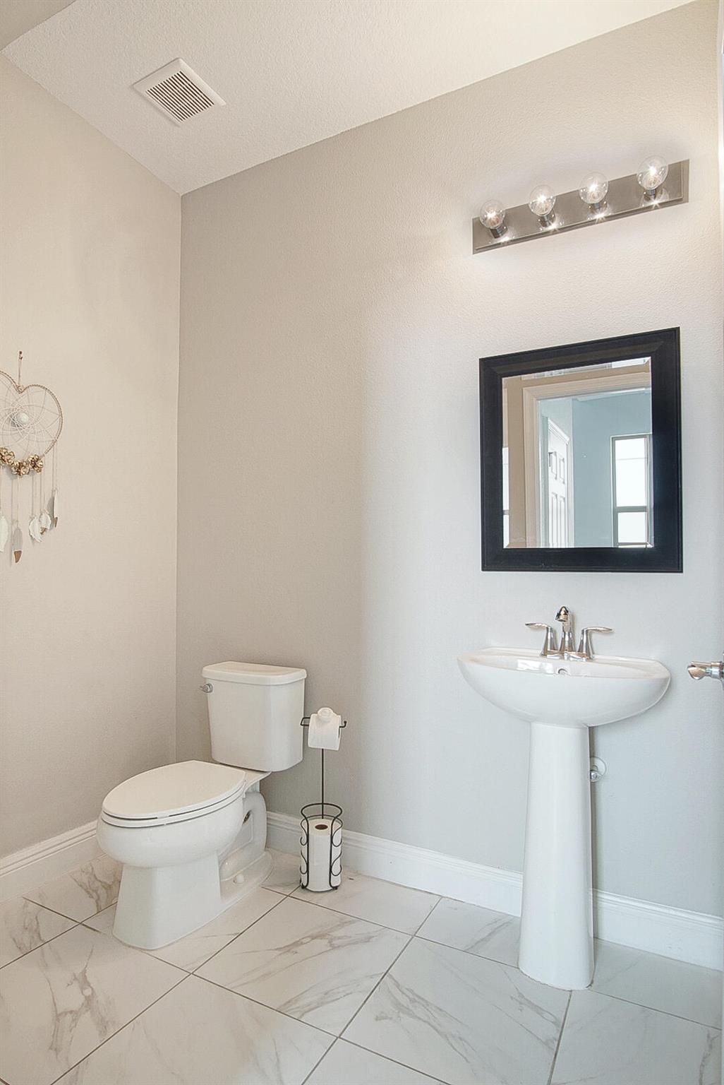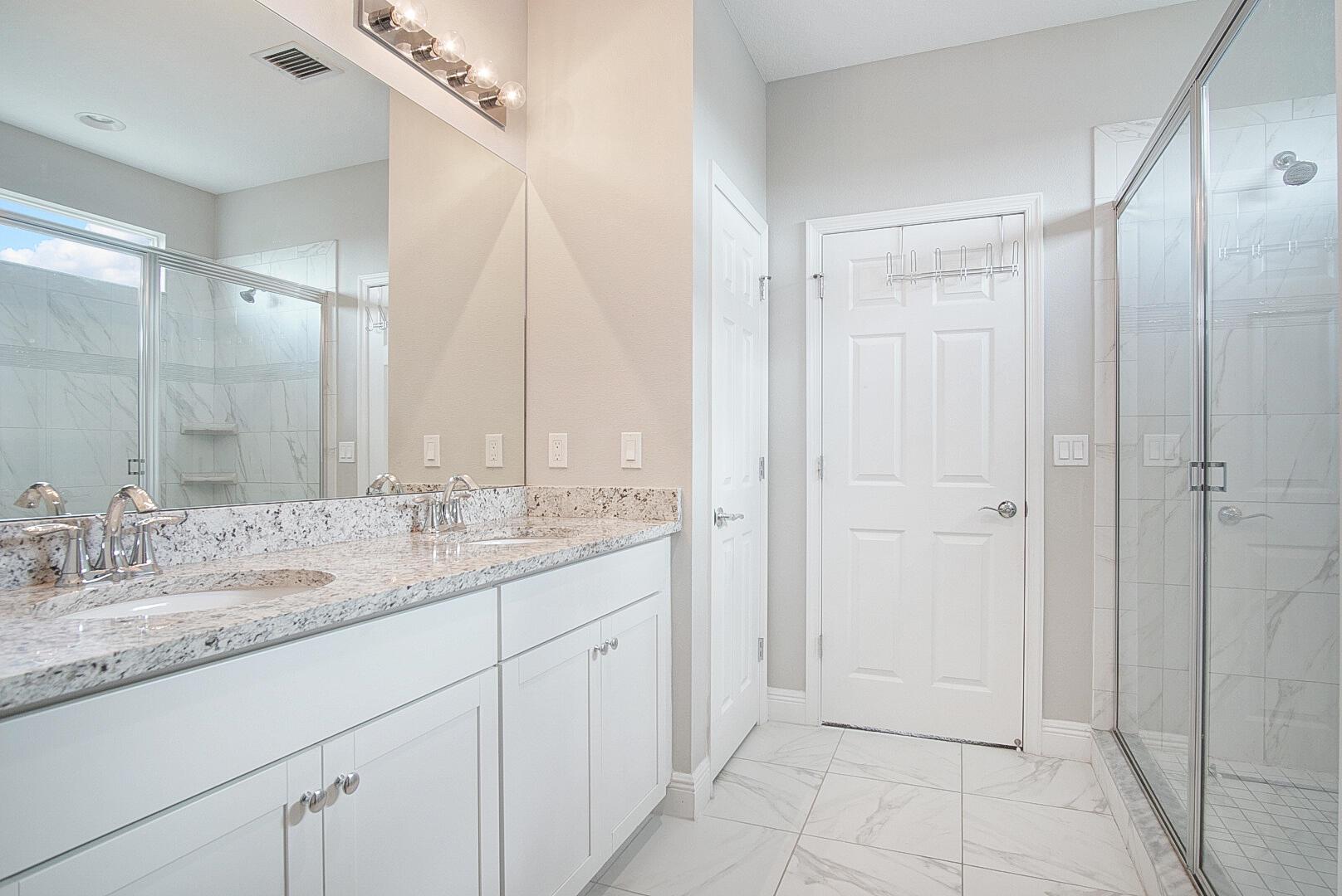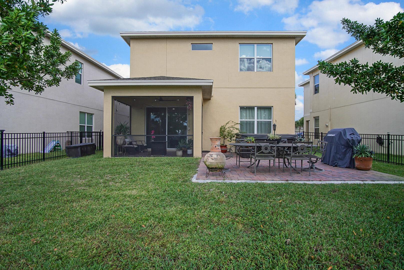 With well over 2000 square feet, this spacious lakefront home is a stunner. Built in 2021, you'll love the wall-to-wall white tile flooring on the main level, granite countertops in the kitchen, and a matching stainless steel appliance package. The open layout allows loads of natural light in, and your backyard views include the lake, a screened patio with paver flooring, black metal fencing, and an oversized paver pad for your hot tub and grilling. The dining and family rooms offer endless space, and 10' ceilings make it feel even larger. Walk upstairs and you'll love the large second family room and 3 bedrooms. The views of the lake from the master bedroom are my favorite, but the massive walk in closet is a close second. The glass front shower is adorned in matching white tile, and