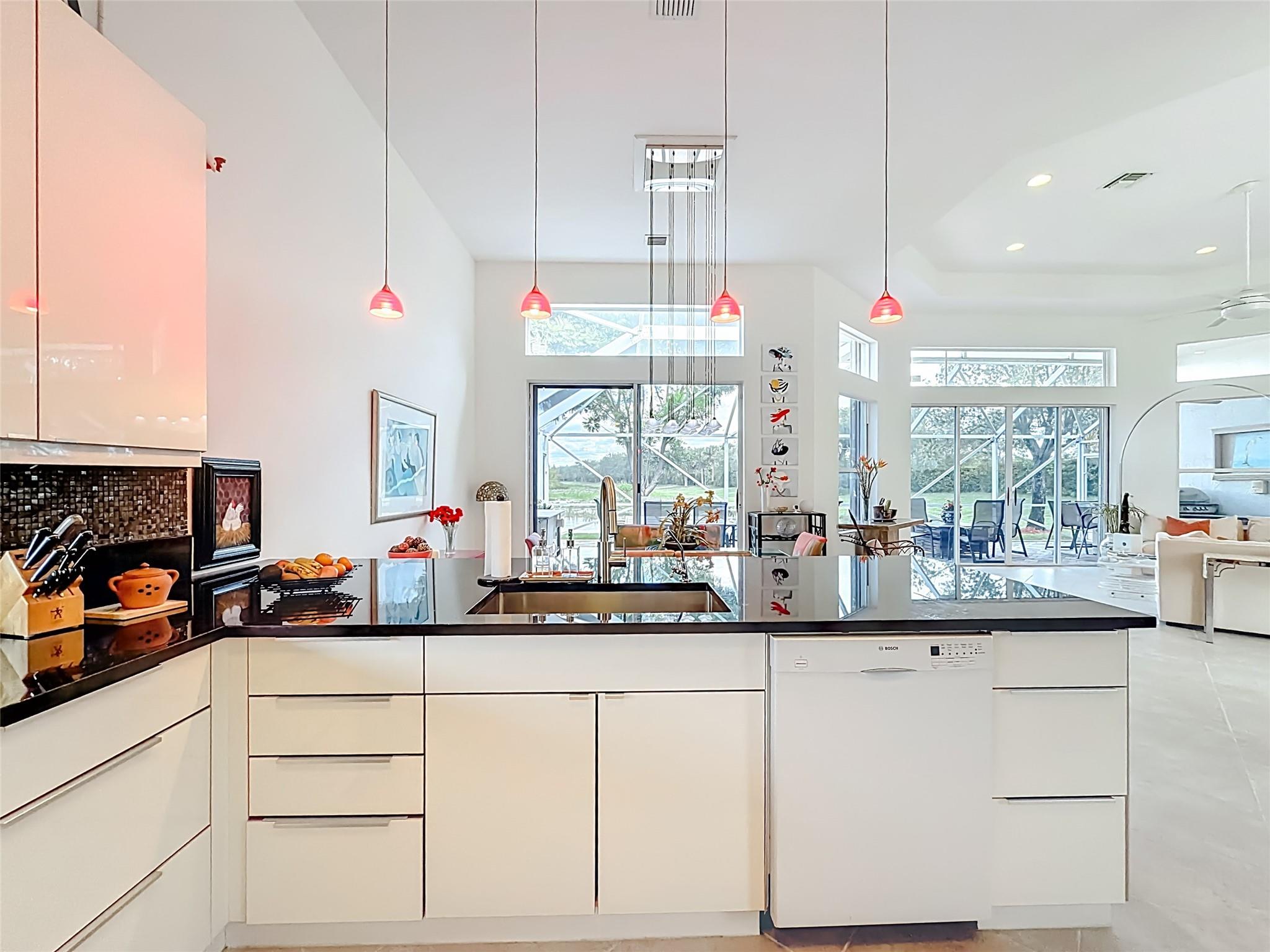 This home was purchased when built and the owner had custom changes made making it total open concept in the living area and some other surprises likely not seen in other homes. It has 2 full bedrooms + another bedroom that's a sitting room now and only needs an armoire + another room that's a den, craft room, grandkids playroom. The view when you walk thru the front door is of the lake and no neighbors behind you. They sliding glass doors are throughout the entire living space opening to an expansive screened patio with a built-in barbeque grill. This home is tastefully decorated and much of the furniture is negotiable. DON'T MISS SEEING THIS ONE!!