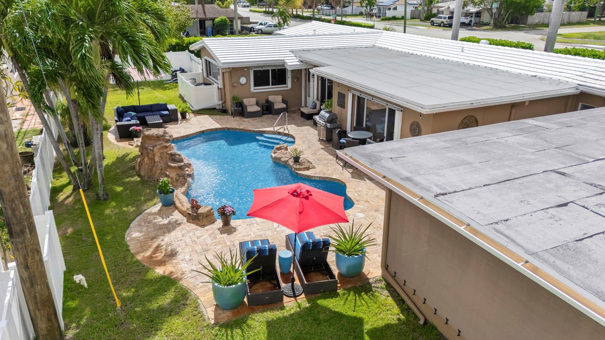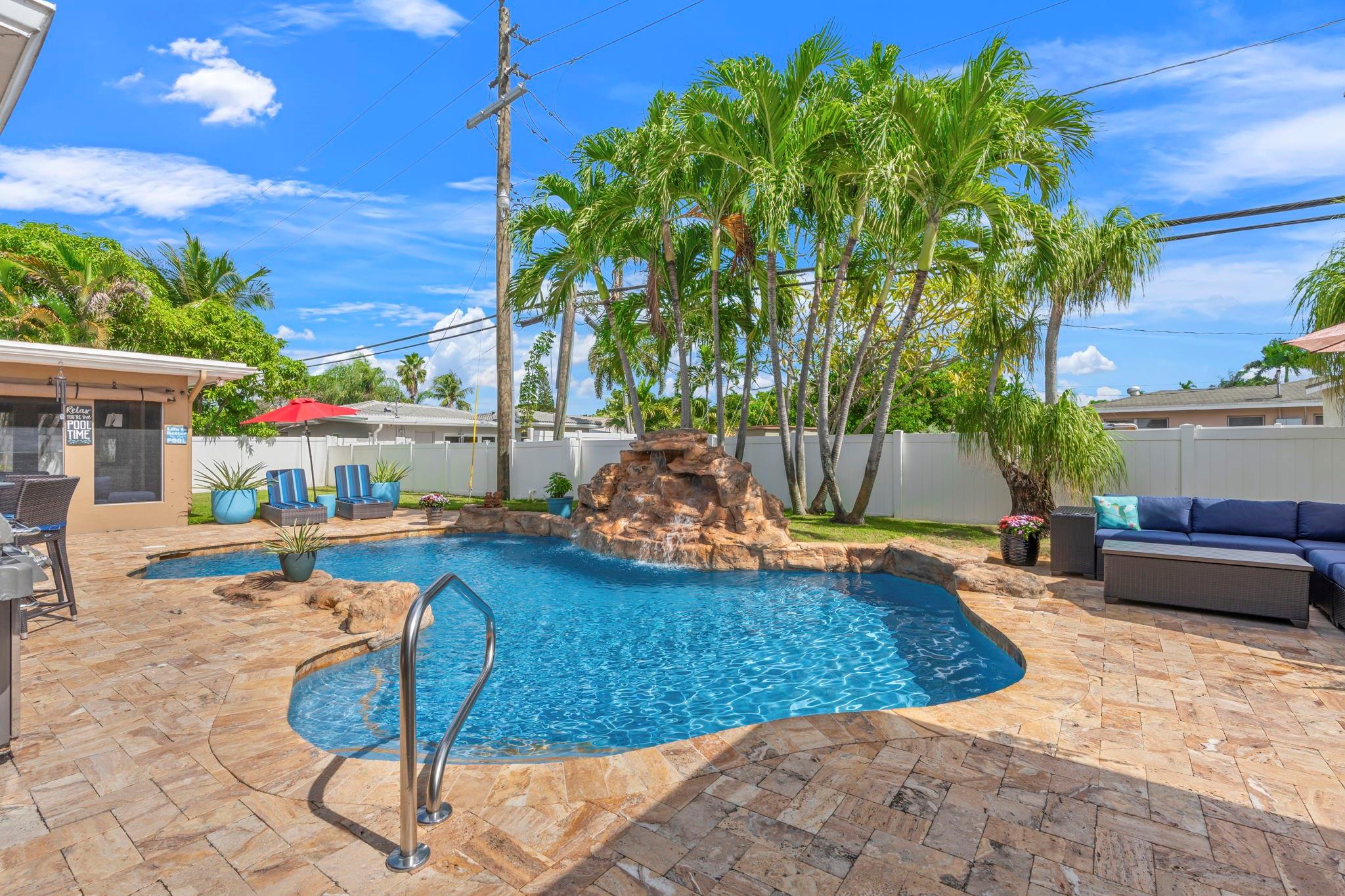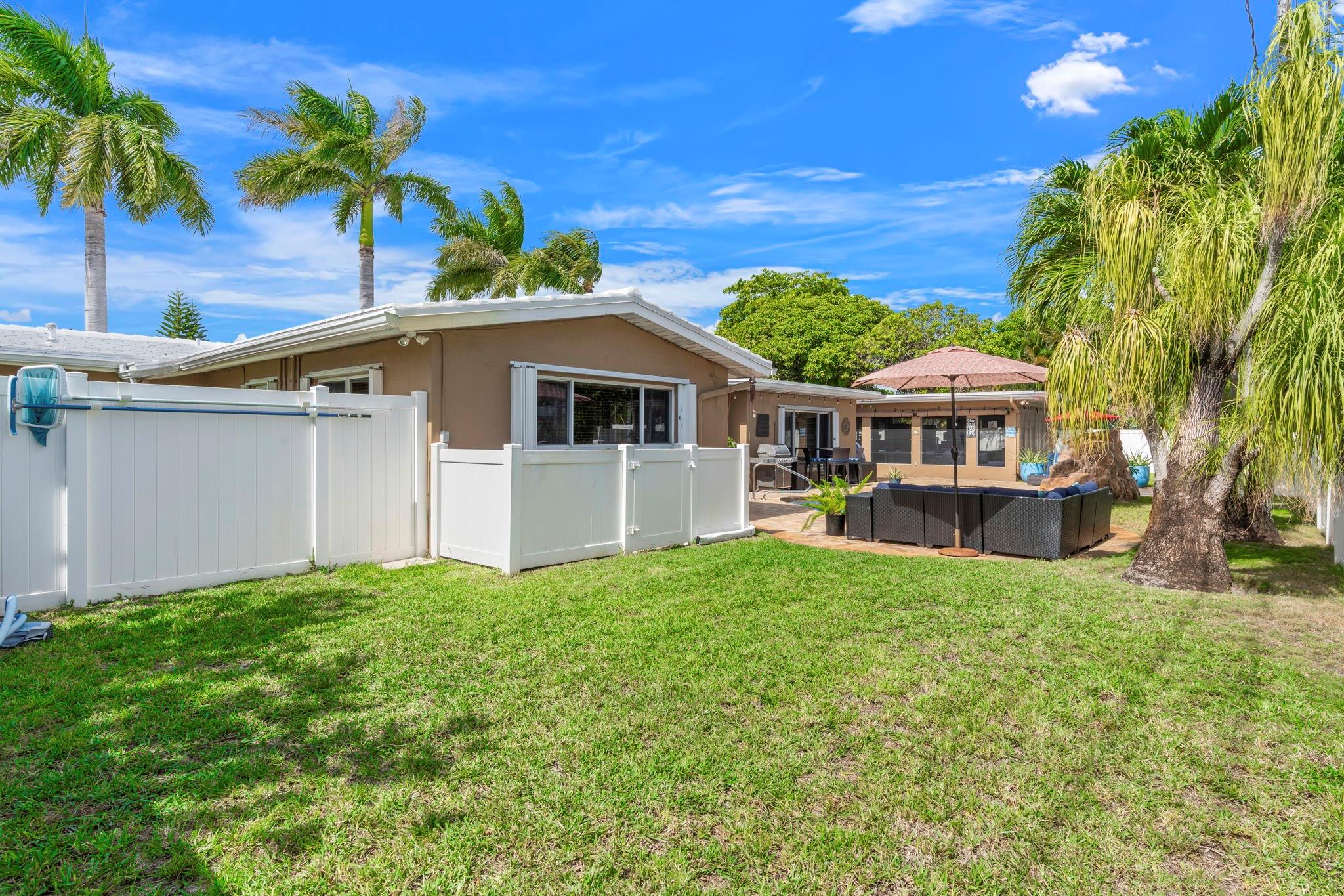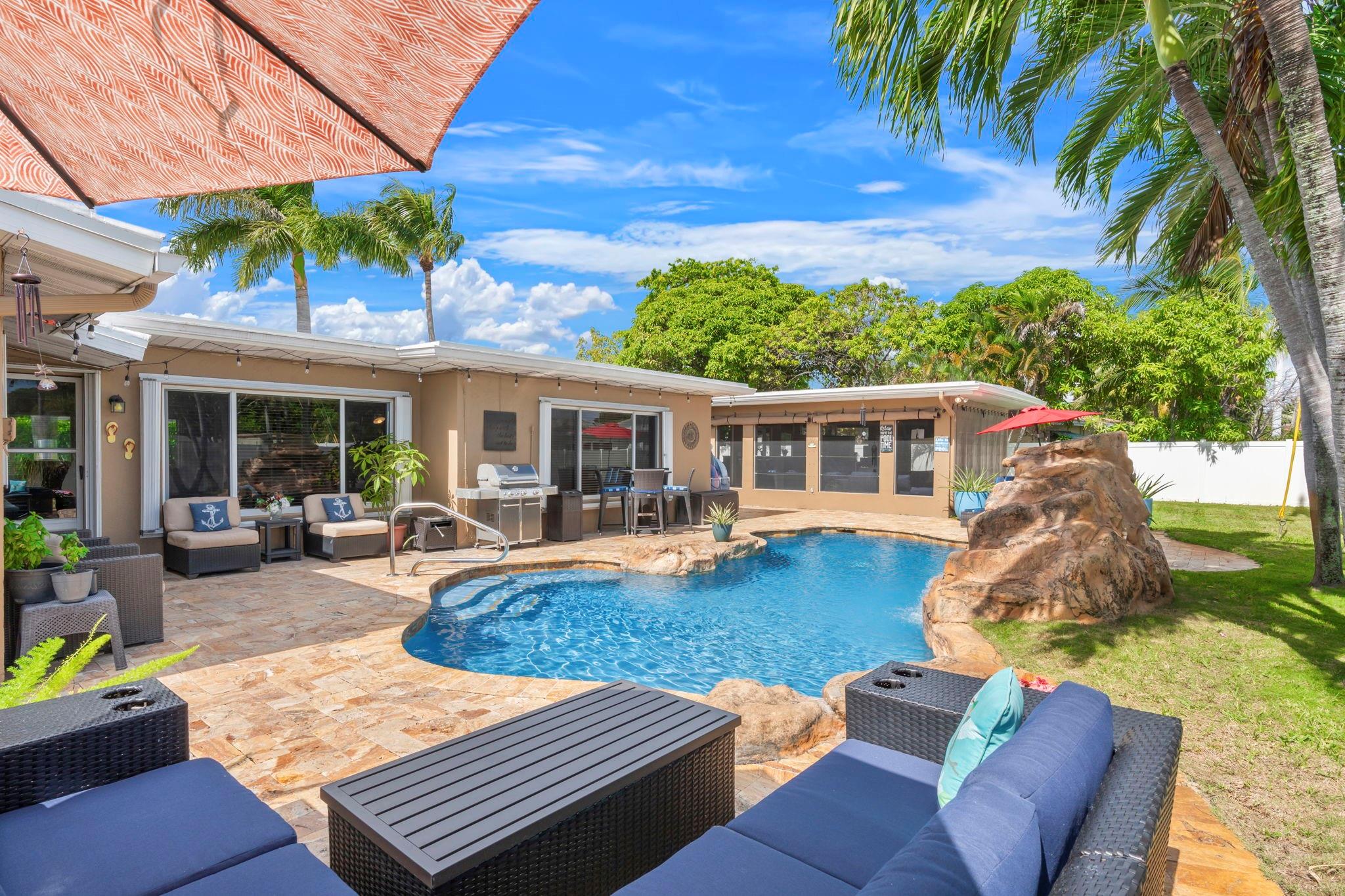 Situated on a 13,000 SF double lot, this home features an expansive yard, resort-style heated/chilled saltwater pool w/waterfall. Interior is approximately 2,000 SF of living space with split bedroom plan with 3 bedrooms and 2 full baths plus a third cabana bath. Additional bonus room currently used as storage. Additional features include LVT flooring throughout, newer windows, and accordion shutters. Open layout with views of the yard and pool. Oversized screened pavilion (14x19) and covered dining, all equipped with KEVLAR HURRICANE FABRIC for full protection. NEW ROOF (2025). Whole-house GENERATOR (2024). HVAC (2024). Double CARPORT w/HURRICANE fabric. Transferable termite program &much more. Spectacular corner lot with access from NE 48th Street (not Andrews Ave as address indicates).
