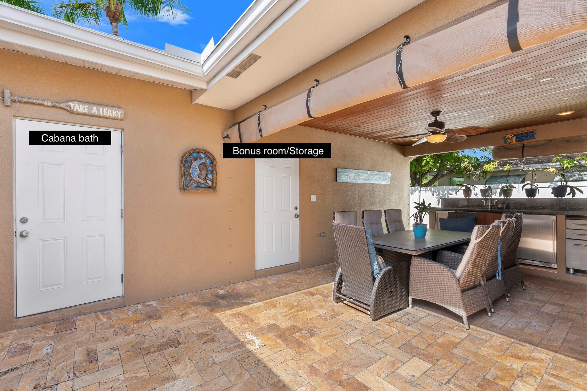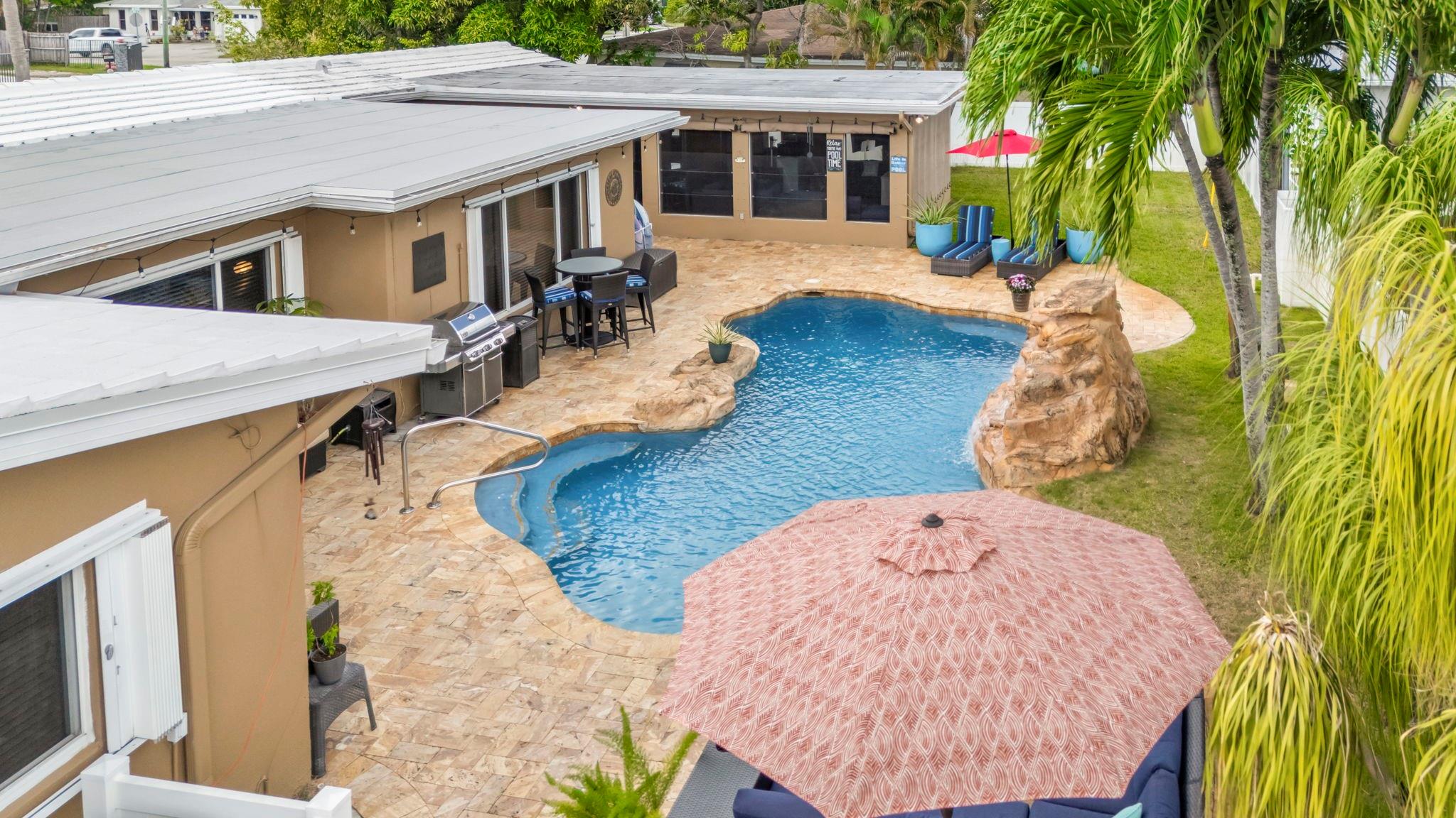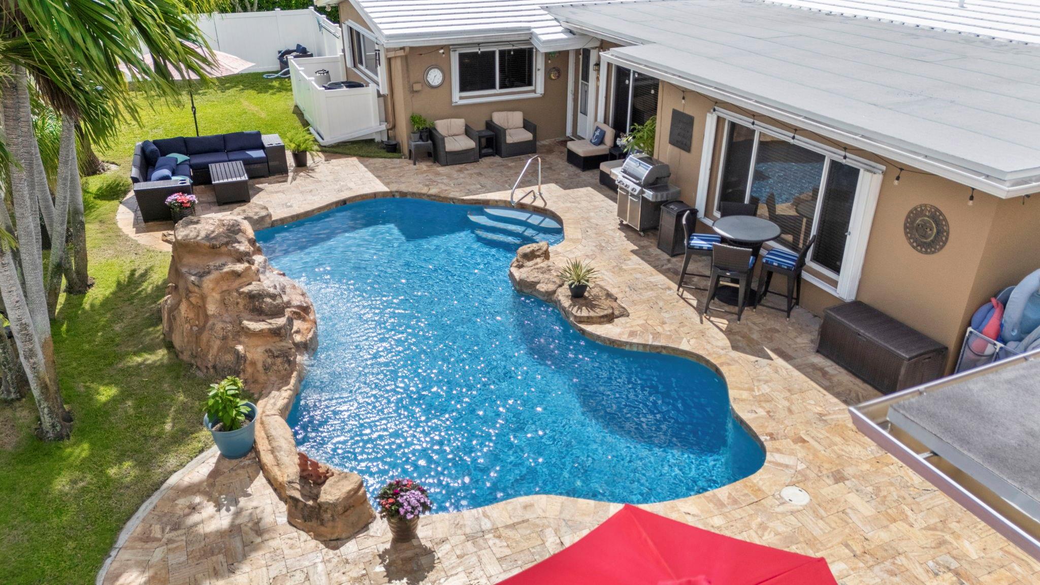 Situated on a 13,000 SF double lot, this home features an expansive yard, resort-style heated/chilled saltwater pool w/waterfall. Interior is approximately 2,000 SF of living space with split bedroom plan with 3 bedrooms and 2 full baths plus a third cabana bath. Additional bonus room currently used as storage. Additional features include LVT flooring throughout, newer windows, and accordion shutters. Open layout with views of the yard and pool. Oversized screened pavilion (14x19) and covered dining, all equipped with KEVLAR HURRICANE FABRIC for full protection. NEW ROOF (2025). Whole-house GENERATOR (2024). HVAC (2024). Double CARPORT w/HURRICANE fabric. Transferable termite program &much more. Spectacular corner lot with access from NE 48th Street (not Andrews Ave as address indicates).