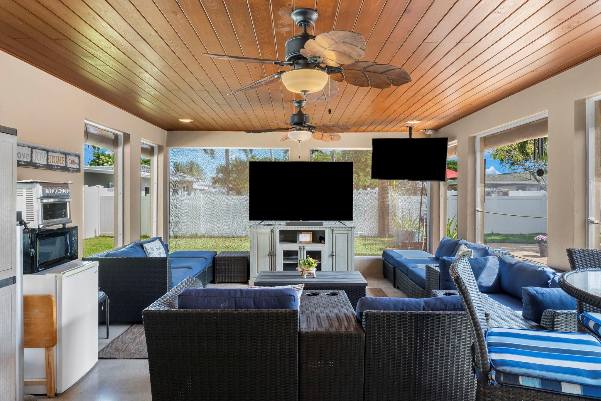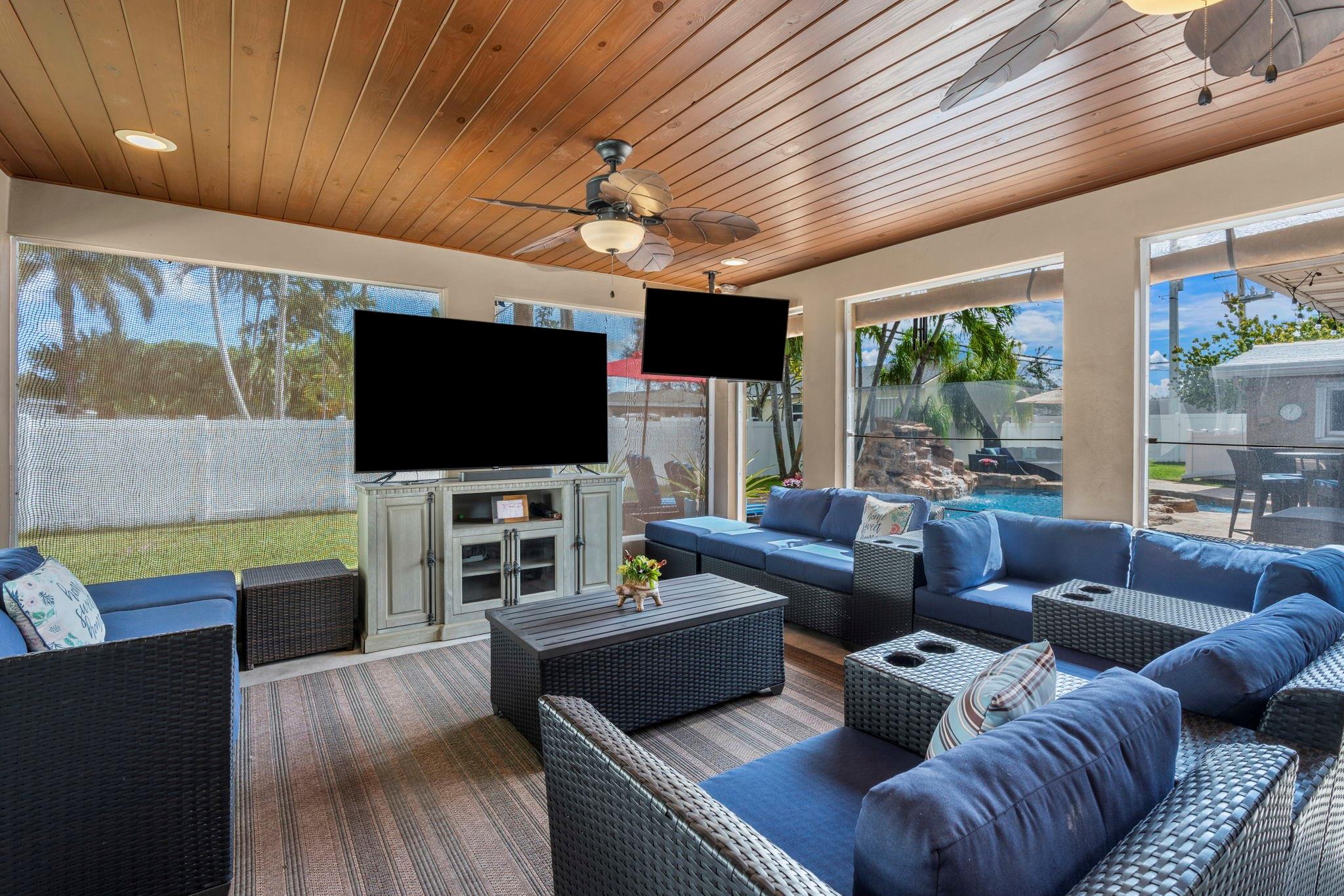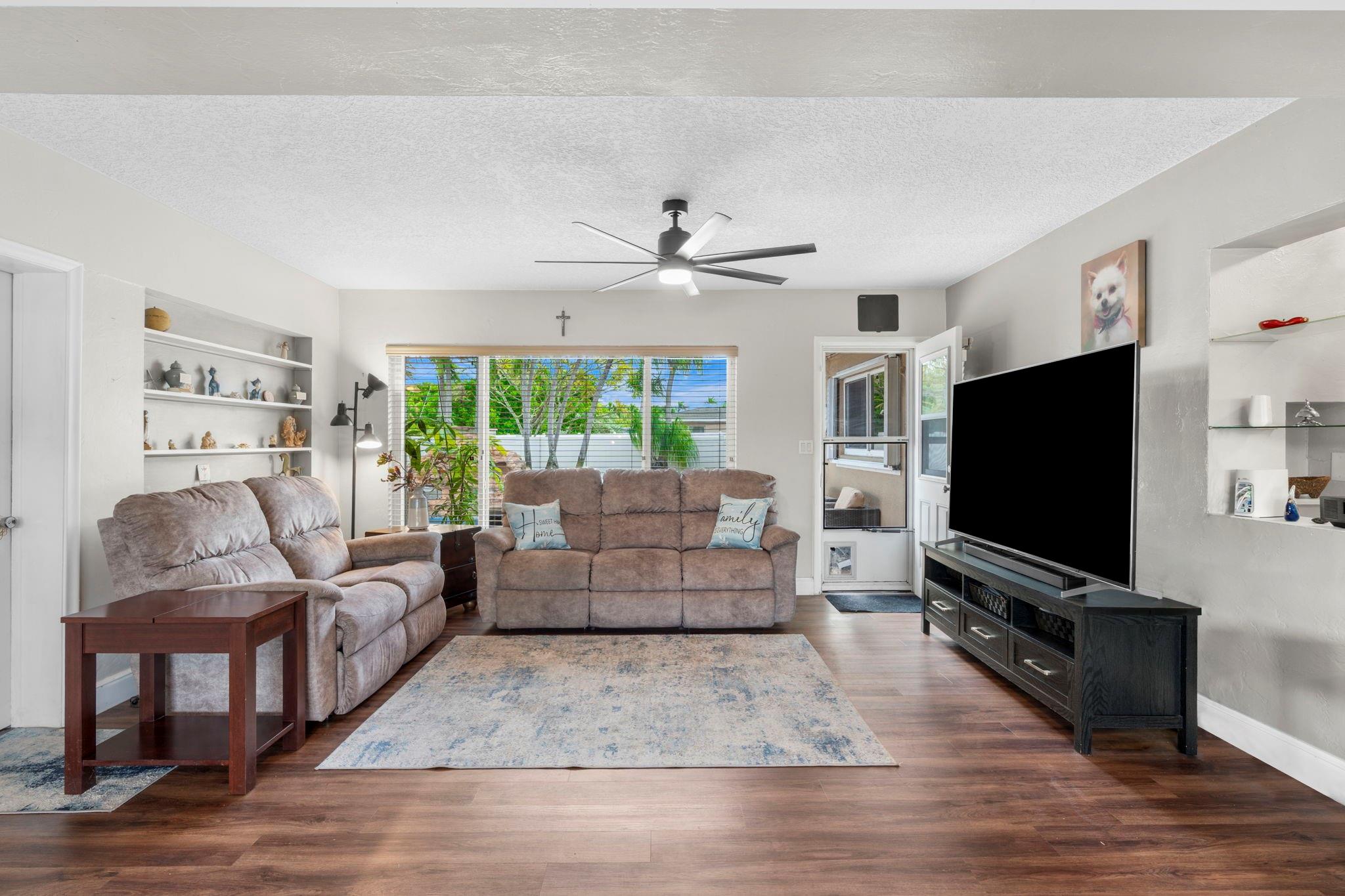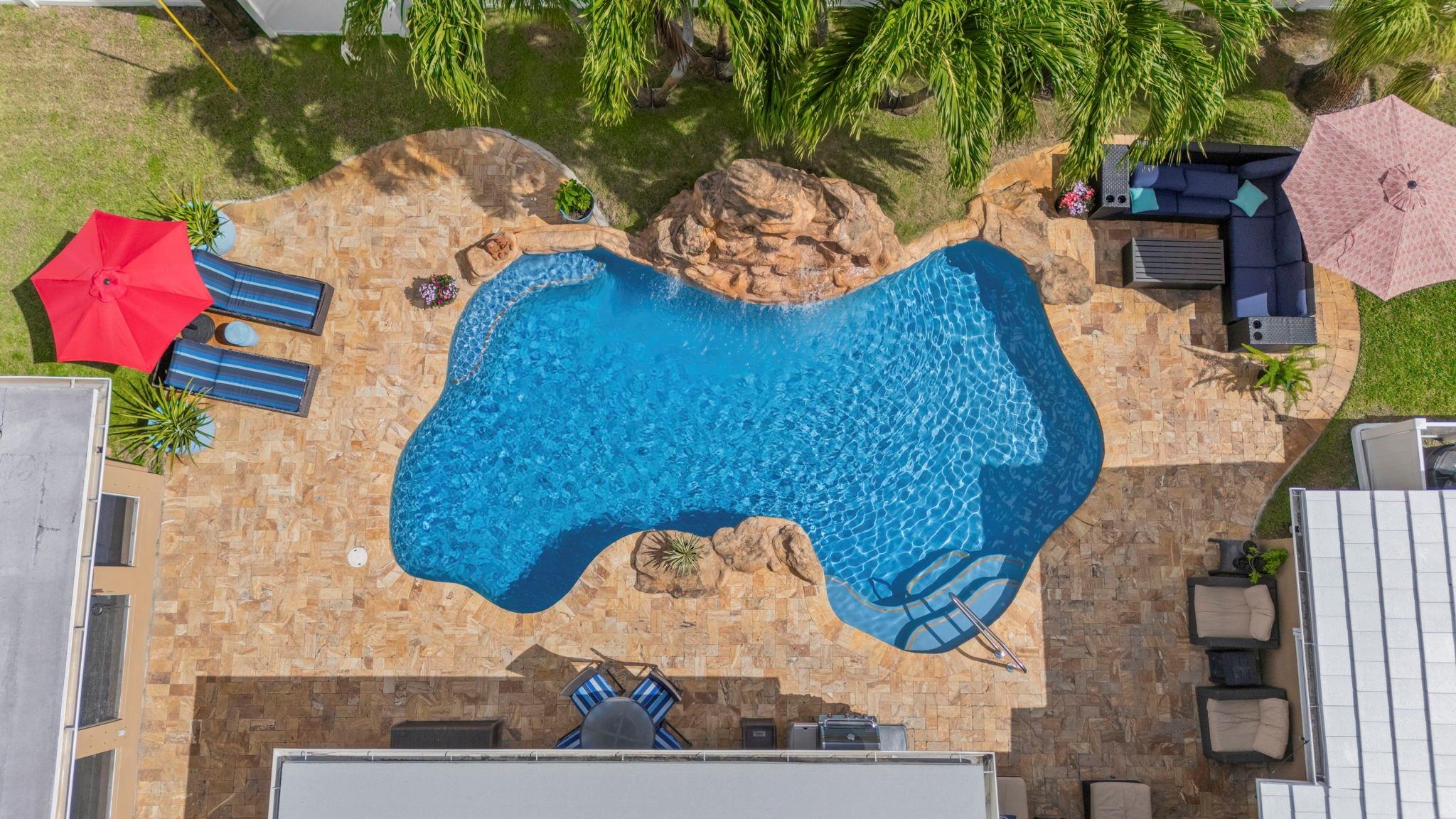 Situated on a 13,000 SF double lot, this home features an expansive yard, resort-style heated/chilled saltwater pool w/waterfall. Interior is approximately 2,000 SF of living space with split bedroom plan with 3 bedrooms and 2 full baths plus a third cabana bath. Additional bonus room currently used as storage. Additional features include LVT flooring throughout, newer windows, and accordion shutters. Open layout with views of the yard and pool. Oversized screened pavilion (14x19) and covered dining, all equipped with KEVLAR HURRICANE FABRIC for full protection. NEW ROOF (2025). Whole-house GENERATOR (2024). HVAC (2024). Double CARPORT w/HURRICANE fabric. Transferable termite program &much more. Spectacular corner lot with access from NE 48th Street (not Andrews Ave as address indicates).