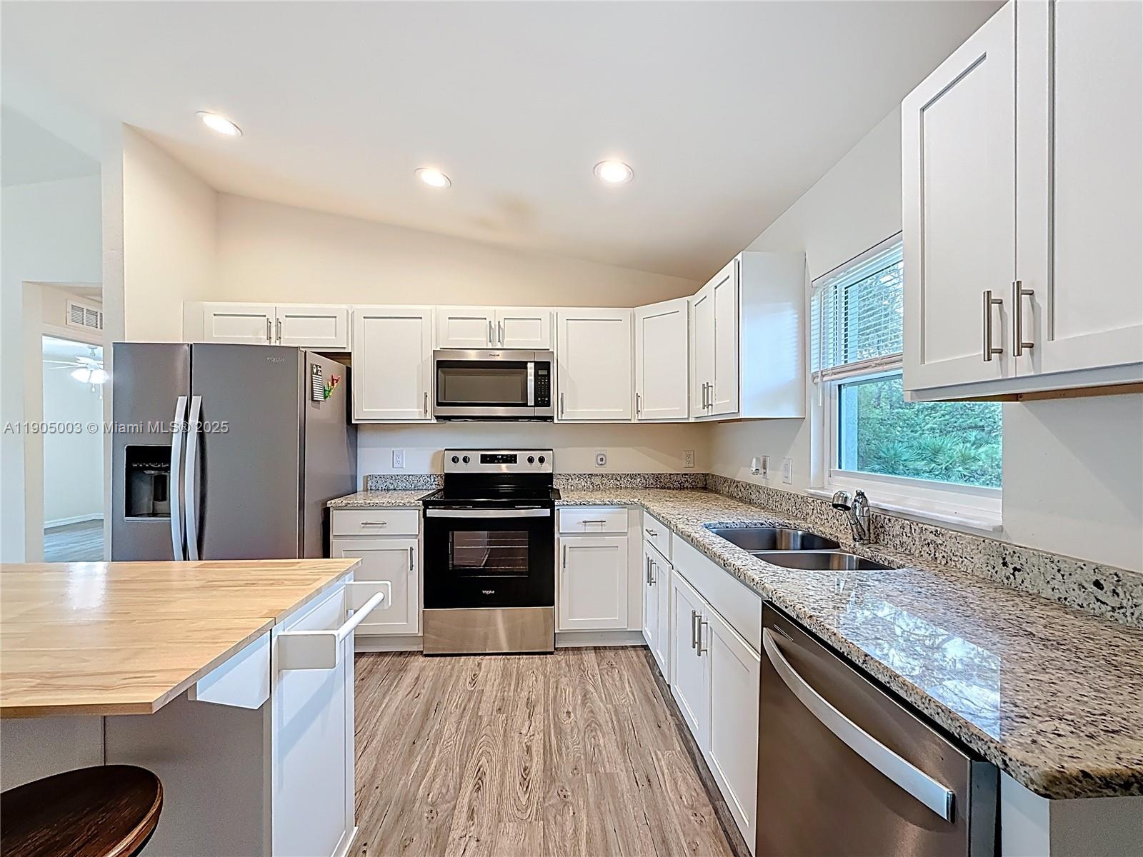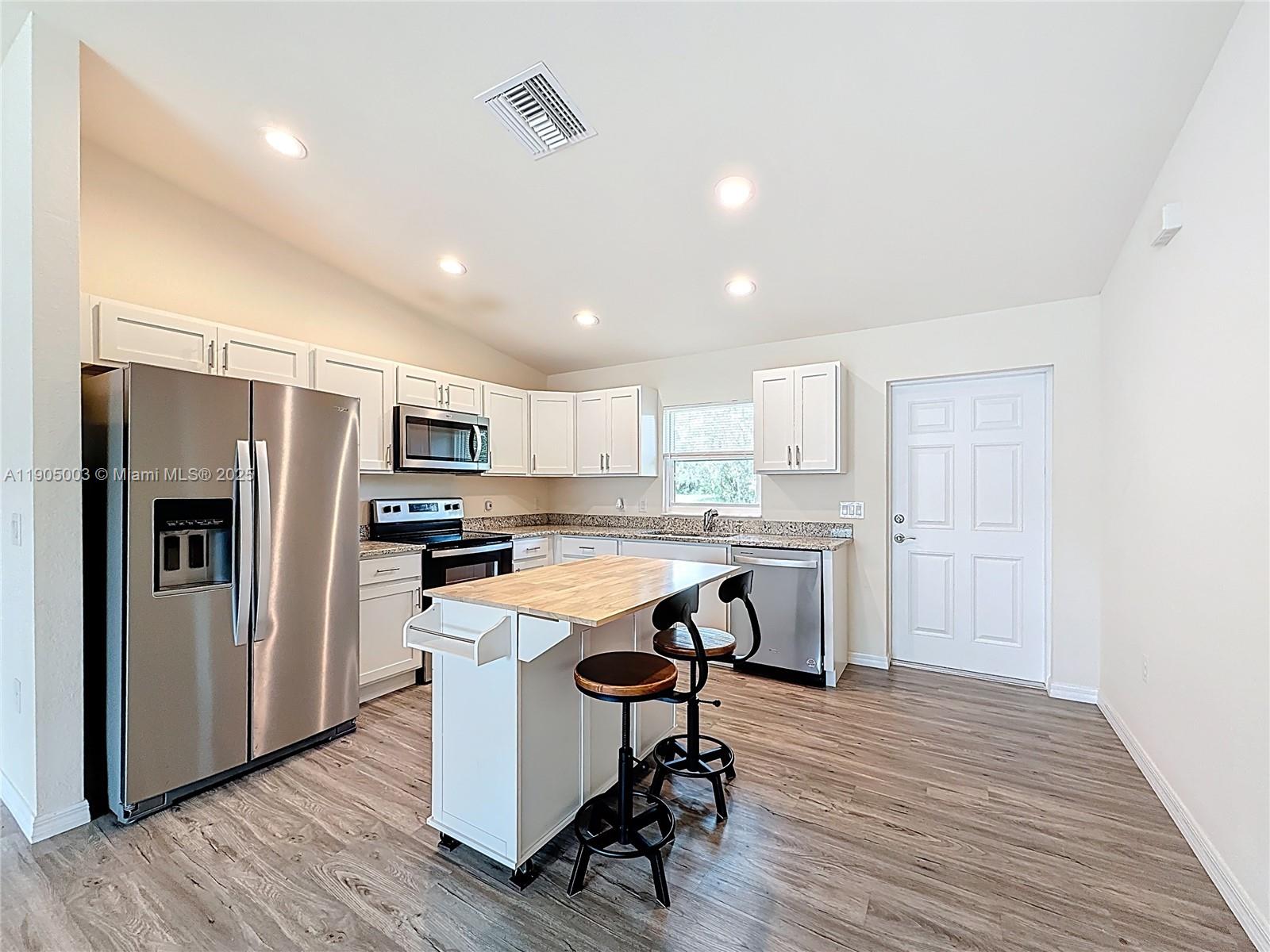 LIKE NEW CONCRETE HOME ON QUIET CUL-DE-SAC STREET! Built in 2022, this attractive concrete block home is nestled on a peaceful dead-end cul-de-sac street, surrounded by newer and well-maintained homes. The property backs up to a scenic greenbelt, affording the owner privacy and the assurance that no homes will be built behind you. Inside the residence features an open-concept layout, combining the living, dining, and kitchen areas, creating a welcoming and spacious feel. The kitchen showcases granite countertops, upgraded appliances, and a versatile moveable island that can be adjusted for your preferred usage. The split bedroom floor plan provides privacy for the primary suite, while luxury waterproof vinyl flooring extends throughout the home for style and easy care.