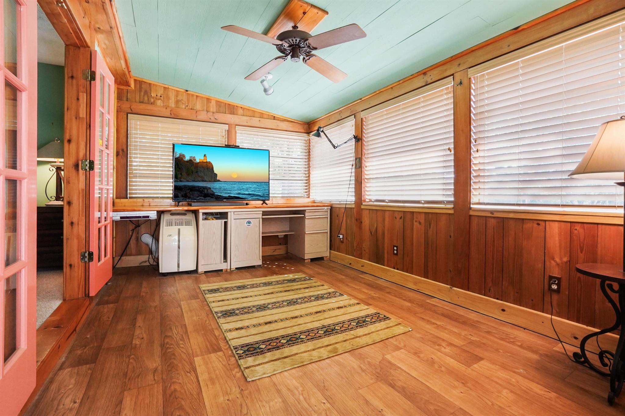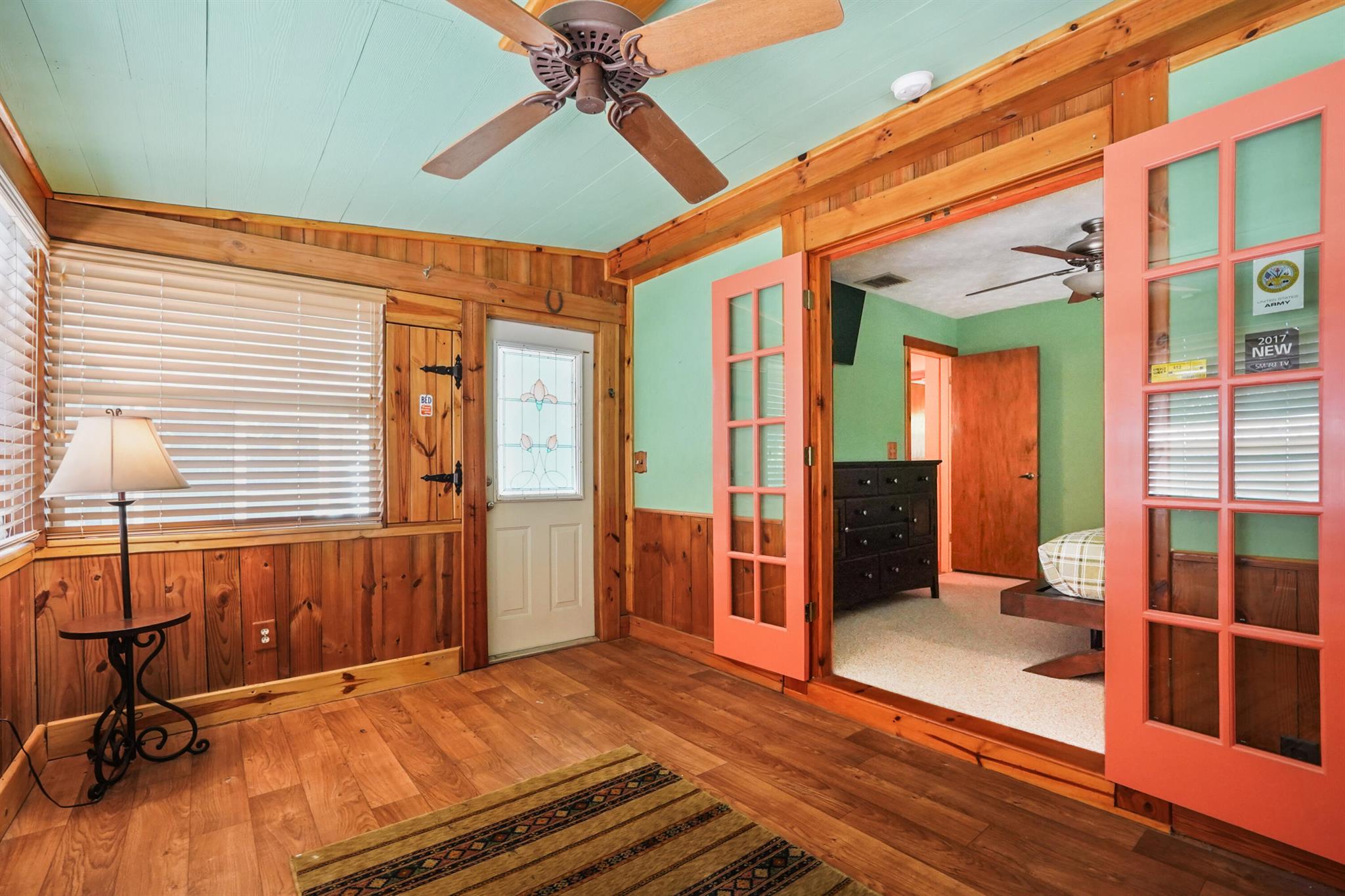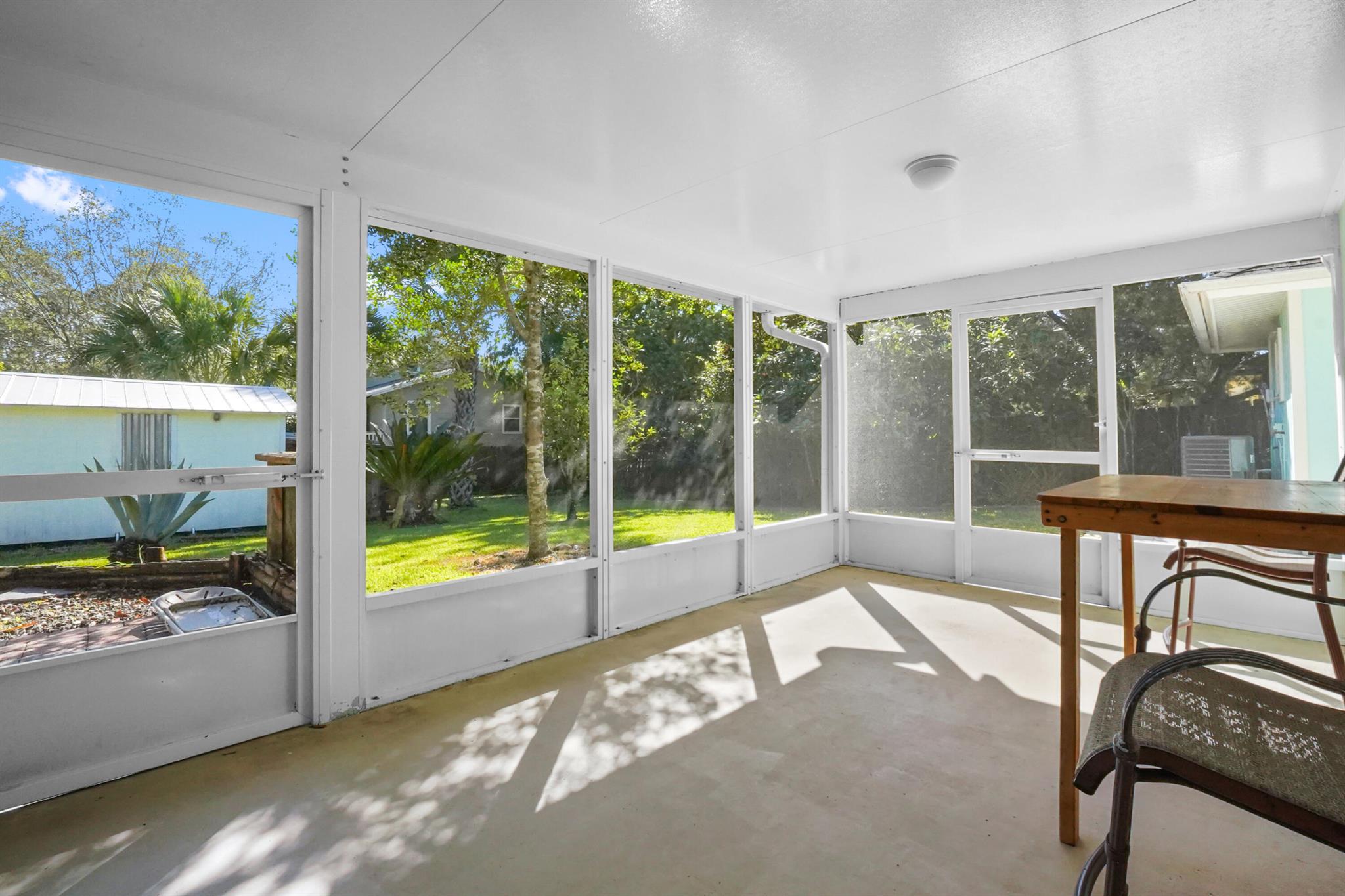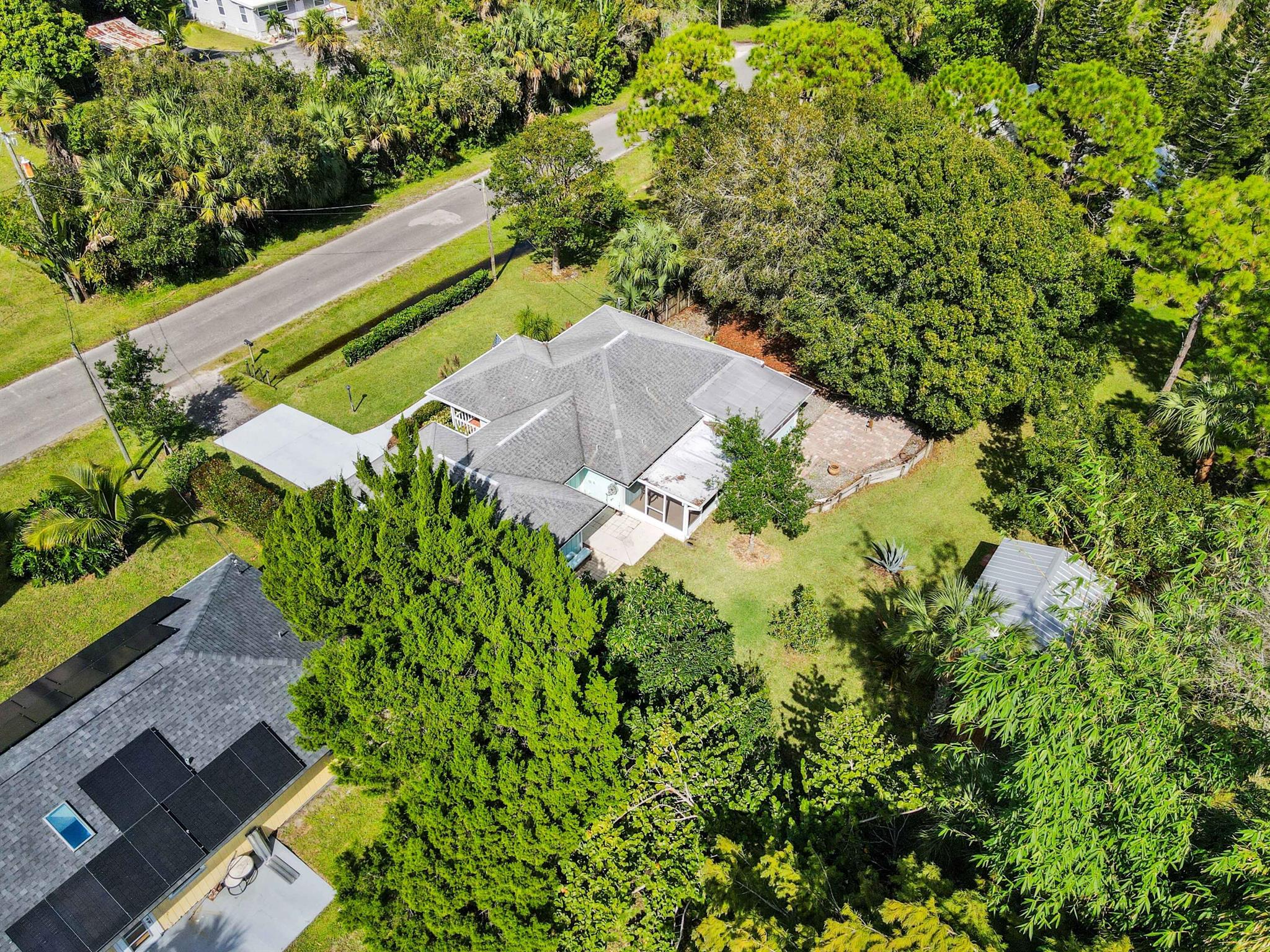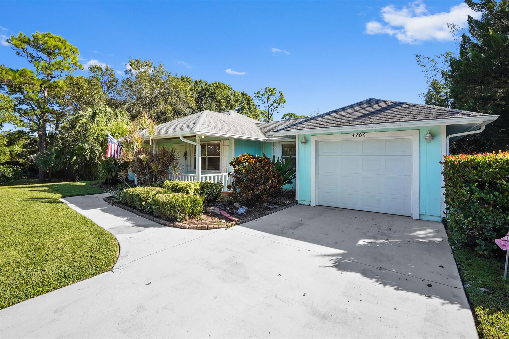 Welcome to this charming and distinctive single-family home, perfectly situated on a beautiful large double waterfront lot in Fort Pierce. The residence immediately captivates with its quintessential Florida style, featuring a soft light blue-green exterior and a welcoming covered front porch with a tongue-and-groove wood ceiling and brick-toned tile floor. Lush tropical landscaping surrounds the home, creating an atmosphere of privacy and tranquility, while a freshly poured driveway offers excellent curb appeal and parking space.