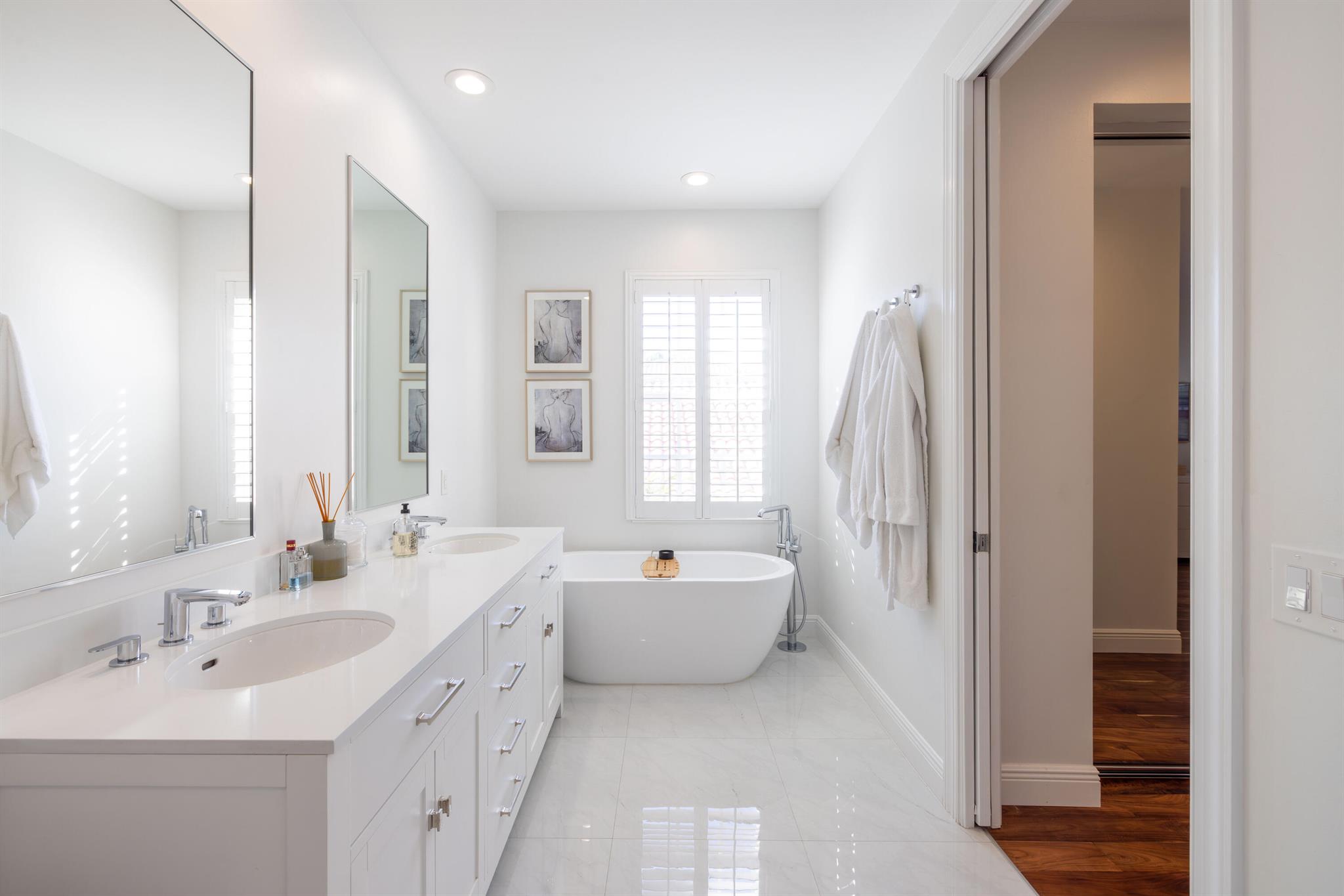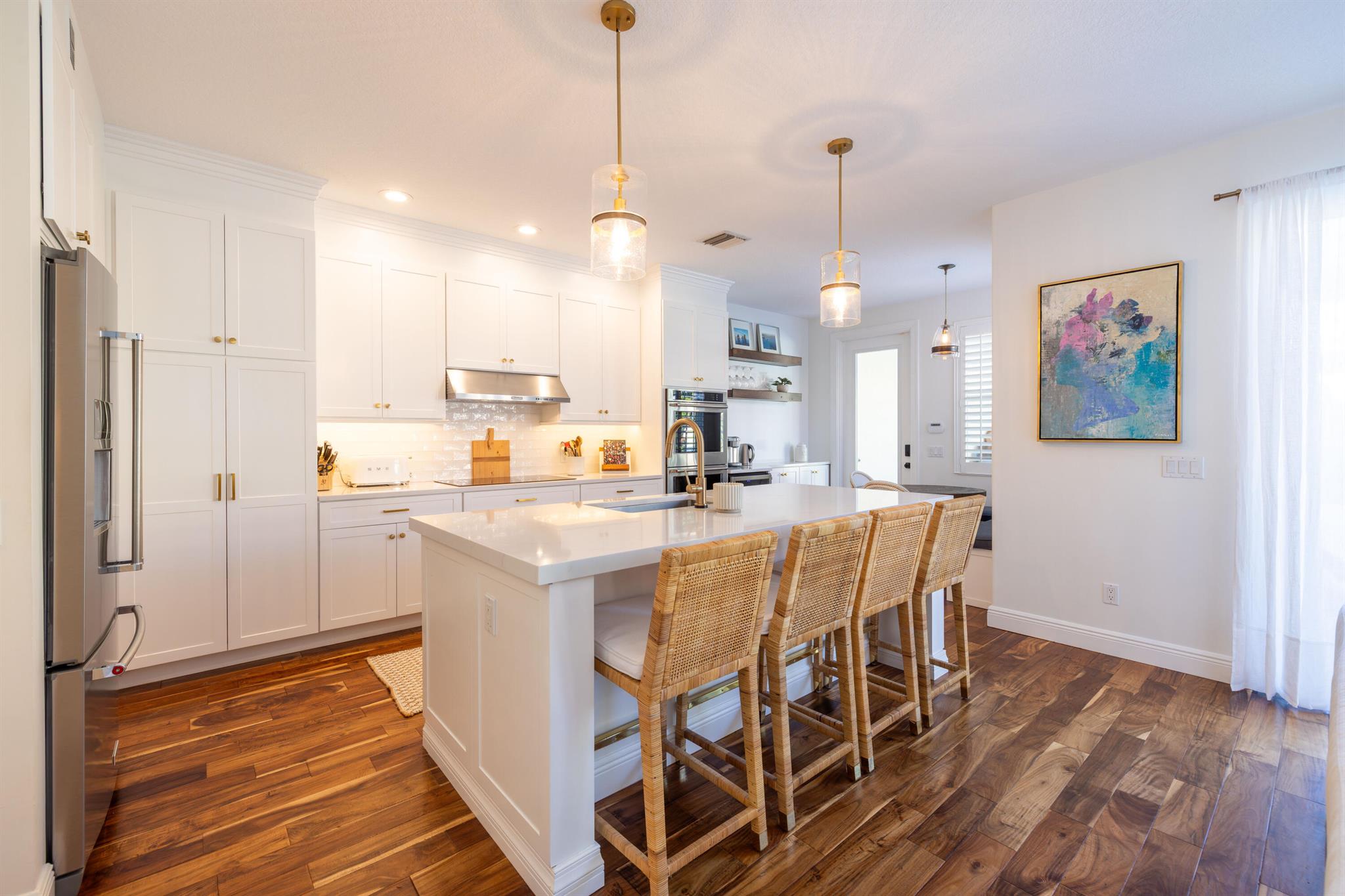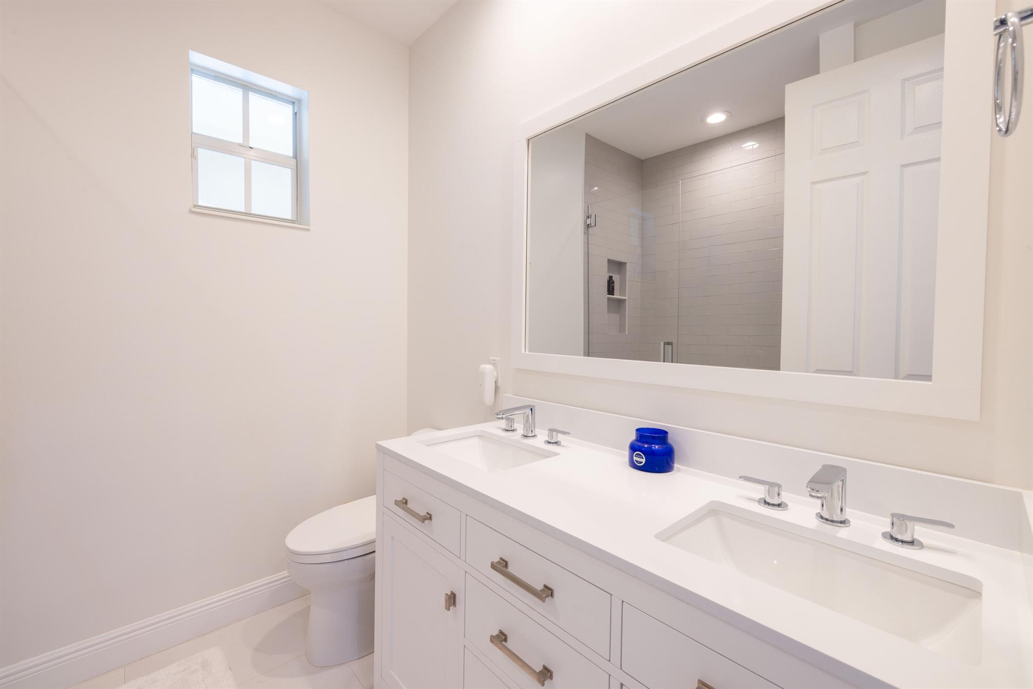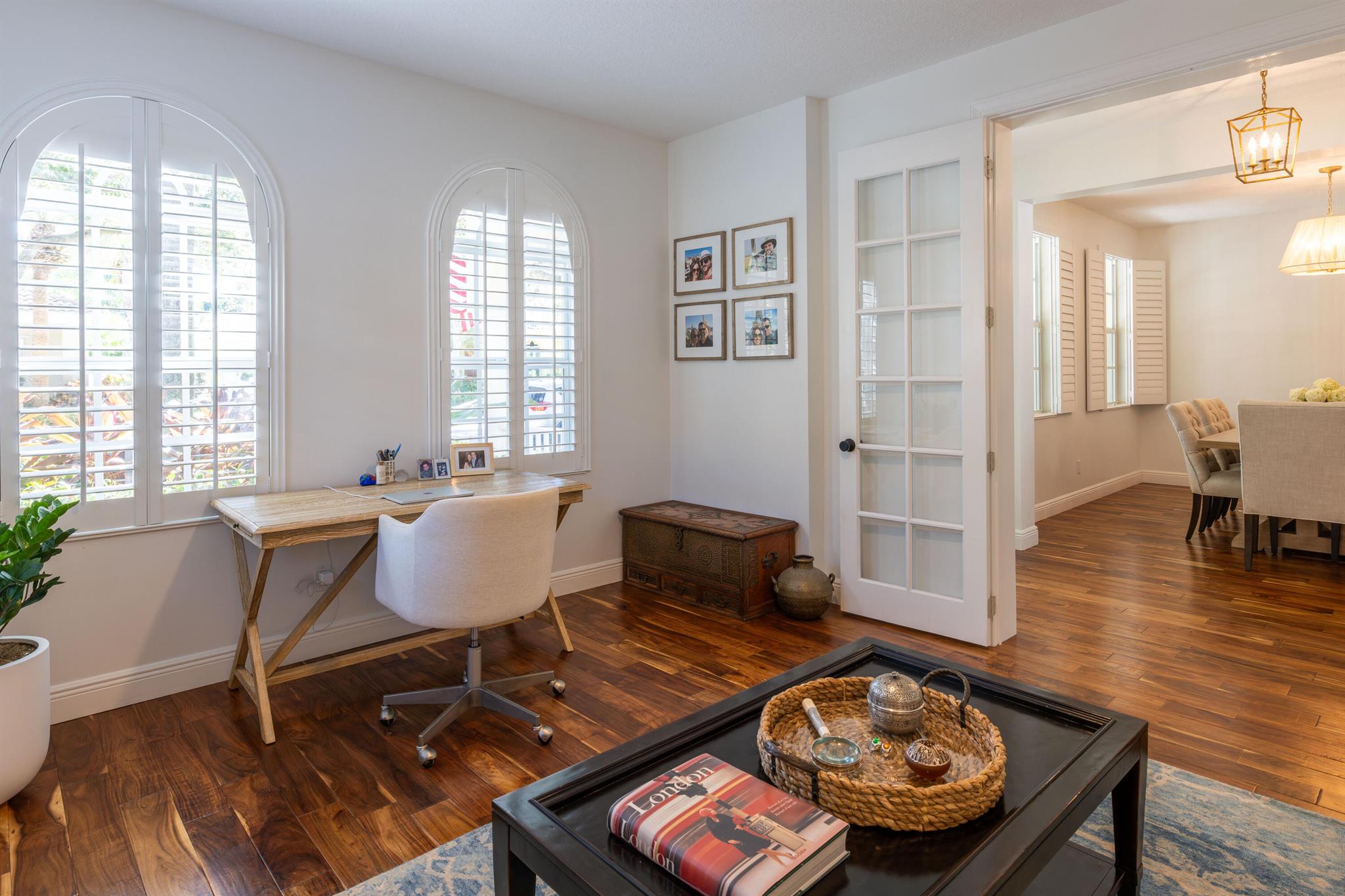 This stunning renovated 4-bedroom, 3-bathroom residence with a dedicated office seamlessly blends sophistication, comfort, and functionality. The chef's kitchen is a true centerpiece, featuring custom wood cabinetry with detailed moldings, under-cabinet lighting, quartz countertops, double oven, microwave drawer, and a distinctive butler's pantry for added storage and style. The primary suite offers a spa-inspired bathroom with large-format porcelain tile, a freestanding soaking tub, a Restoration Hardware vanity, a Toto toilet, and sleek Grohe fixtures. Step outside to your private, fenced oasis; a beautifully designed backyard with a sparkling pool, integrated spa, and elegant leathered travertine decking surrounded by gorgeous tropical landscaping which offers both beauty and privacy.