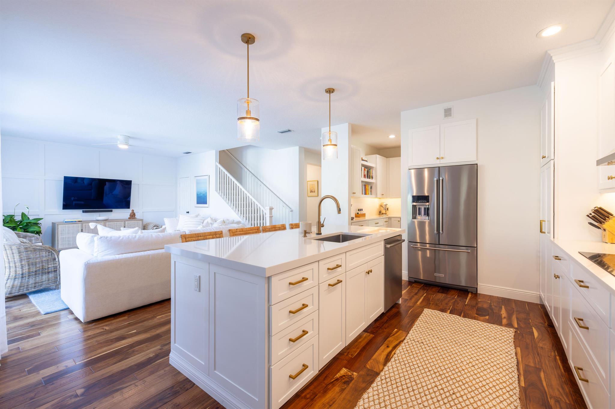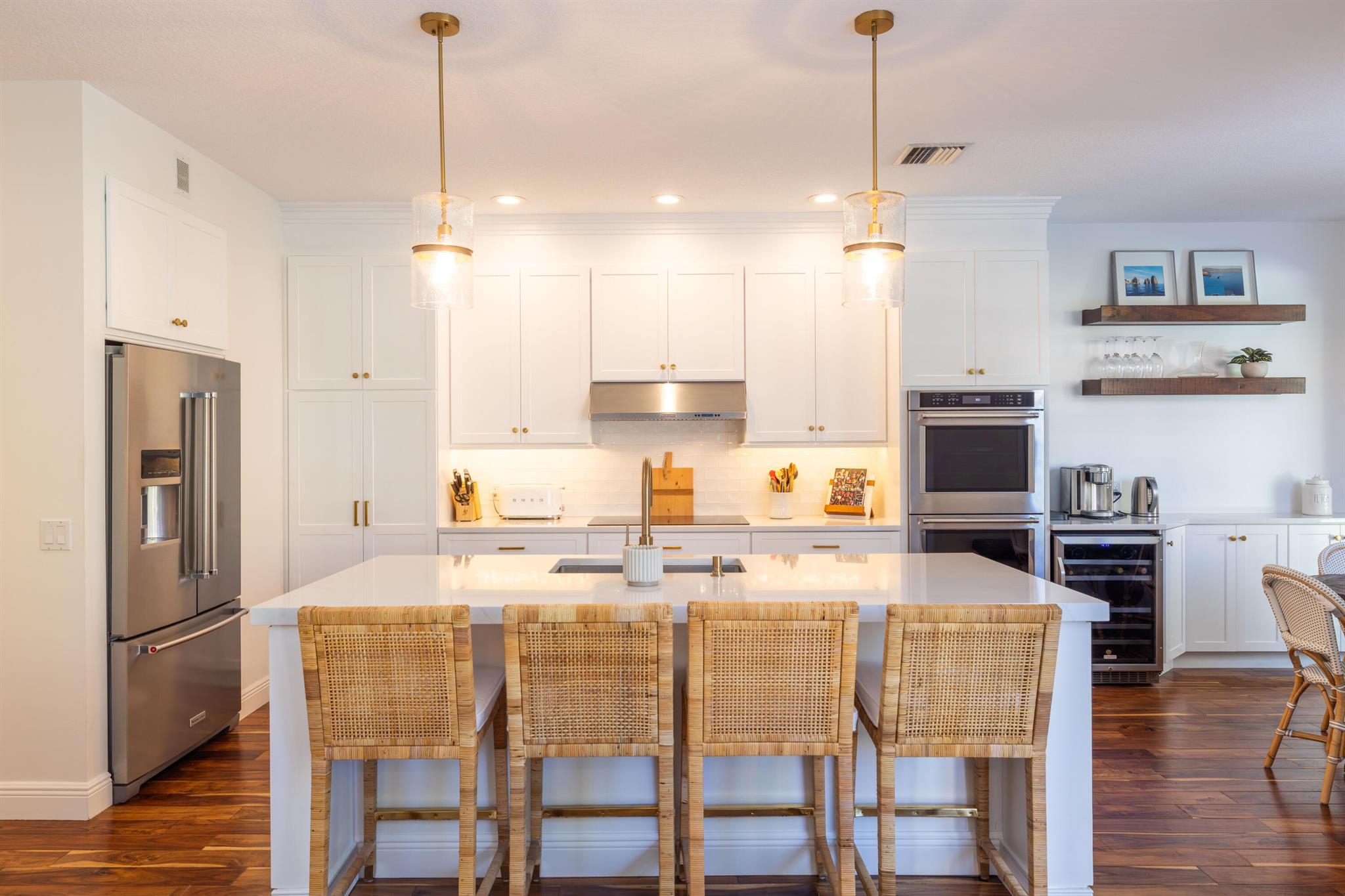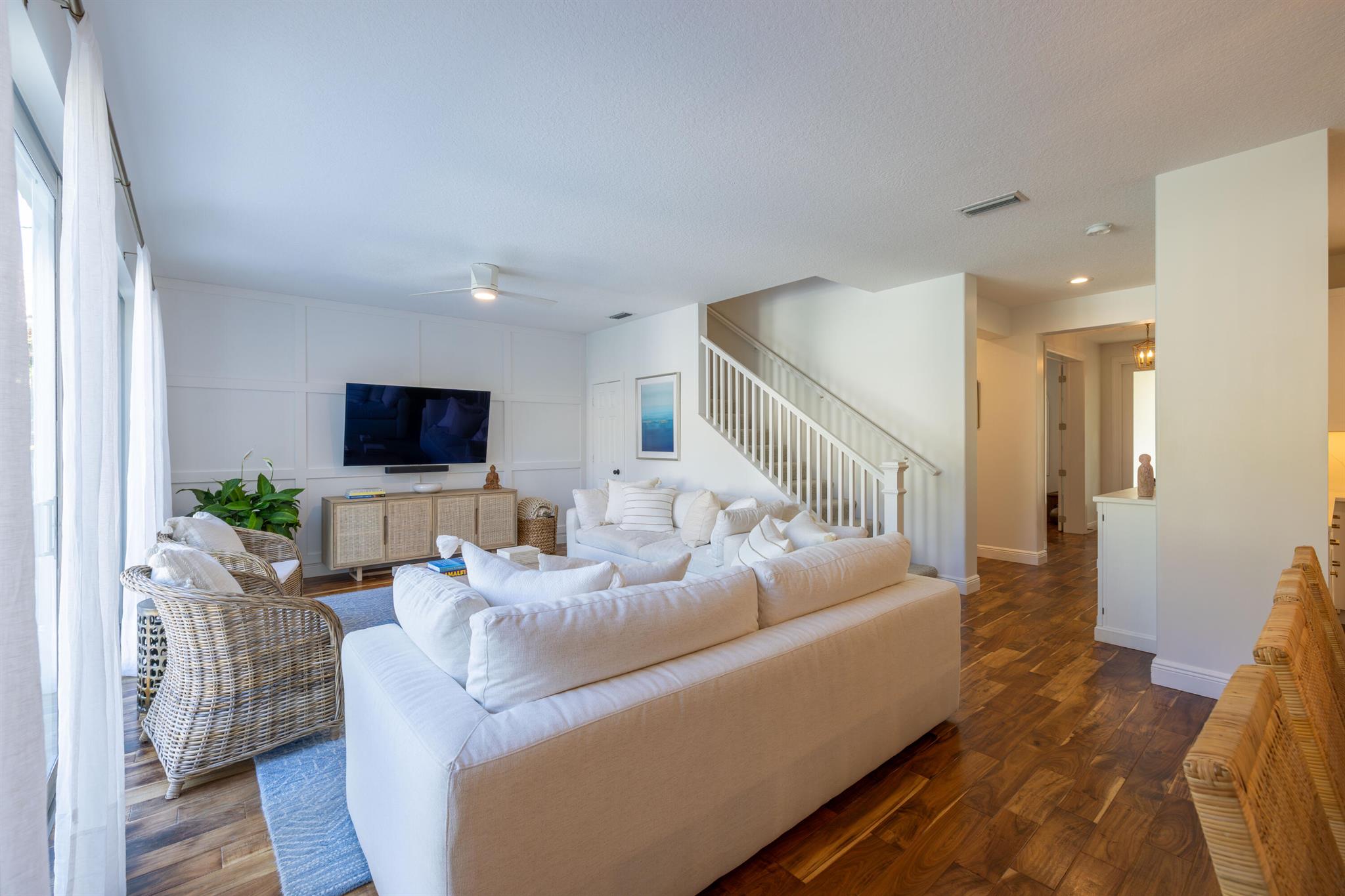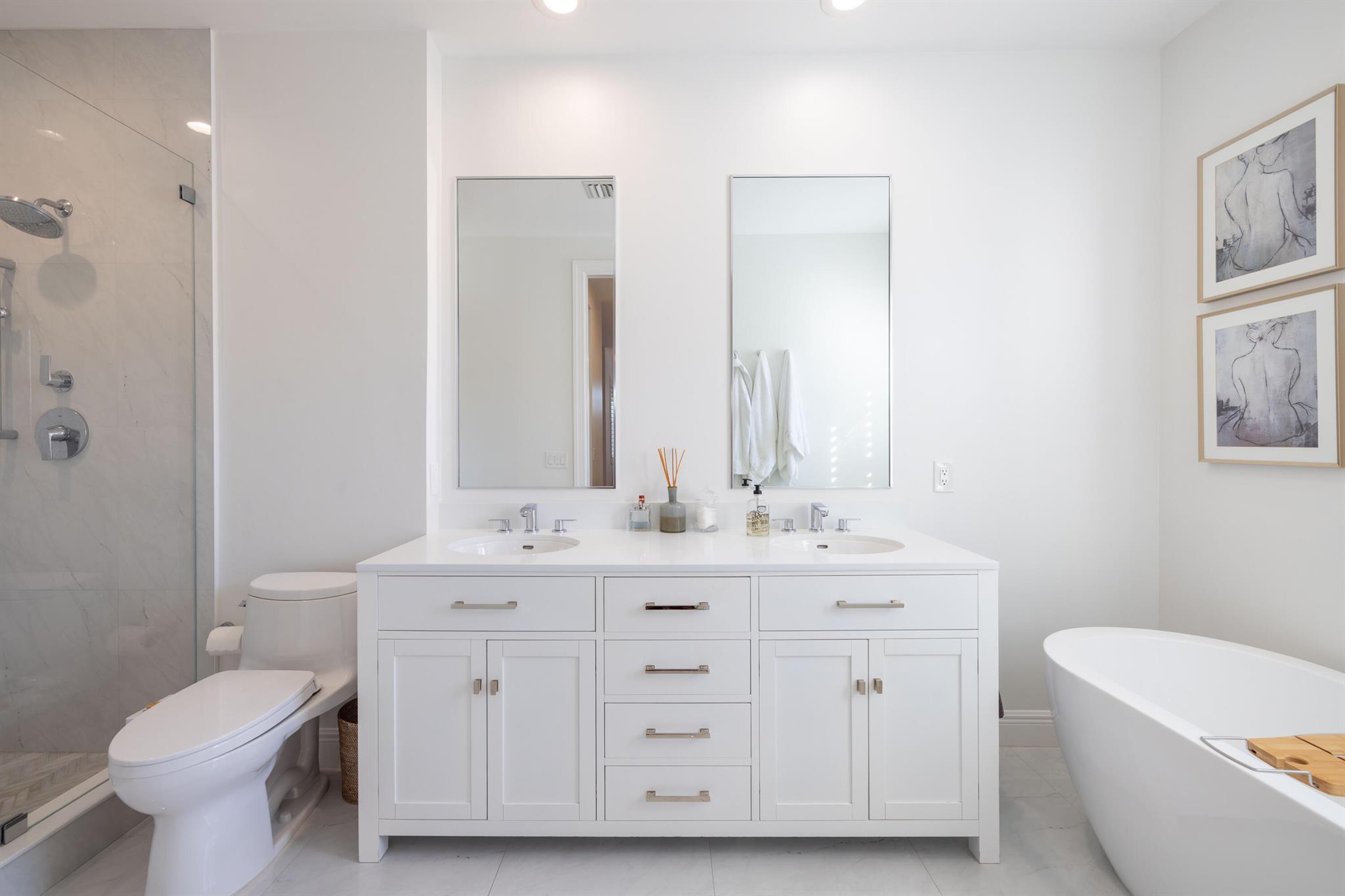 This stunning renovated 4-bedroom, 3-bathroom residence with a dedicated office seamlessly blends sophistication, comfort, and functionality. The chef's kitchen is a true centerpiece, featuring custom wood cabinetry with detailed moldings, under-cabinet lighting, quartz countertops, double oven, microwave drawer, and a distinctive butler's pantry for added storage and style. The primary suite offers a spa-inspired bathroom with large-format porcelain tile, a freestanding soaking tub, a Restoration Hardware vanity, a Toto toilet, and sleek Grohe fixtures. Step outside to your private, fenced oasis; a beautifully designed backyard with a sparkling pool, integrated spa, and elegant leathered travertine decking surrounded by gorgeous tropical landscaping which offers both beauty and privacy.