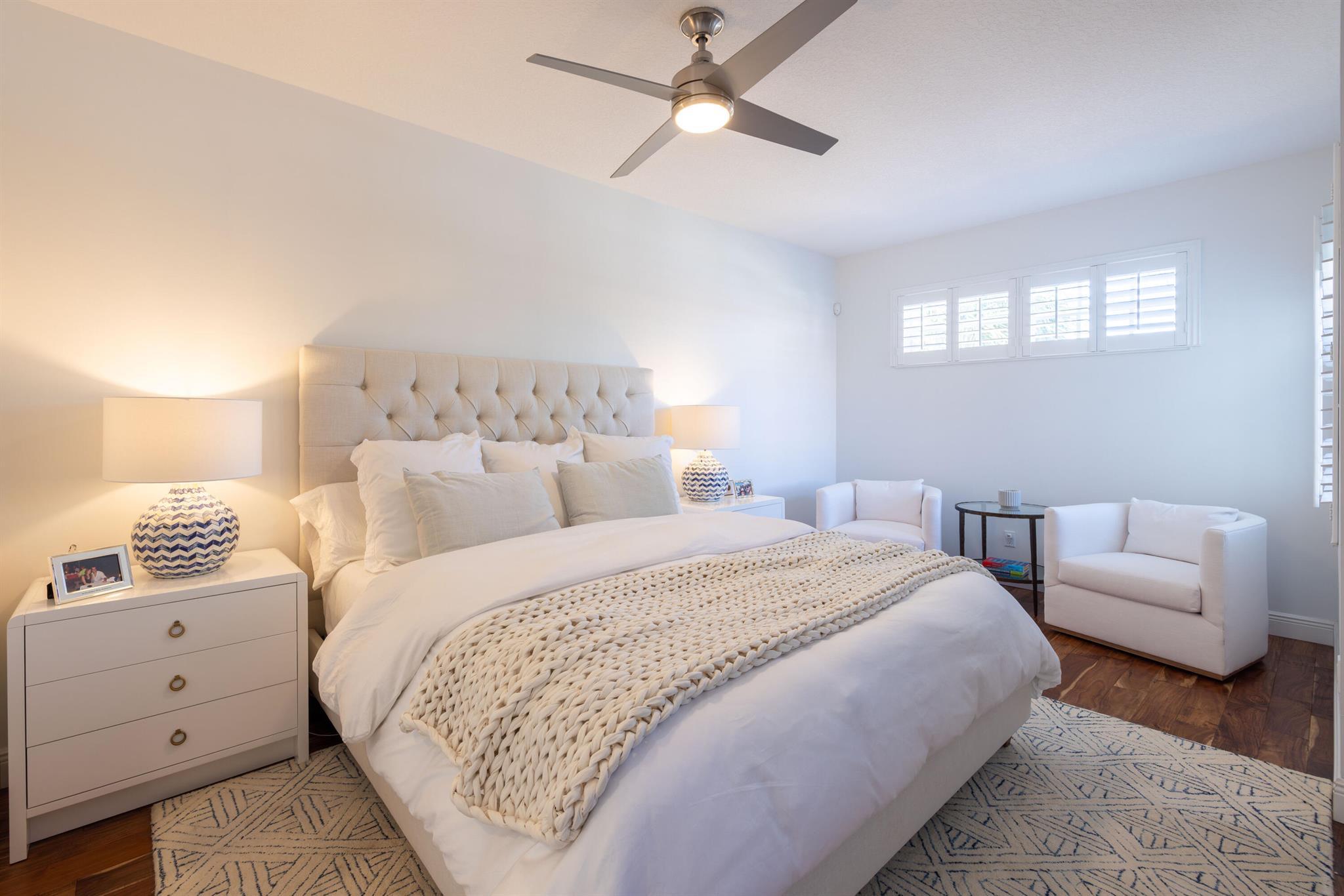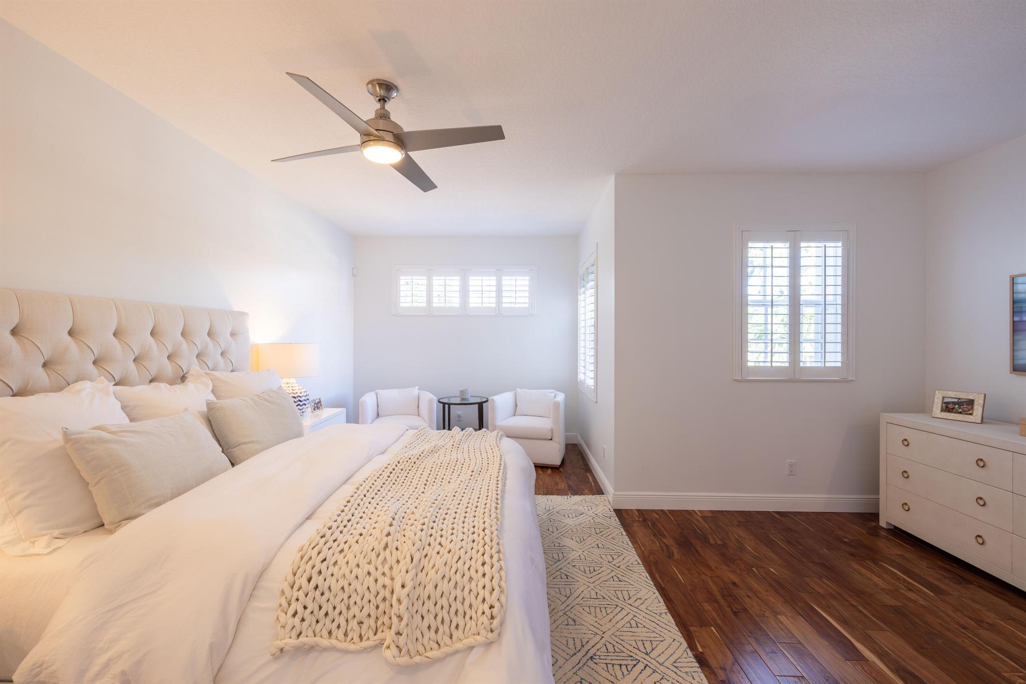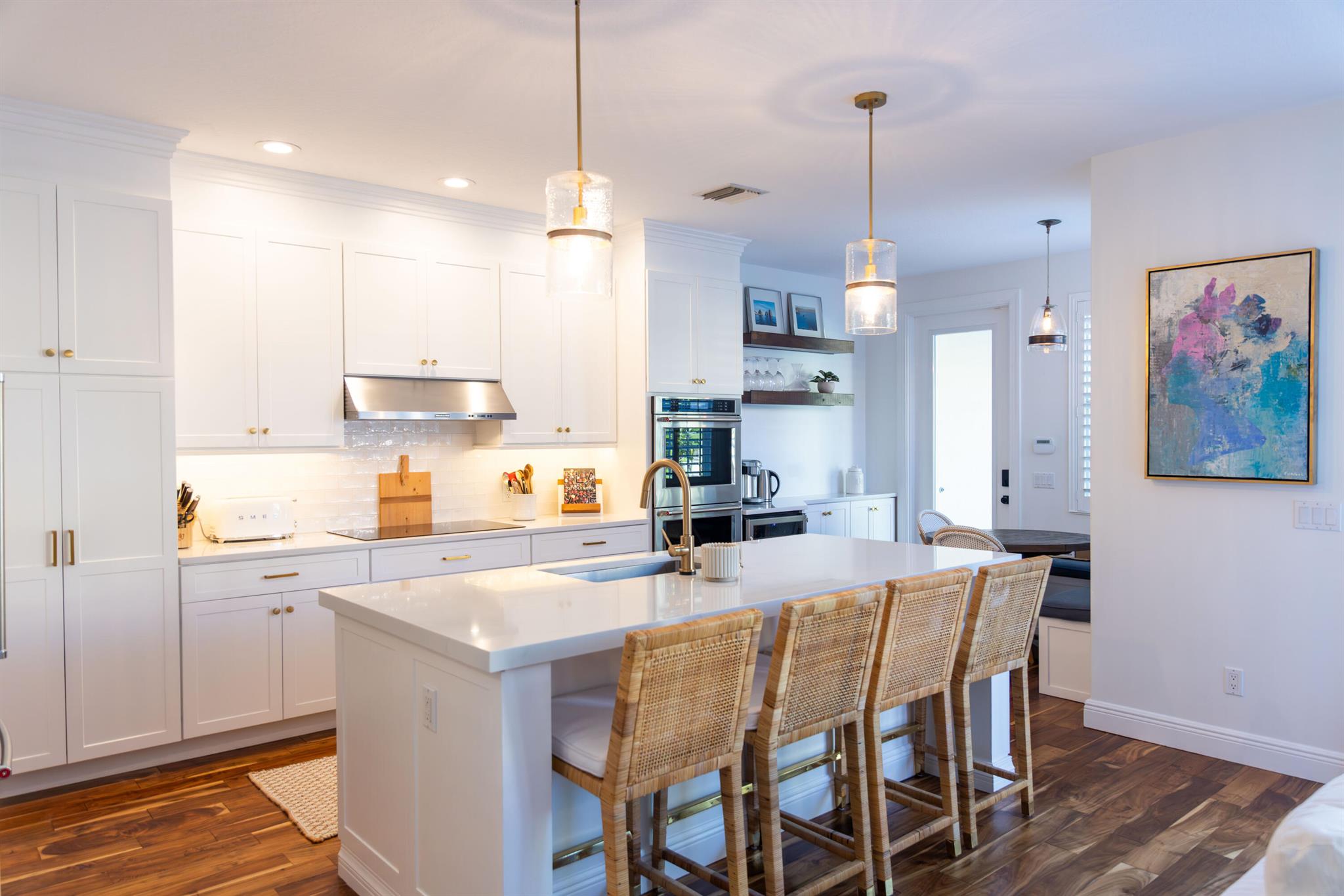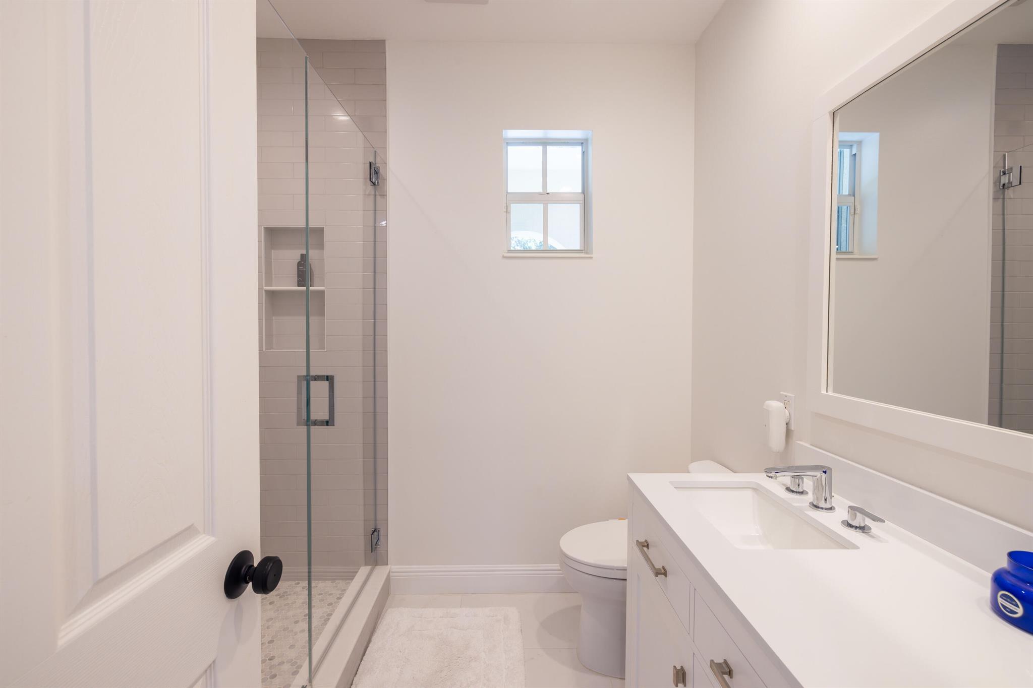 This stunning renovated 4-bedroom, 3-bathroom residence with a dedicated office seamlessly blends sophistication, comfort, and functionality. The chef's kitchen is a true centerpiece, featuring custom wood cabinetry with detailed moldings, under-cabinet lighting, quartz countertops, double oven, microwave drawer, and a distinctive butler's pantry for added storage and style. The primary suite offers a spa-inspired bathroom with large-format porcelain tile, a freestanding soaking tub, a Restoration Hardware vanity, a Toto toilet, and sleek Grohe fixtures. Step outside to your private, fenced oasis; a beautifully designed backyard with a sparkling pool, integrated spa, and elegant leathered travertine decking surrounded by gorgeous tropical landscaping which offers both beauty and privacy.