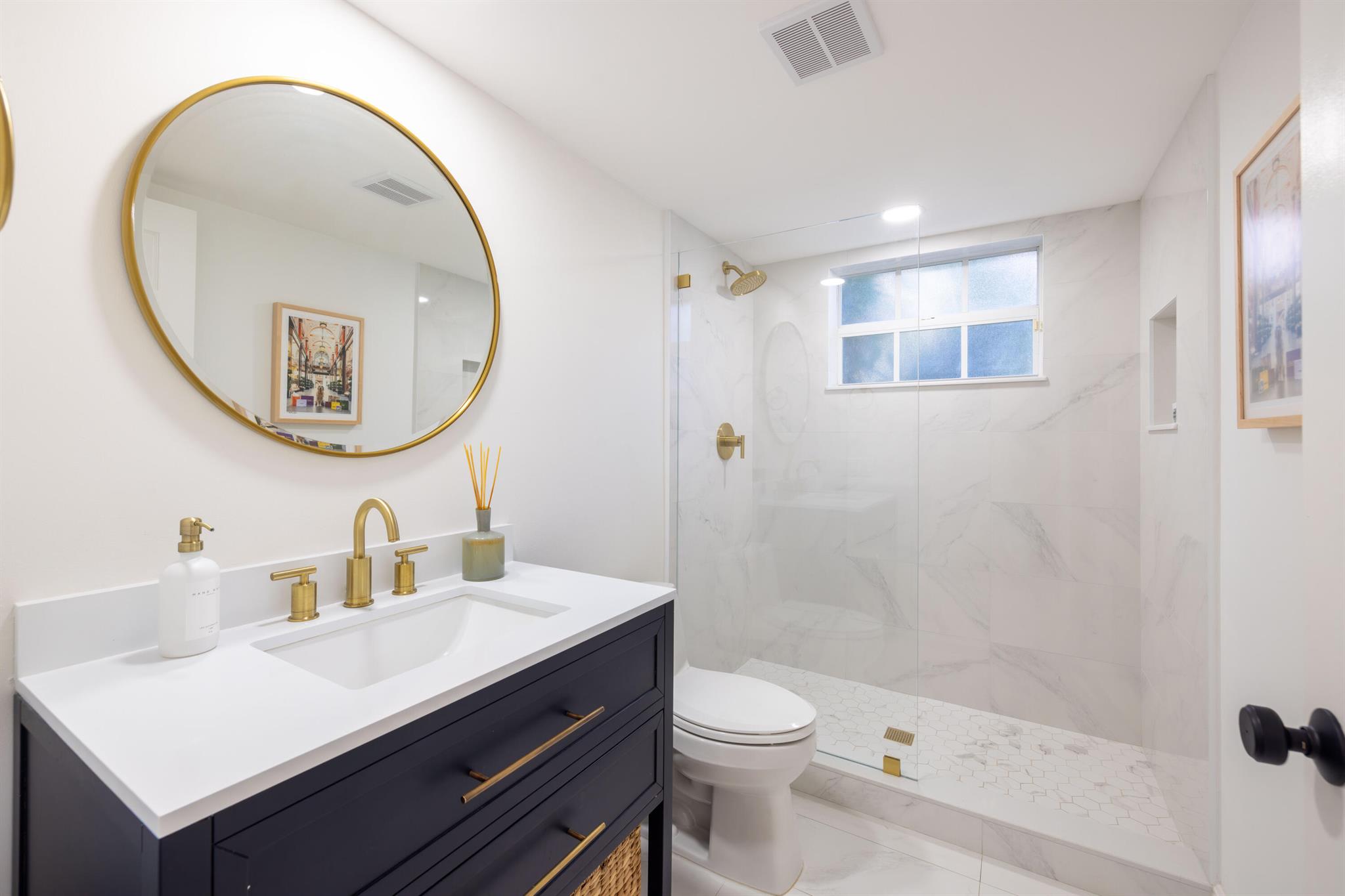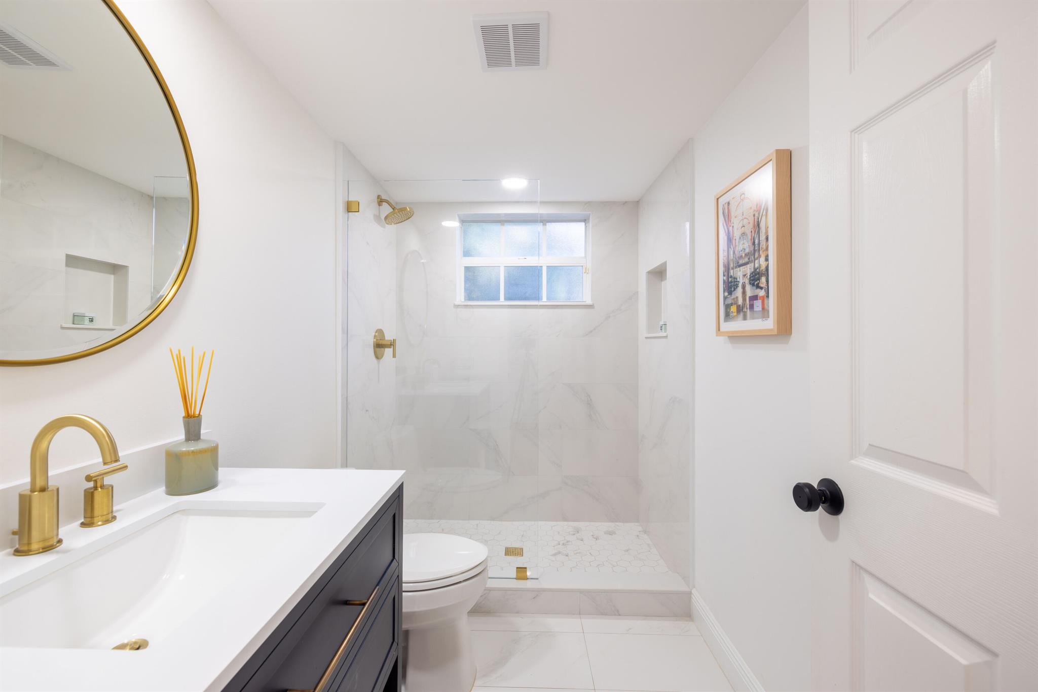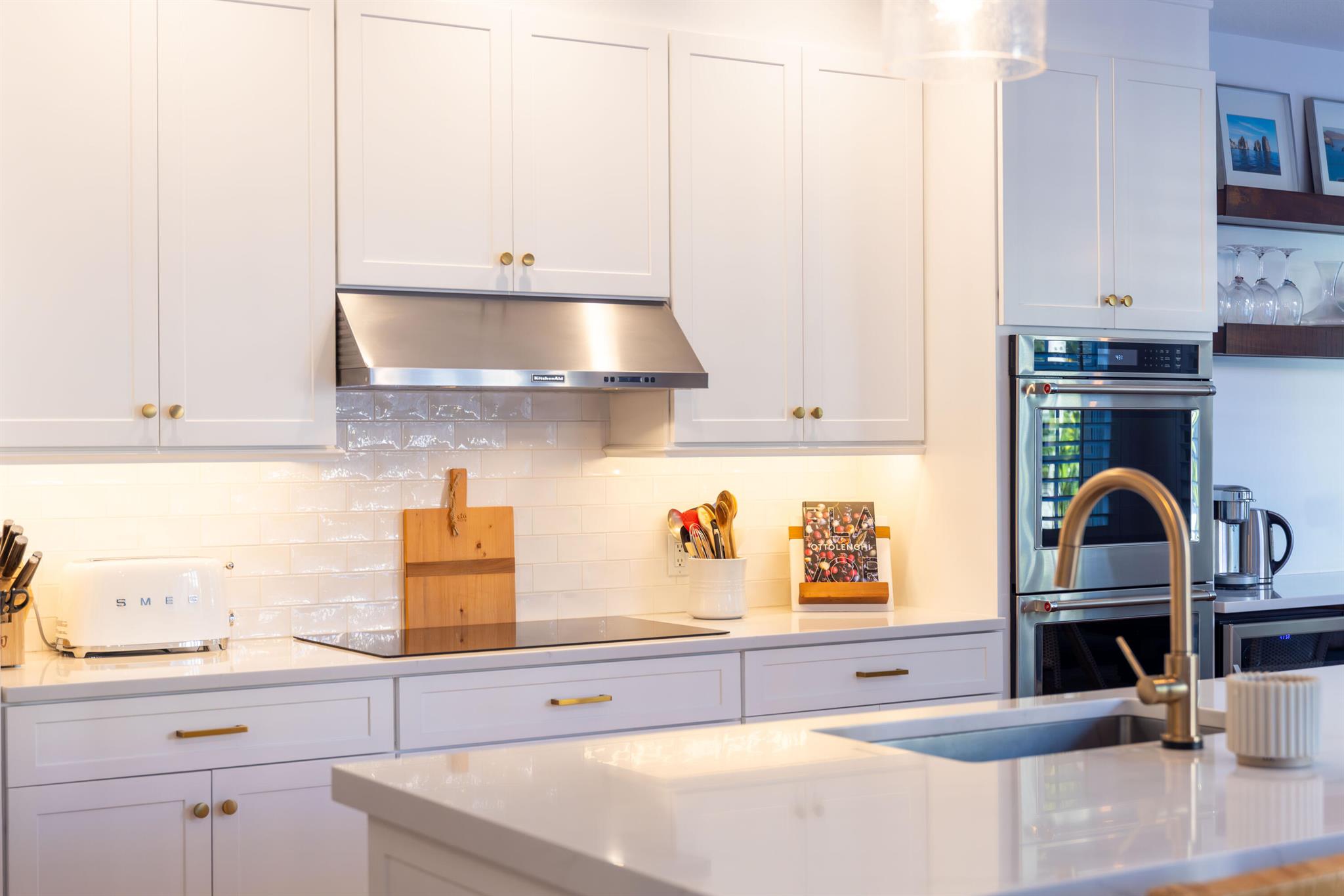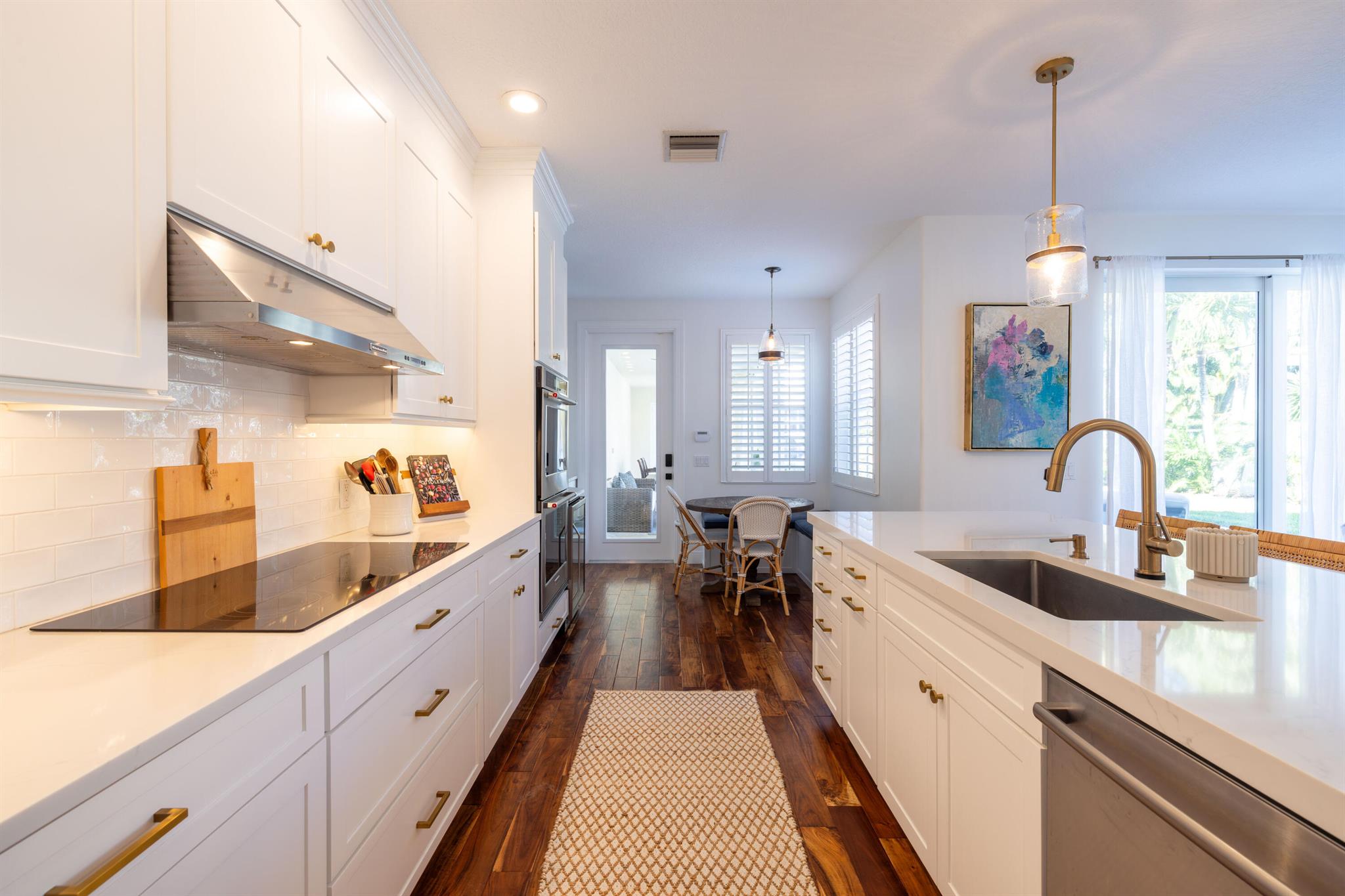 This stunning renovated 4-bedroom, 3-bathroom residence with a dedicated office seamlessly blends sophistication, comfort, and functionality. The chef's kitchen is a true centerpiece, featuring custom wood cabinetry with detailed moldings, under-cabinet lighting, quartz countertops, double oven, microwave drawer, and a distinctive butler's pantry for added storage and style. The primary suite offers a spa-inspired bathroom with large-format porcelain tile, a freestanding soaking tub, a Restoration Hardware vanity, a Toto toilet, and sleek Grohe fixtures. Step outside to your private, fenced oasis; a beautifully designed backyard with a sparkling pool, integrated spa, and elegant leathered travertine decking surrounded by gorgeous tropical landscaping which offers both beauty and privacy.