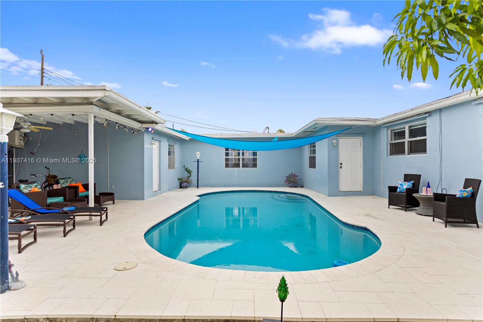 Discover the allure of one of Hollywood Hills' most beautifully maintained streets with this home. Spanning over 2,500 sqft, offers a thoughtfully designed living space perfect for comfort and entertaining. Step into the private, gated backyard oasis, featuring a stunning pool ideal for relaxation and gatherings. Inside, you'll find 4 spacious bedrooms and 3 full baths, including 2 master suites—one tailored as a cozy in-law suite. The family room boasts a fireplace and connects to a den that can easily convert into a 5th bedroom. Additional highlights include a laundry room and charming front porch overlooking a circular driveway with ample parking, plus a service alley behind the home. Recent upgrades, including a new roof, provide peace of mind in this meticulously maintained residence.