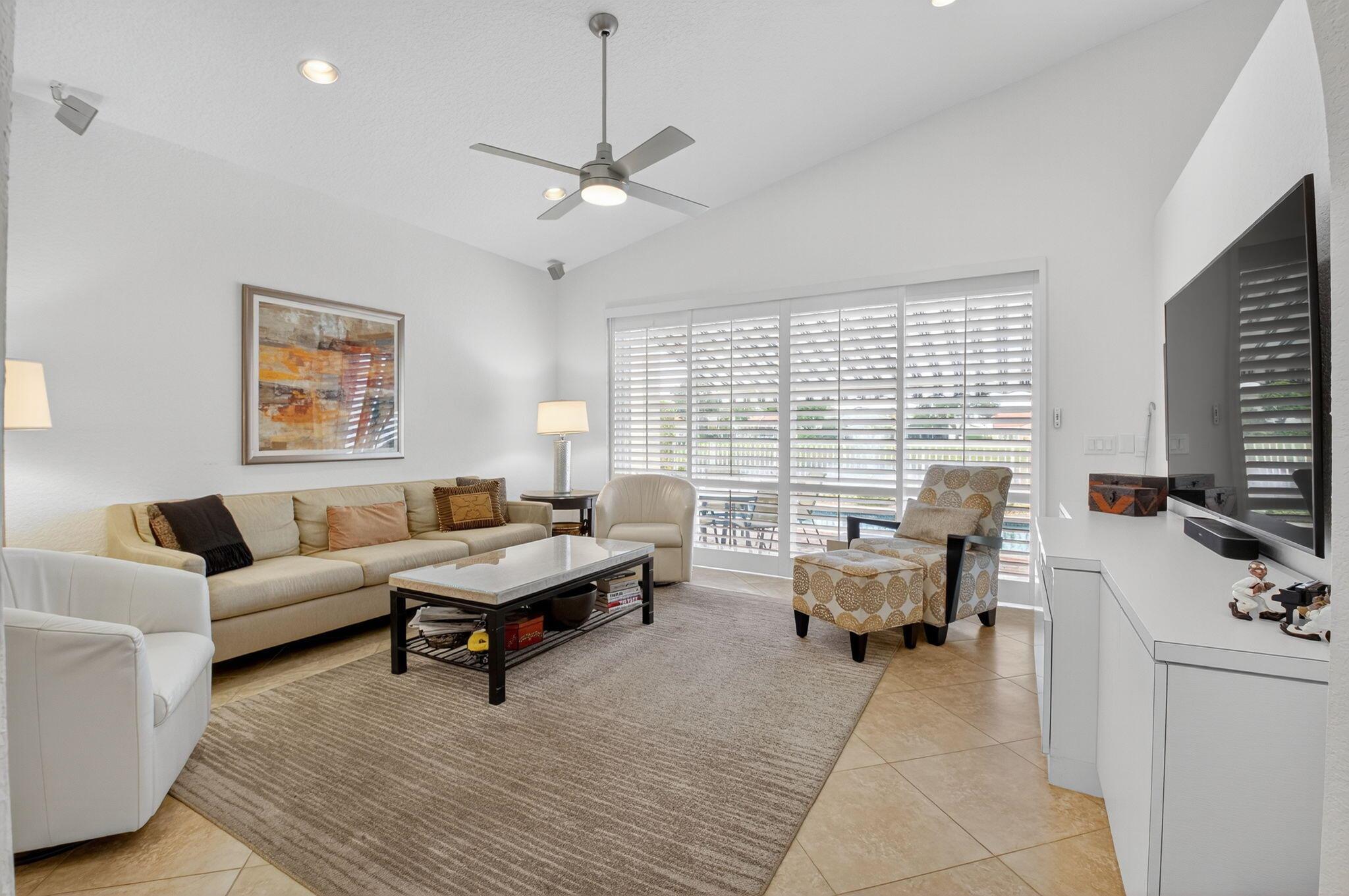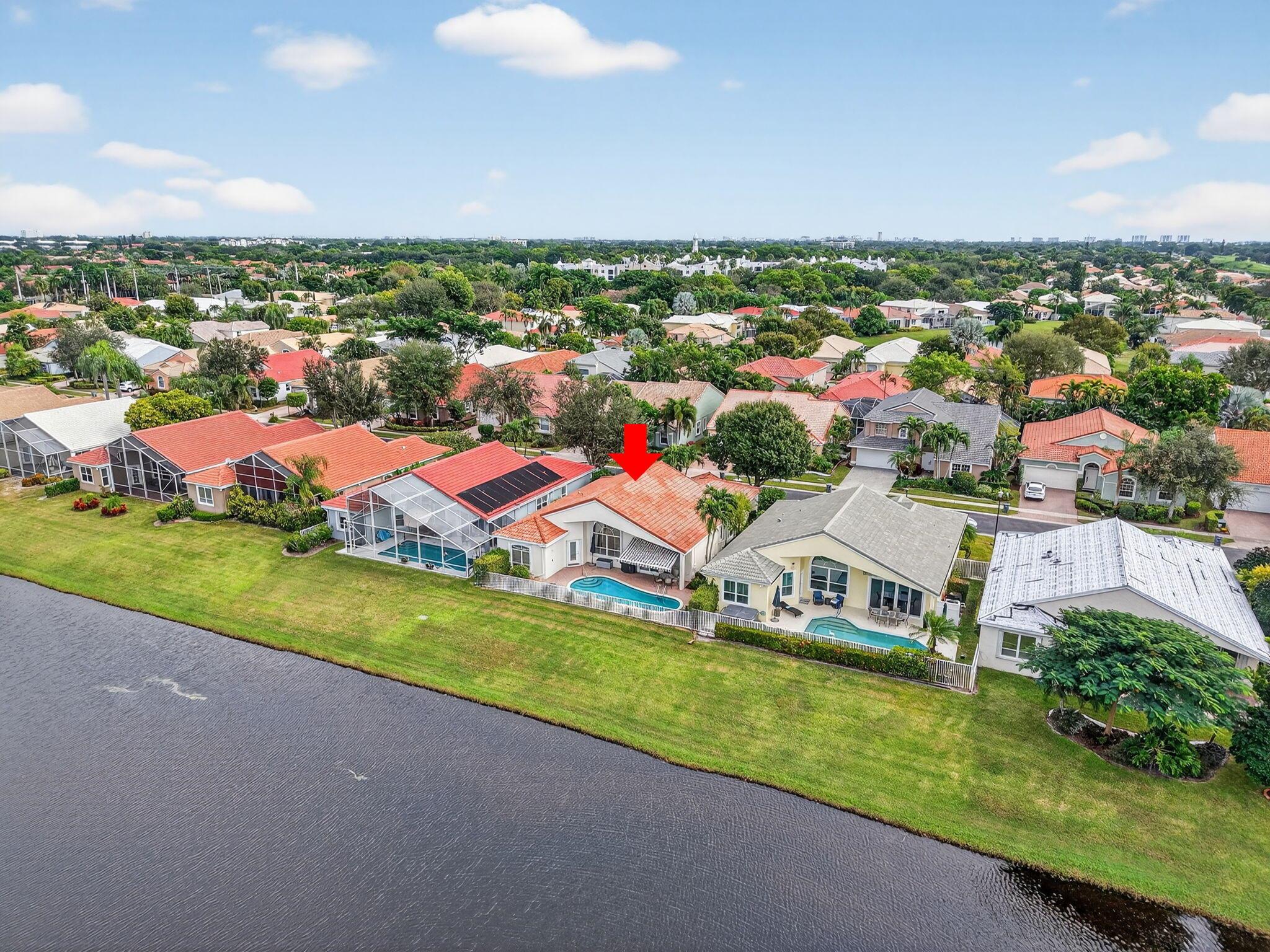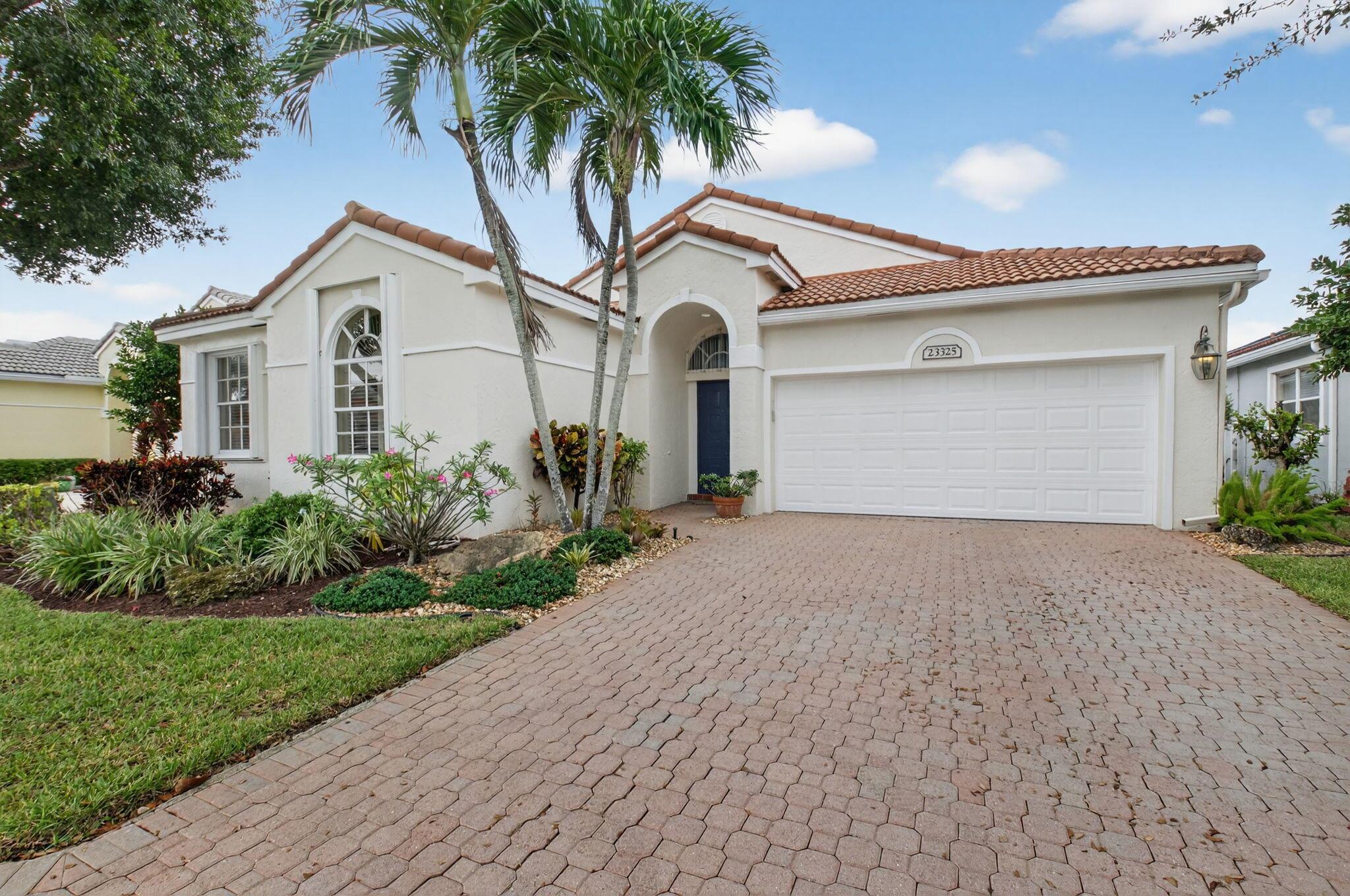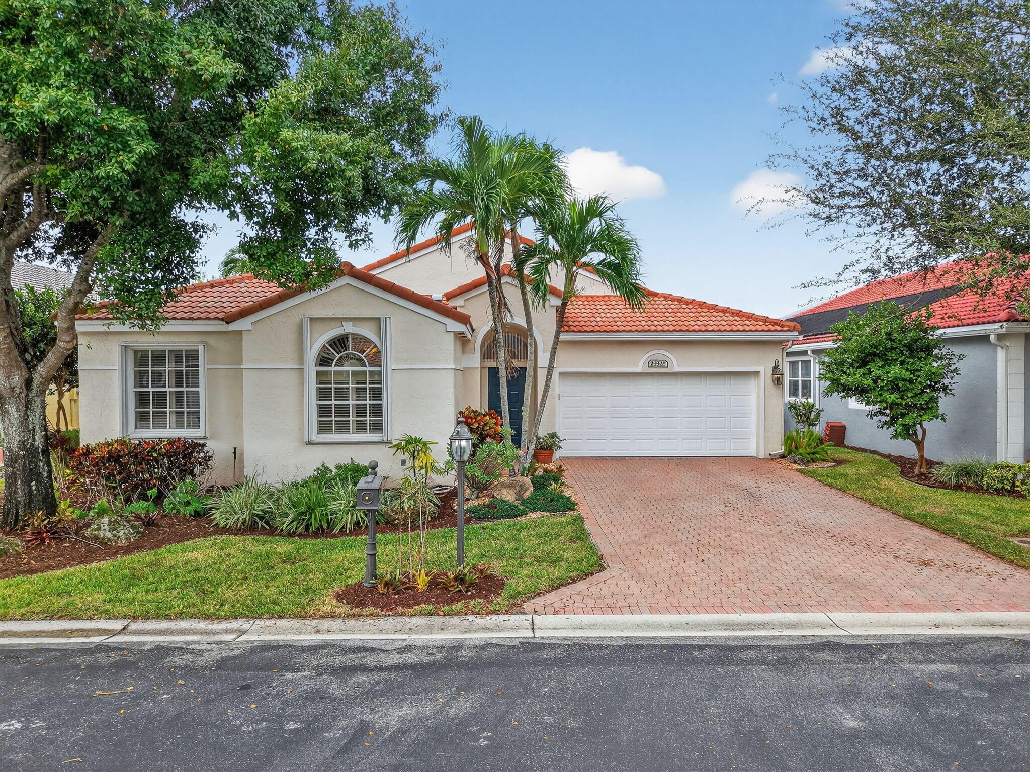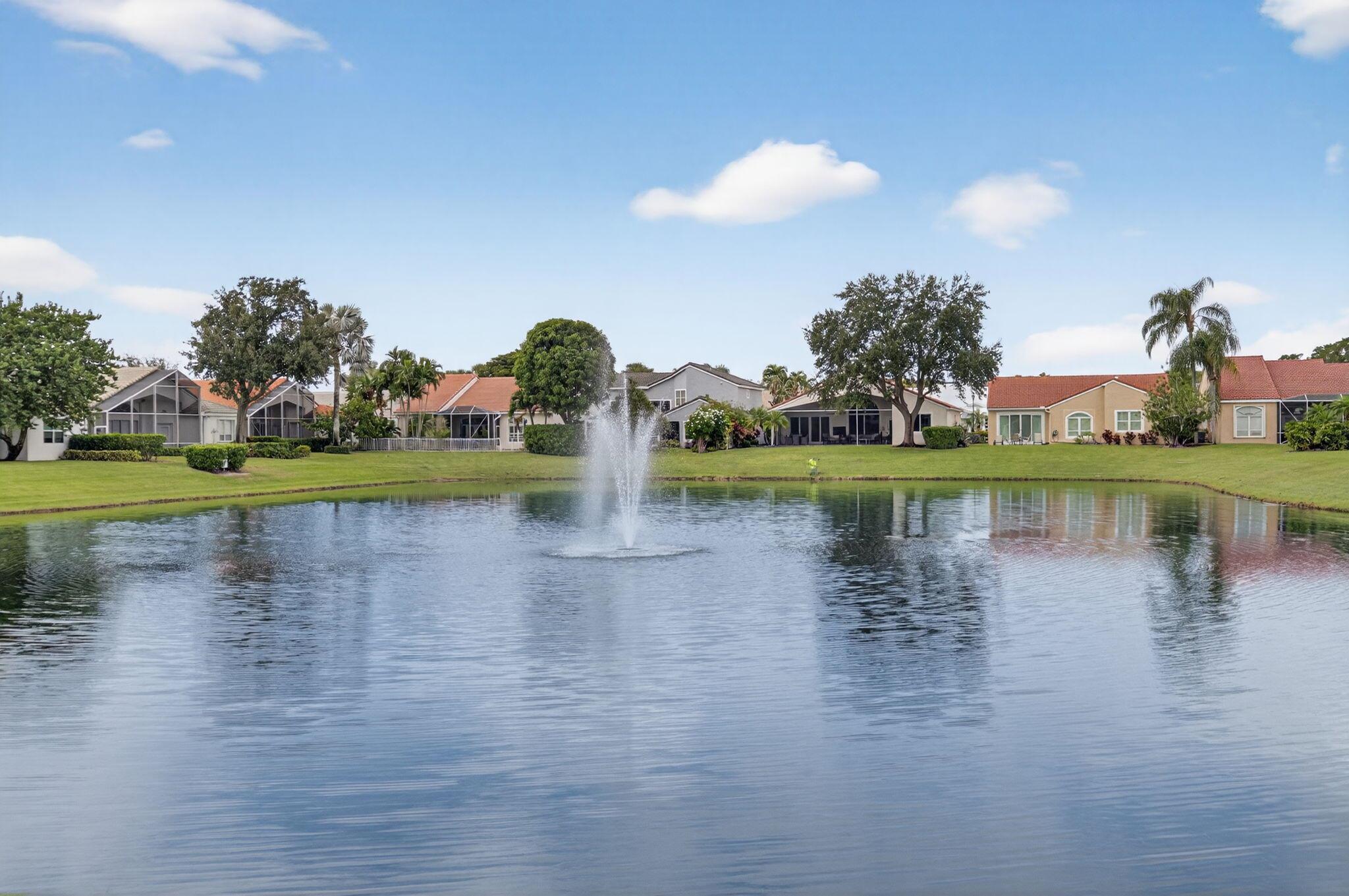Enjoy the incredible sunset views overlooking the expansive lake & fountain from your own tropical paradise. The patio area has an electric awning which makes it so enjoyable on those bright days. Spotless and meticulously maintained 1-story home with 3 bedrooms & 2.1 baths plus 2-car garage. Ceramic tile and engineered wood flooring. Plantation shutters throughout. The kitchen has real wood cabinetry, granite counters & a full granite backsplash. The master bedroom features fully outfitted closets & en suite bath with dual sinks. New central vacuum system & new washer & dryer. Hurricane resistant garage door & accordion shutters.