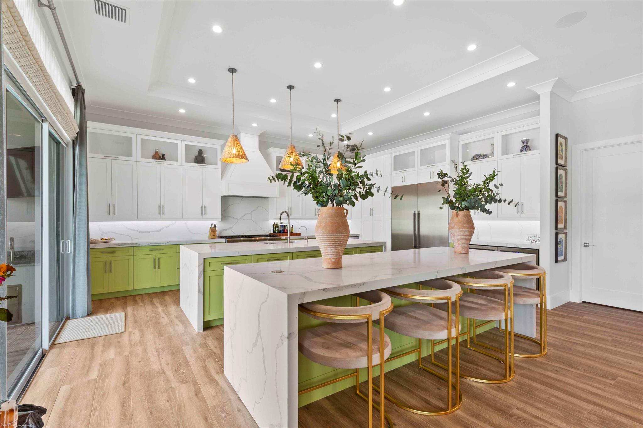 Built new in 2020, this fabulous Palm Beach Gardens Modern Island Smart Home boasts 5 bedrooms and 5.5 baths and over 7900 of total sq ft! The open floor plan includes a Gourmet Chef's kitchen with 2 large islands and a huge pantry! A wall of French Doors all open to a massive covered and screened patio with a summer kitchen and a beautiful heated infinity pool/spa and 100' of waterfront including a boat dock!The primary suite is stunning with a massive bath and huge closets. All the bedrooms upstairs access a large open balcony to capture the water views or to watch a sunrise or sunset. The home has high ceilings with recessed lighting, Plantation Shutters, an elevator and a whole house generator. It's a boaters paradise yet just minutes away from everything.
